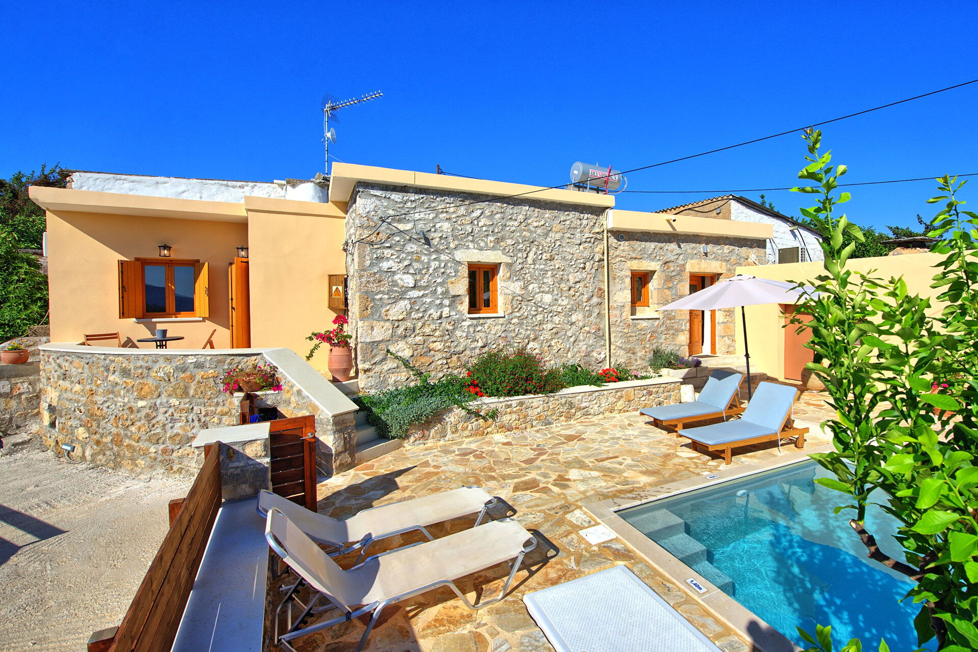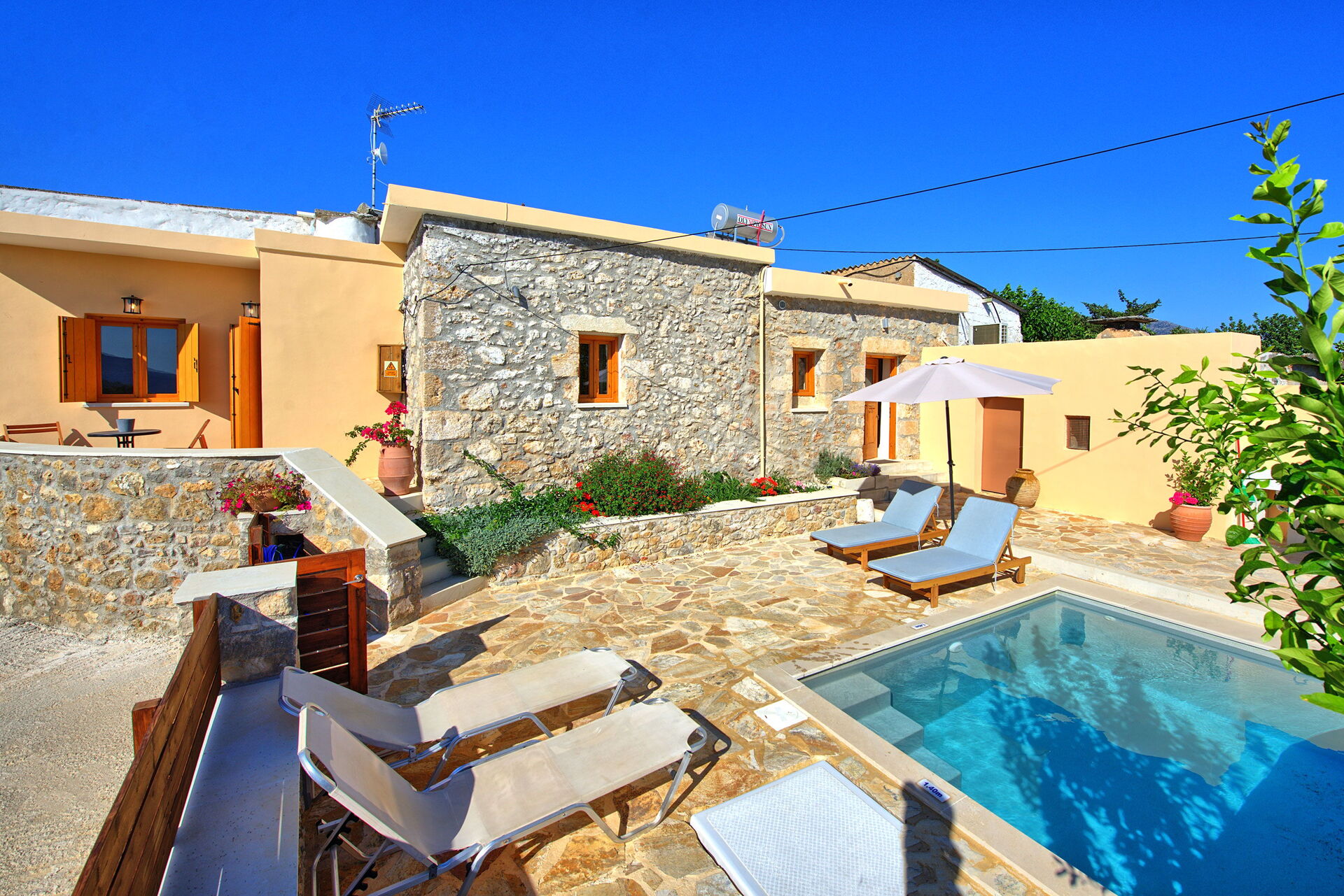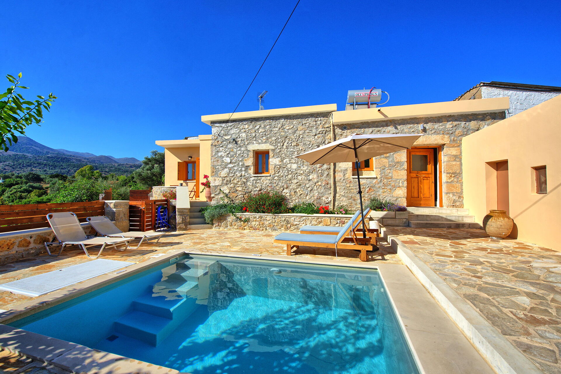 À l'intérieur, il y a 2 chambres doubles dont une ouverte sur le séjour. A l'extérieur, une zone privée avec la belle piscine qui vous permettra de vous rafraîchir durant les chaudes journées d'été en Crète.