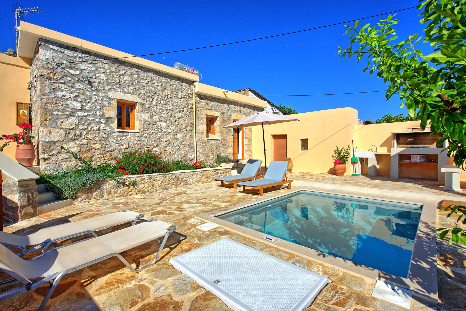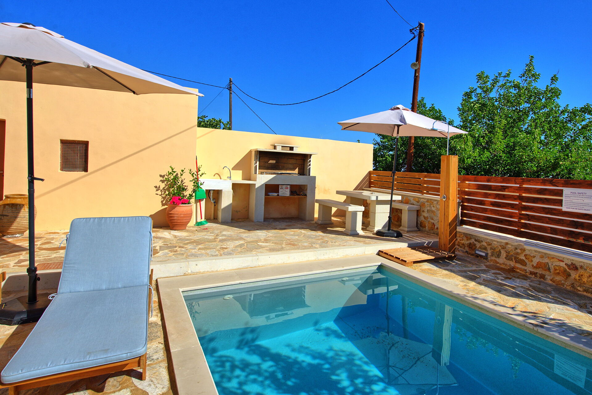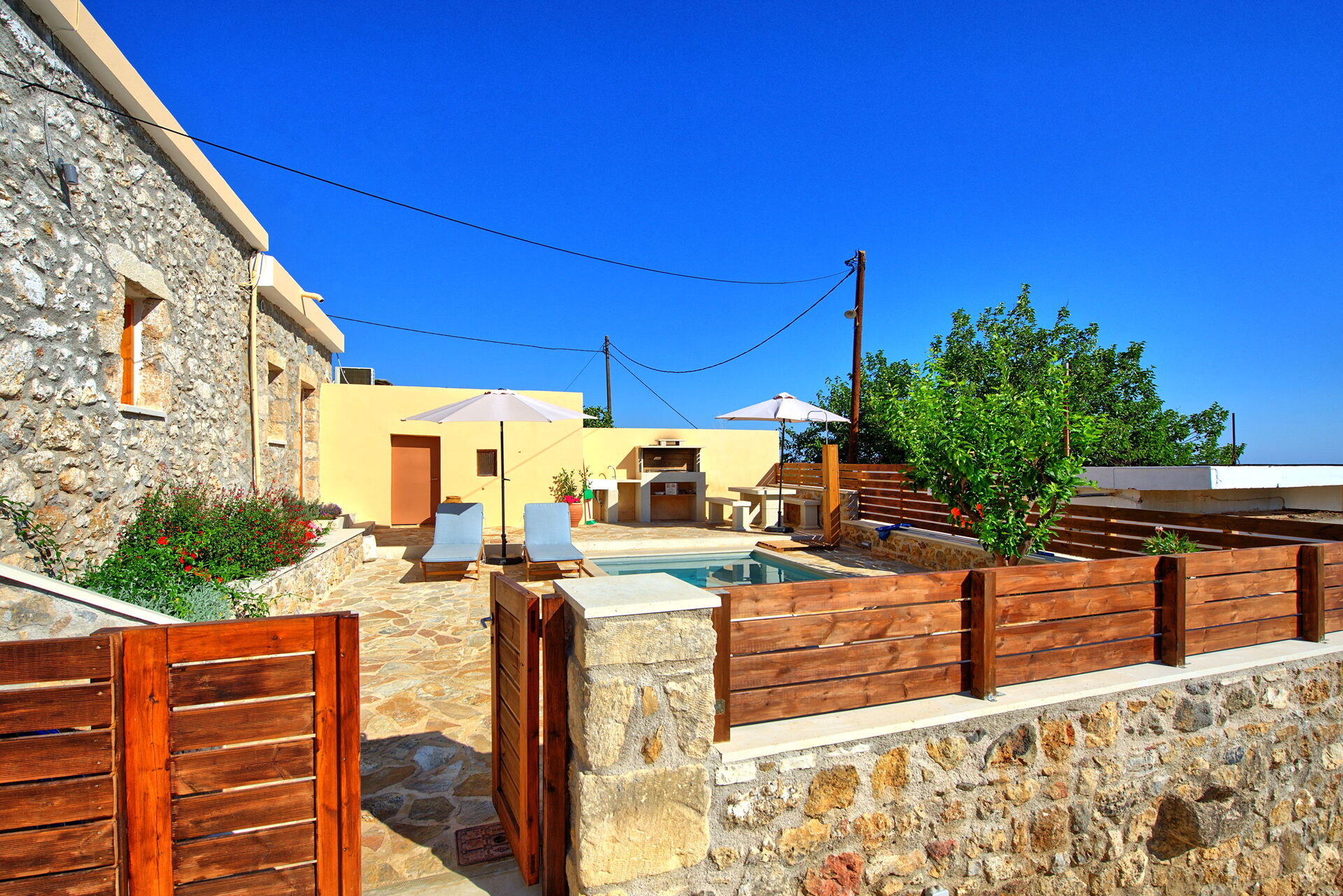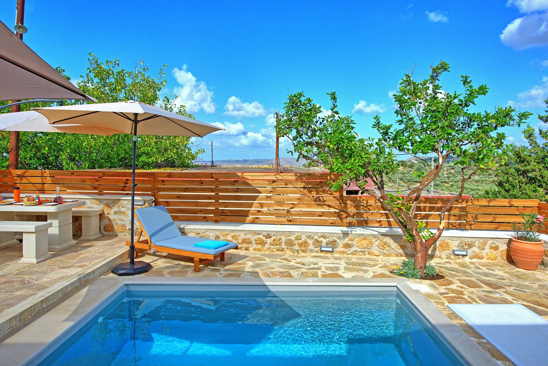 À l'intérieur, il y a 2 chambres doubles dont une ouverte sur le séjour. A l'extérieur, une zone privée avec la belle piscine qui vous permettra de vous rafraîchir durant les chaudes journées d'été en Crète.