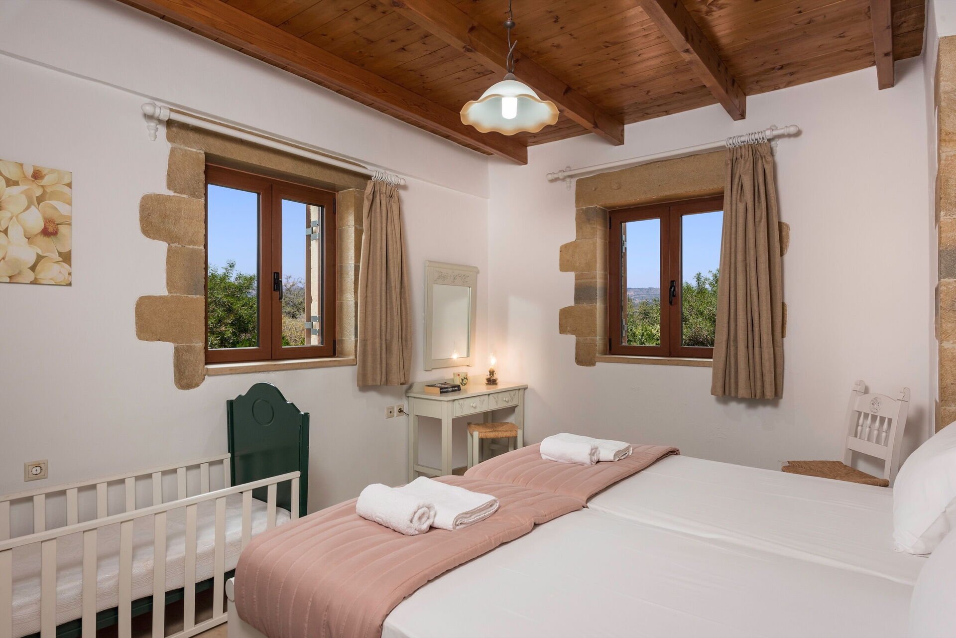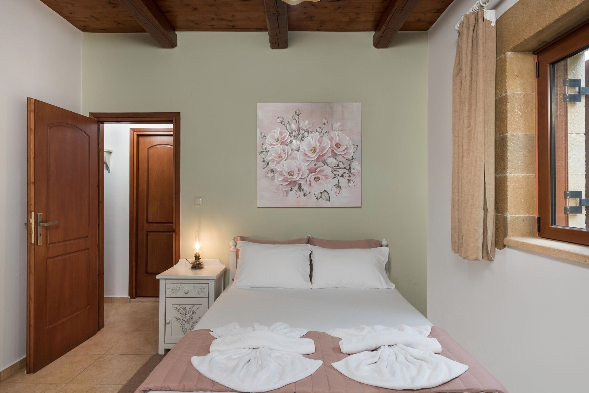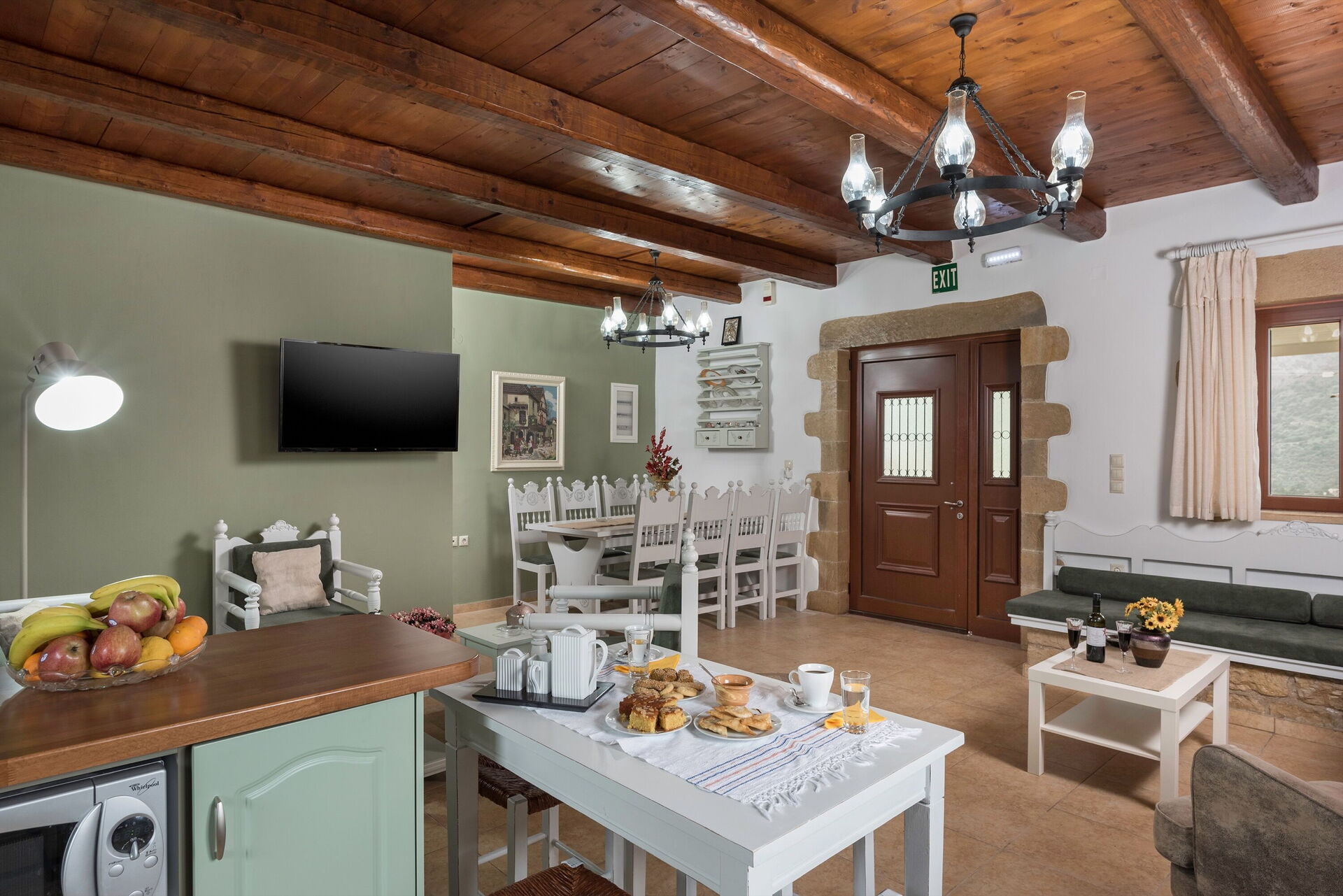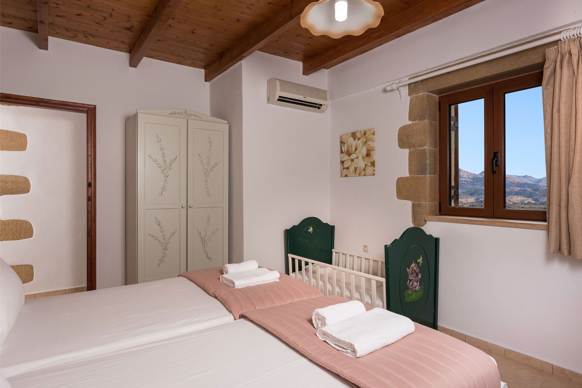 Distances: Vrisses (magasins de toutes sortes) à 3 km, Georgioupoli (mer) à 8 km, Vamos à 10 km, Réthymnon à 39 km, La Canée à 35 km, aéroport à 47 km, Héraklion à 114 km, Agios Nikolaos à 173 km.