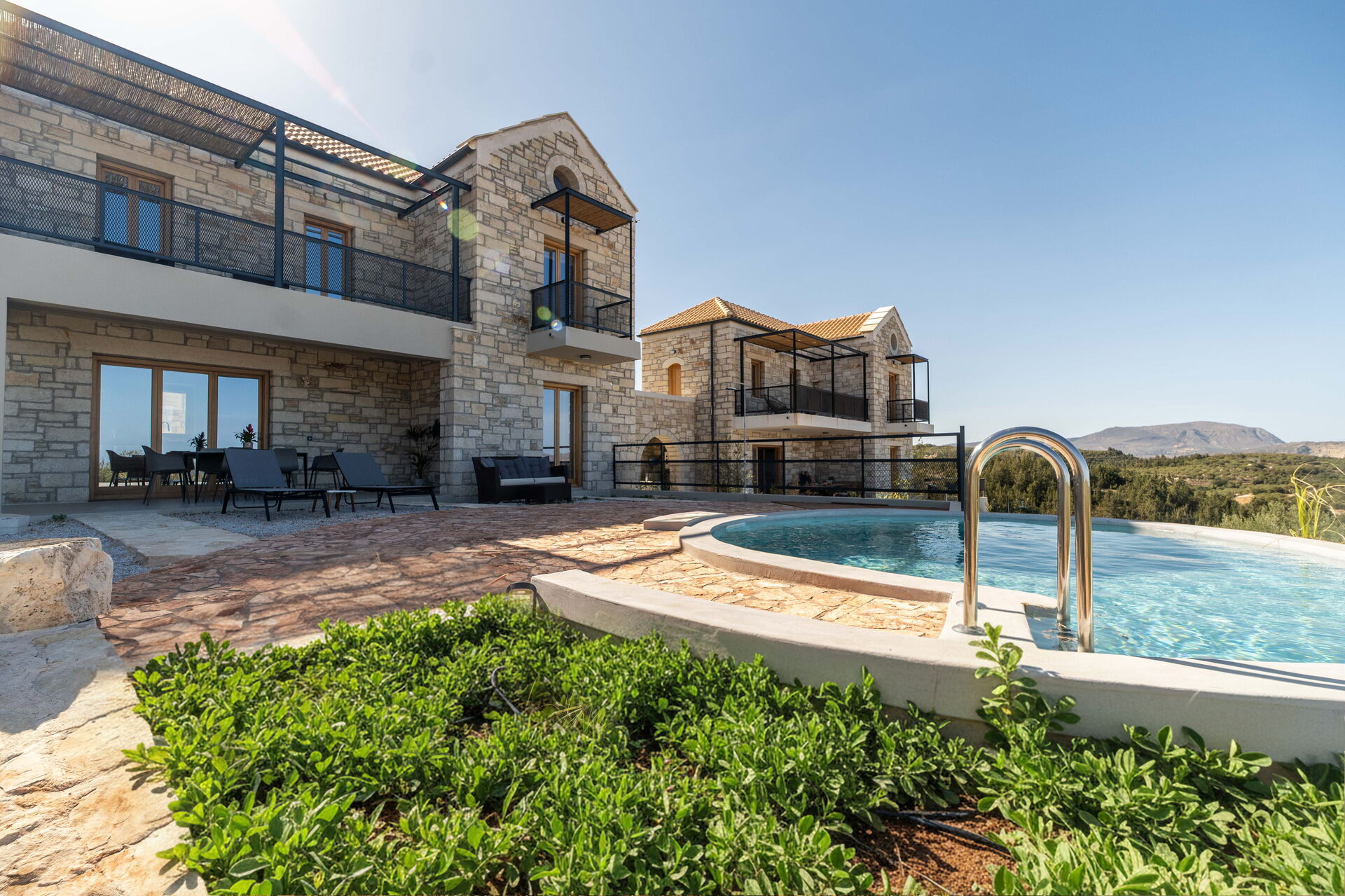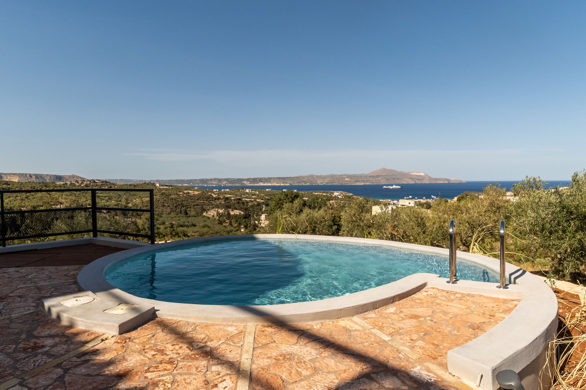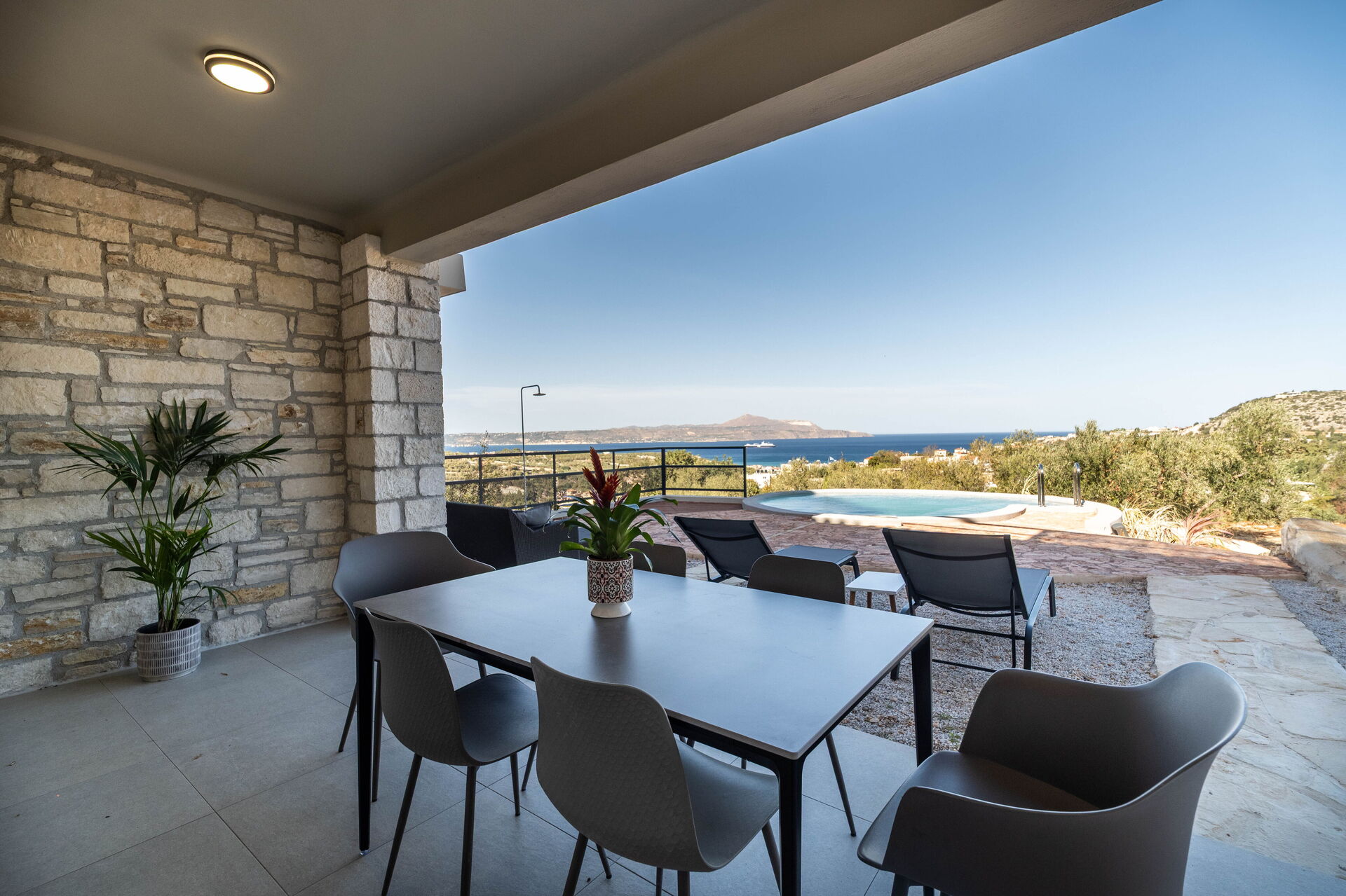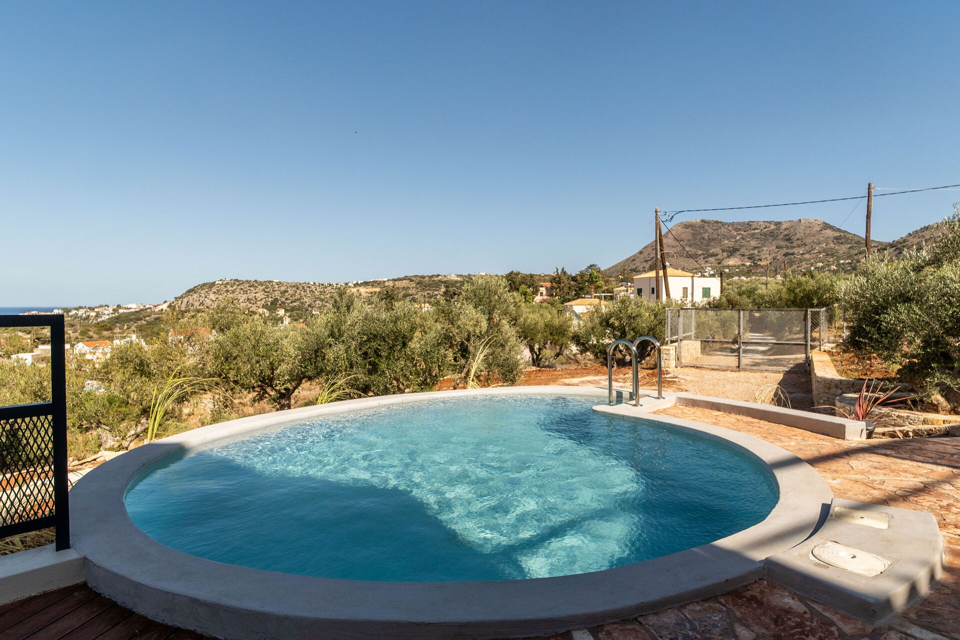 À l’extérieur, elle offre un espace équipé avec un barbecue, une table pour manger en plein air, une piscine privée pour se rafraîchir durant les journées d’été et où profiter du calme et de la paix de la campagne; une splendide vue panoramique sur la mer cristalline de la Crète complète le cadre de la propriété.