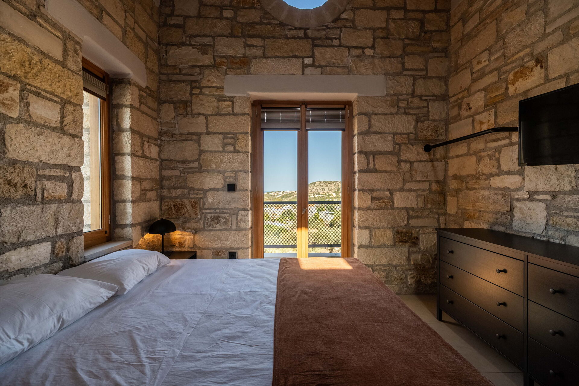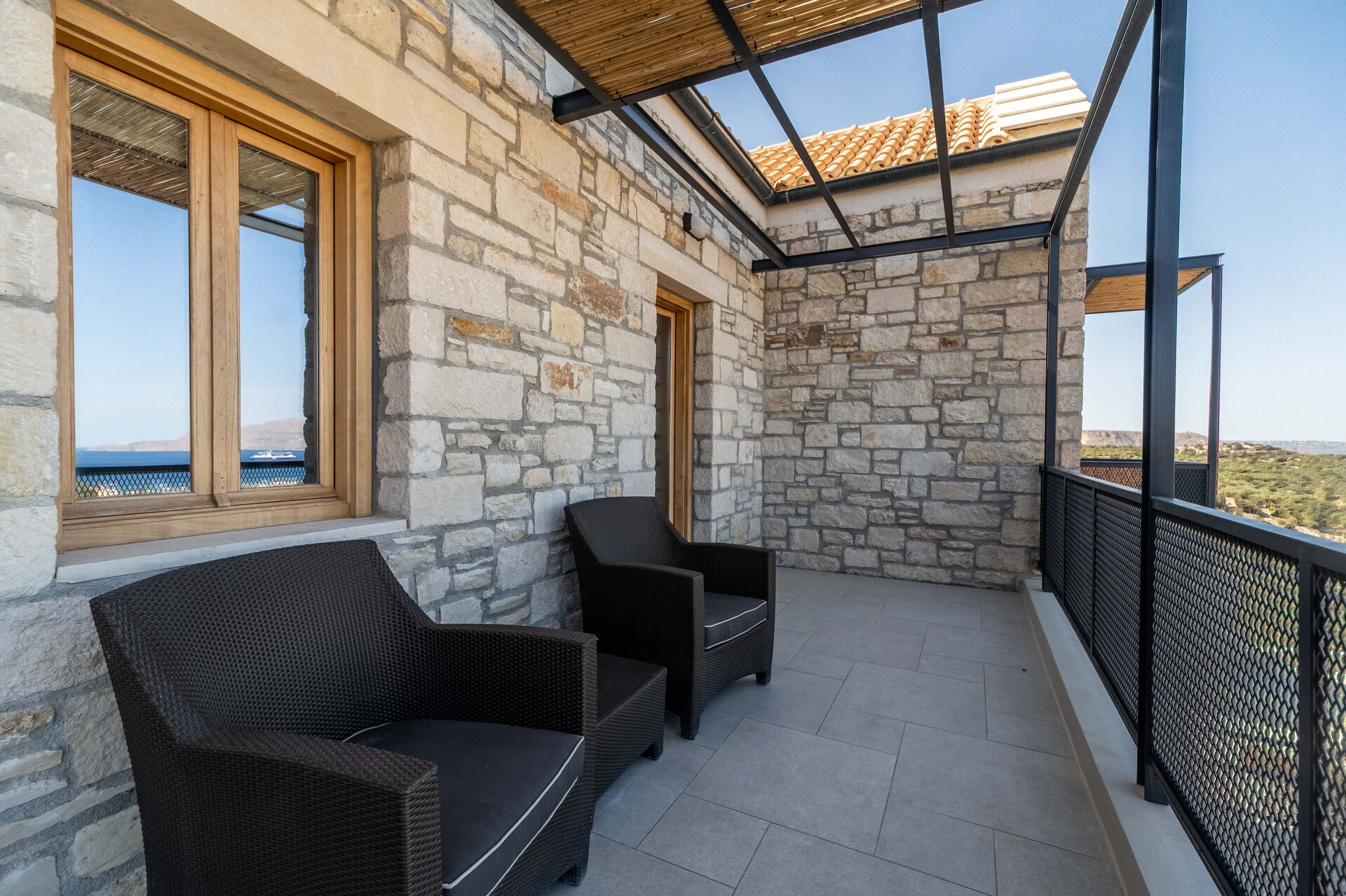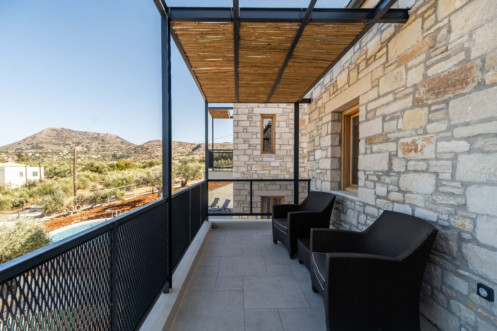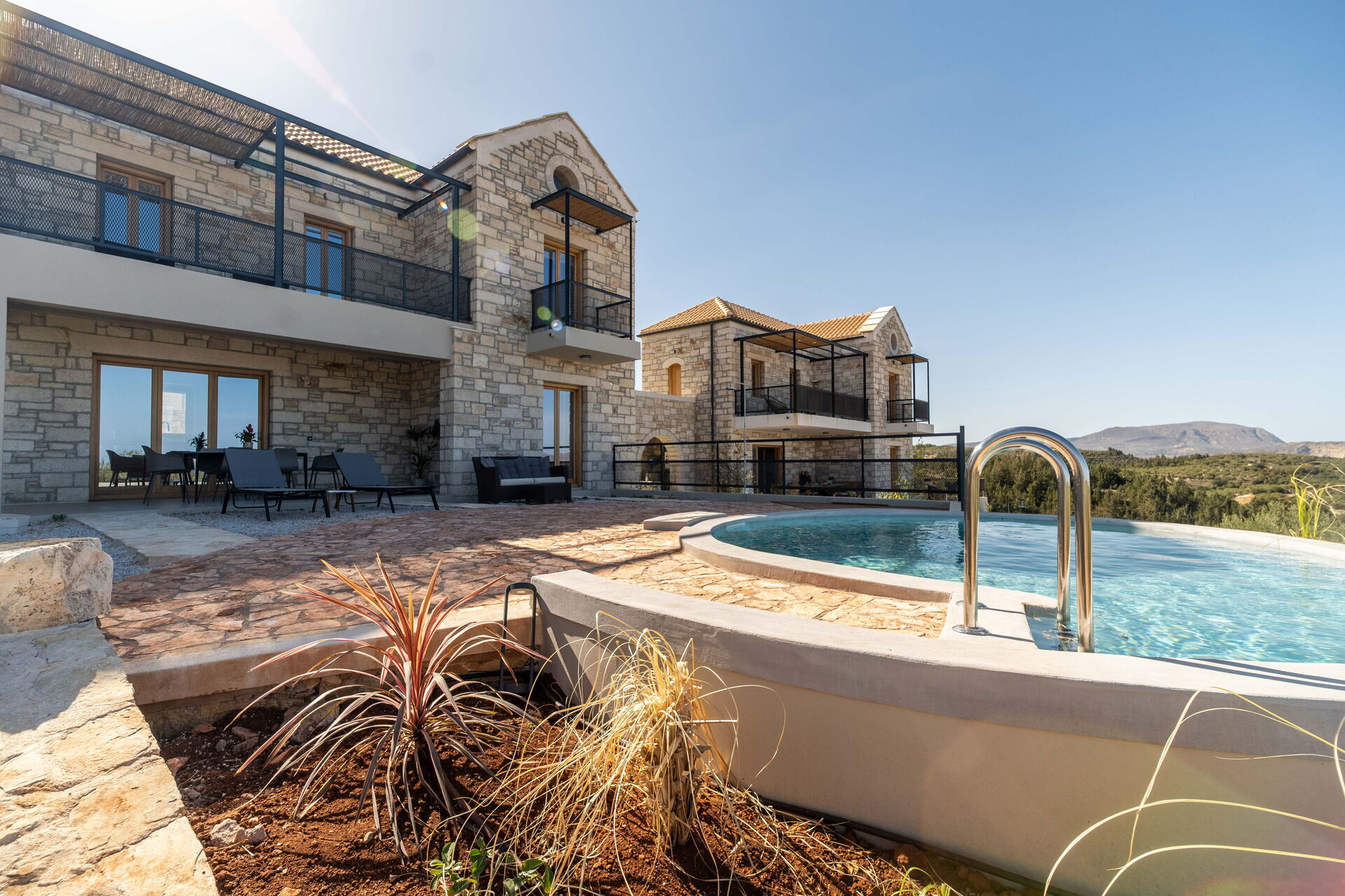 À l’extérieur, elle offre un espace équipé avec un barbecue, une table pour manger en plein air, une piscine privée pour se rafraîchir durant les journées d’été et où profiter du calme et de la paix de la campagne; une splendide vue panoramique sur la mer cristalline de la Crète complète le cadre de la propriété.