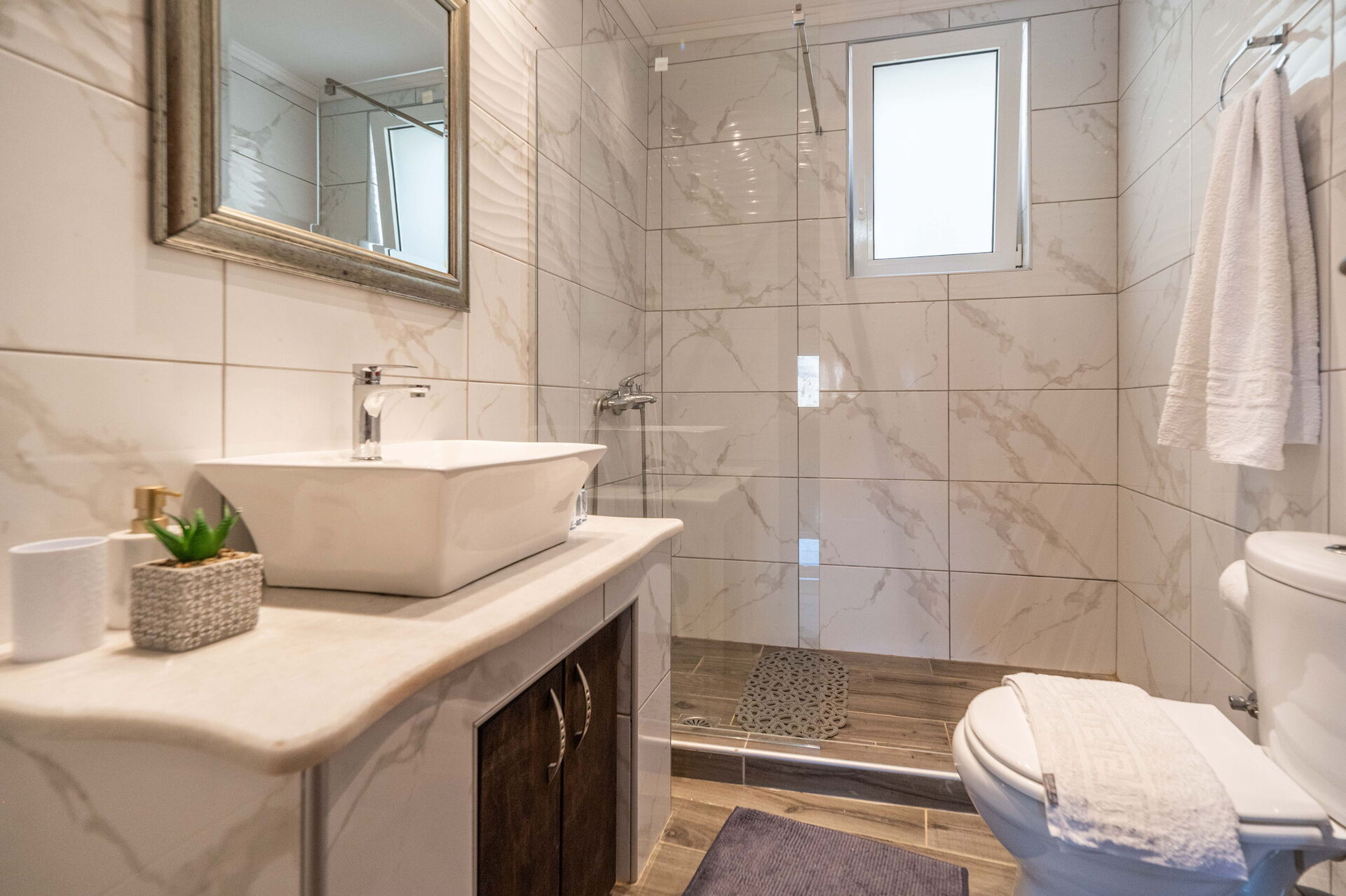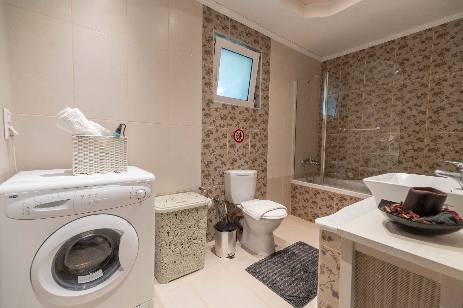 Rez-de-chaussée: entrée dans le séjour avec coin repas avec cuisine (cuisinière, four, congélateur, réfrigérateur, lave-vaisselle, micro-ondes, cafetière, grille-pain), chambre double ( climatisée) avec salle de bain privée avec baignoire, chambre double ( climatisée), chambre à deux lits ( climatisée), salle de bain avec douche.
