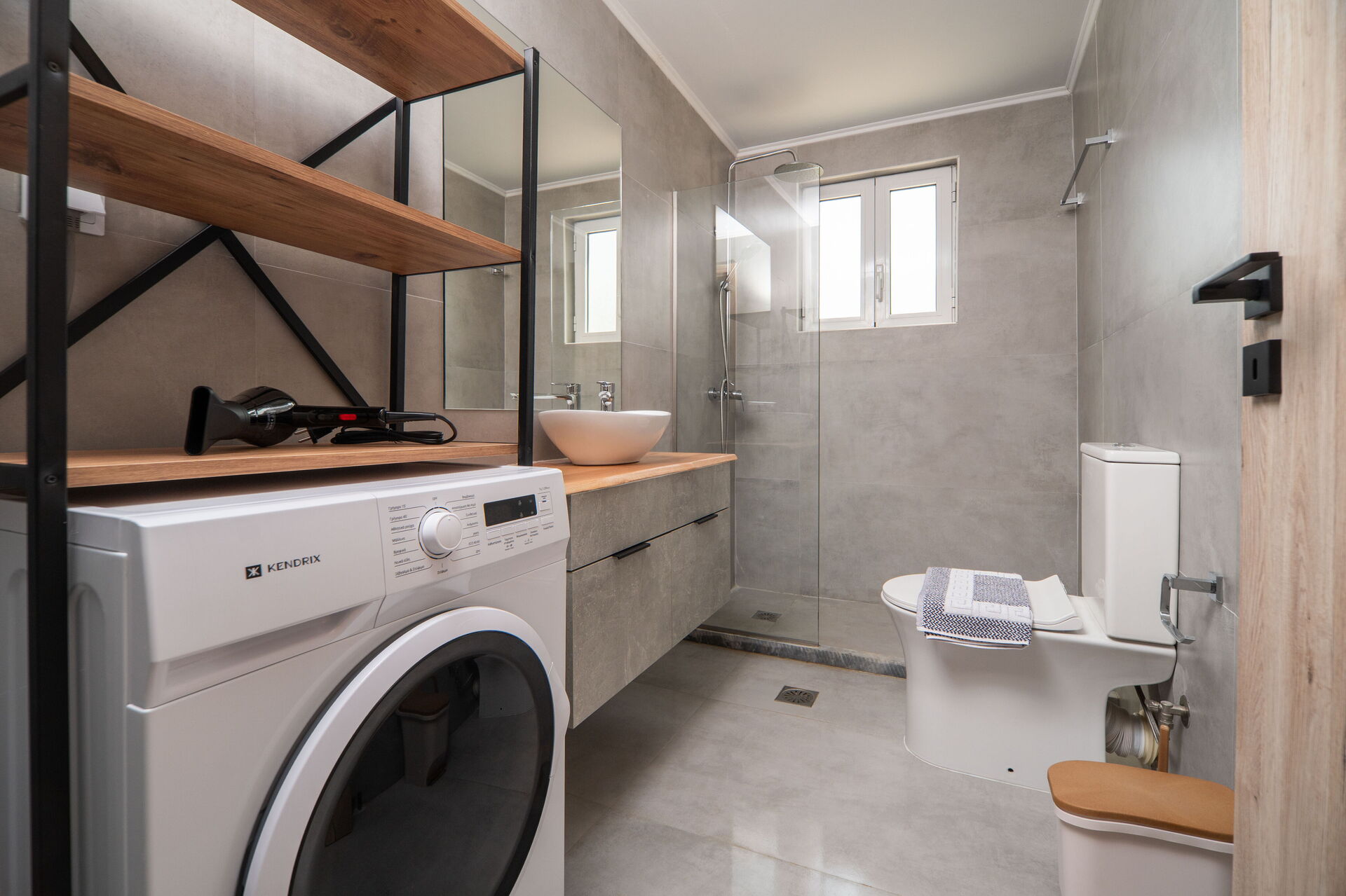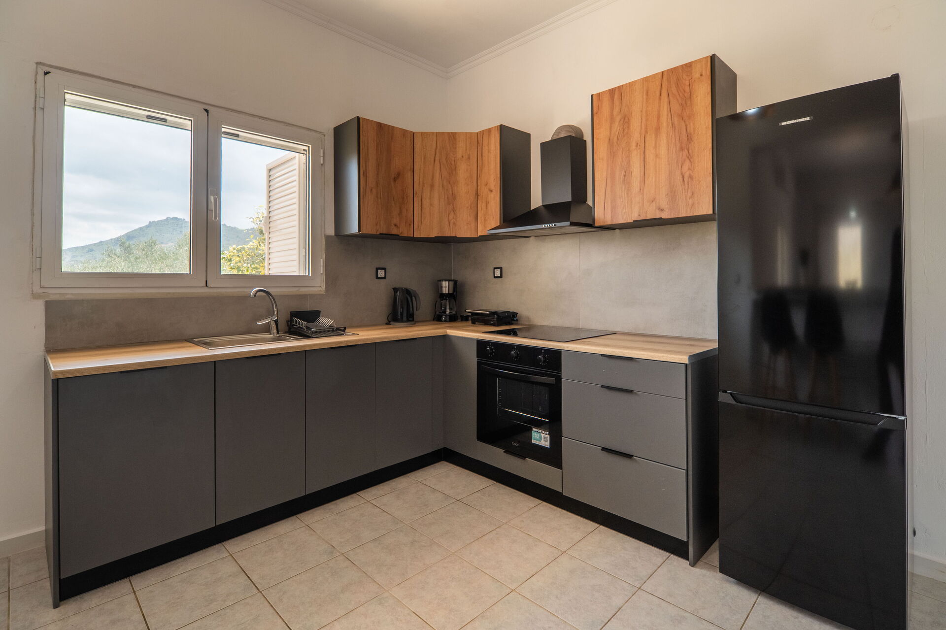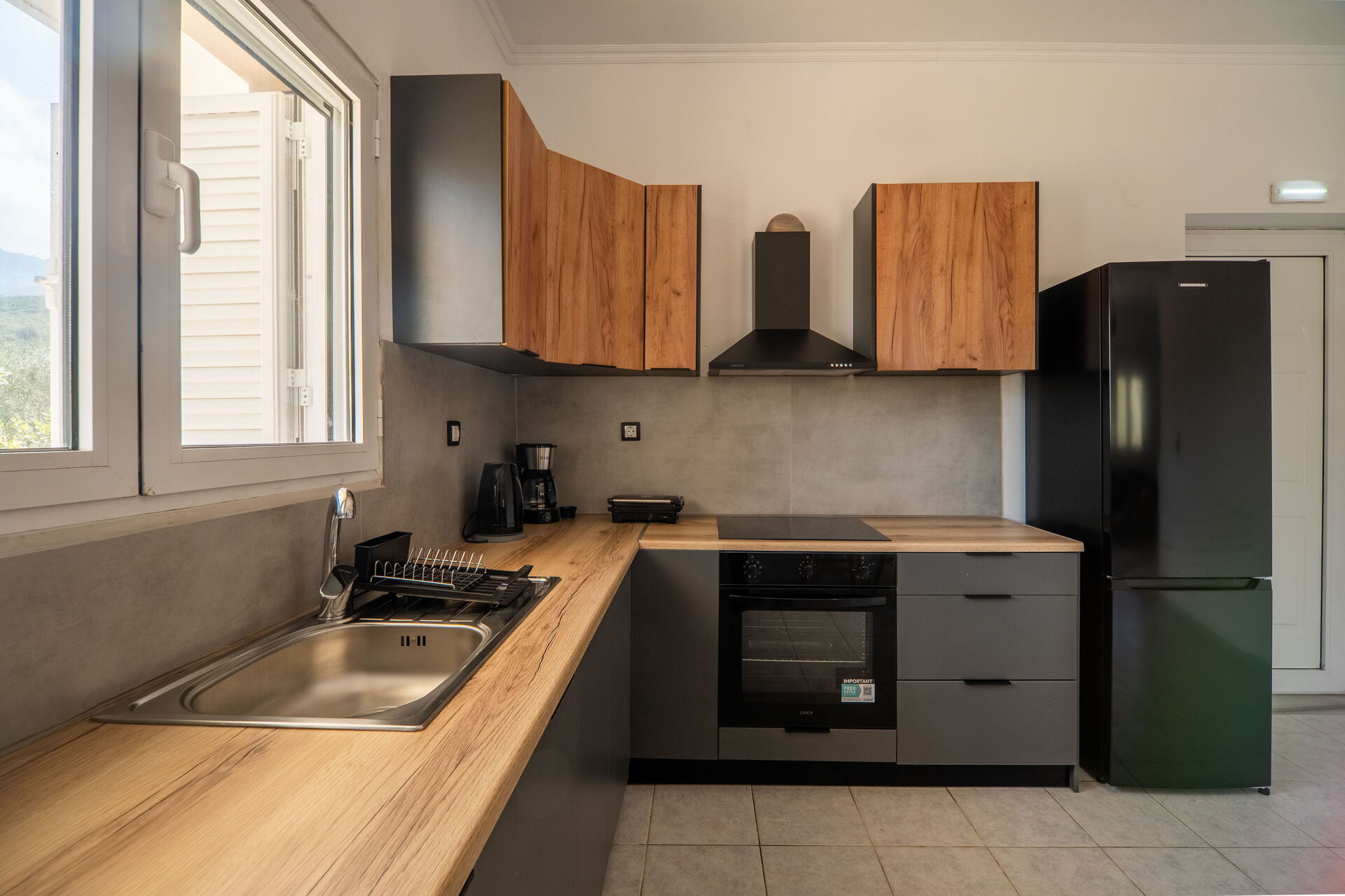 Rez-de-chaussée: salon (Smart-TV) avec coin repas et cuisine (four, congélateur, machine à café, grille-pain et bouilloire), 3 chambres doubles, 2 salles de bain chacune avec douche.