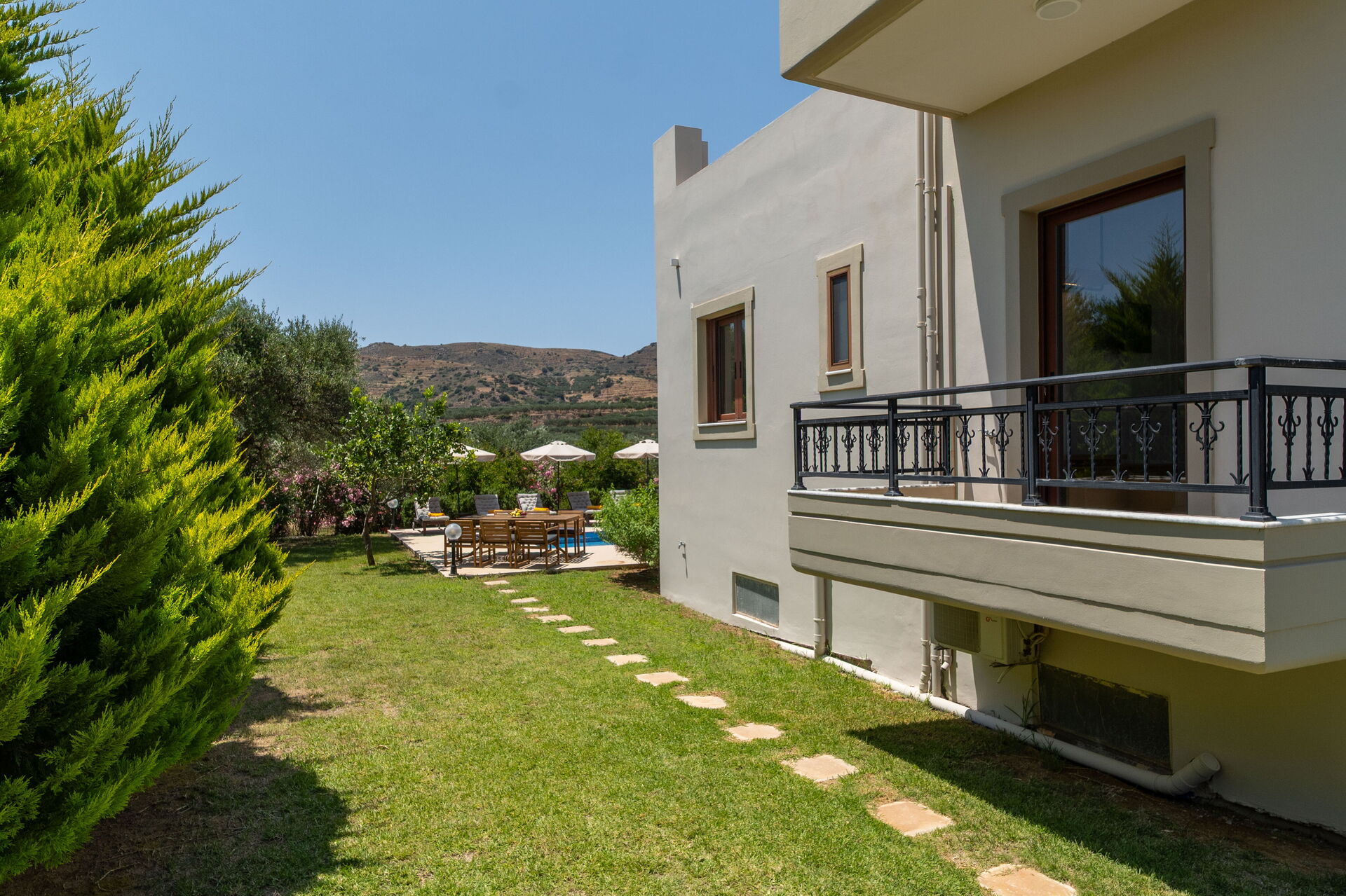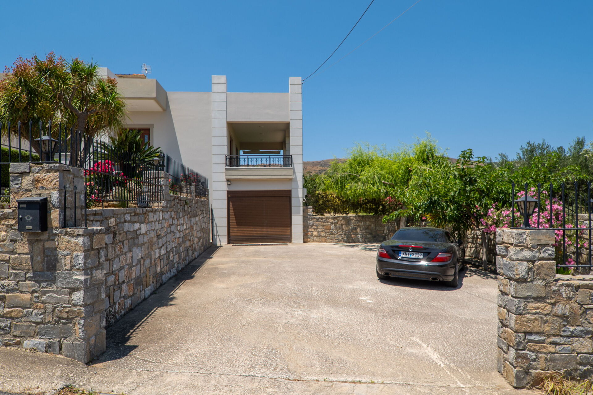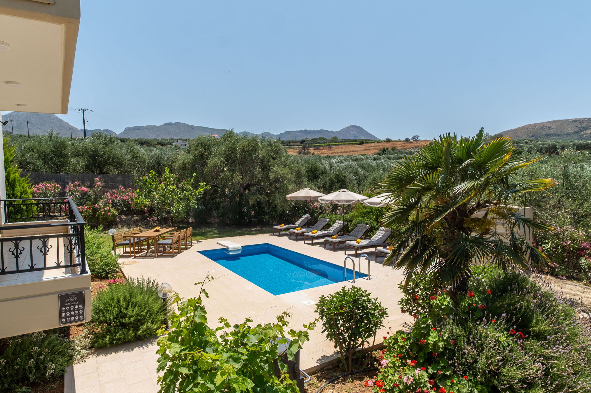 À l’extérieur la villa est entourée d’un jardin bien entretenu ainsi que de plusieurs terrasses panoramiques, dont une équipée d’une table pour les repas en plein air, une belle piscine avec solarium avec transats et tables basses: c’est l’endroit parfait pour profiter des rayons du soleil crétois tout en se relaxant et en partageant des moments inoubliables en famille ou entre amis tout en profitant de la belle vue sur la mer et les collines environnantes.