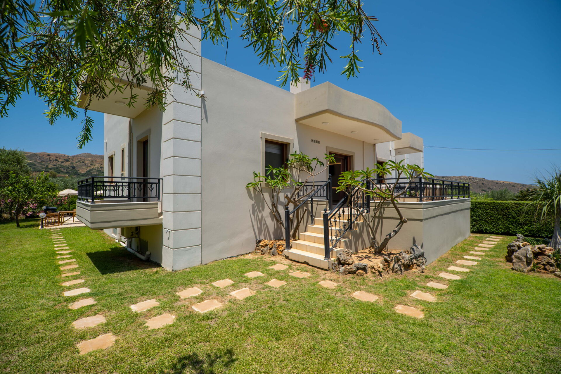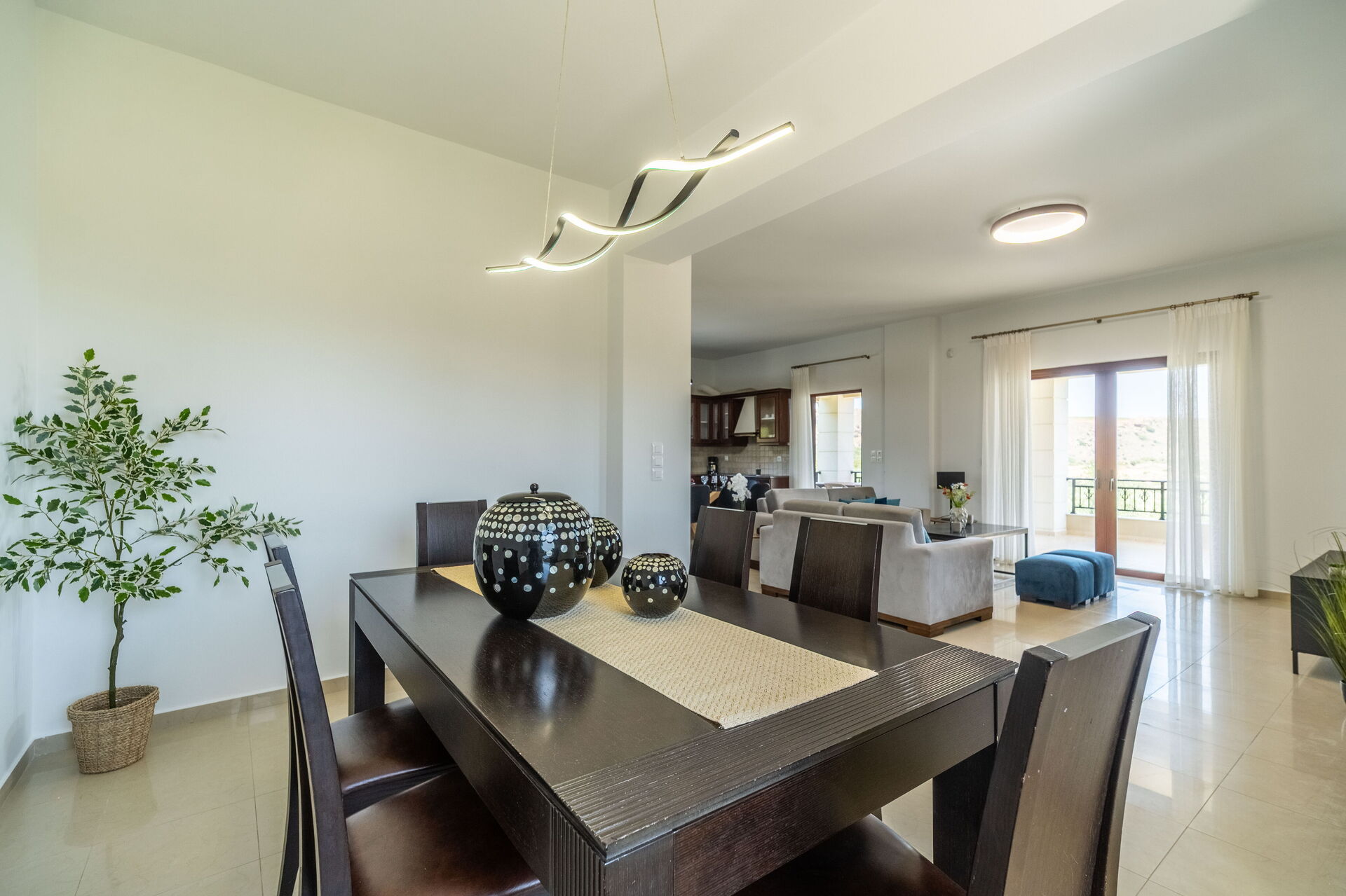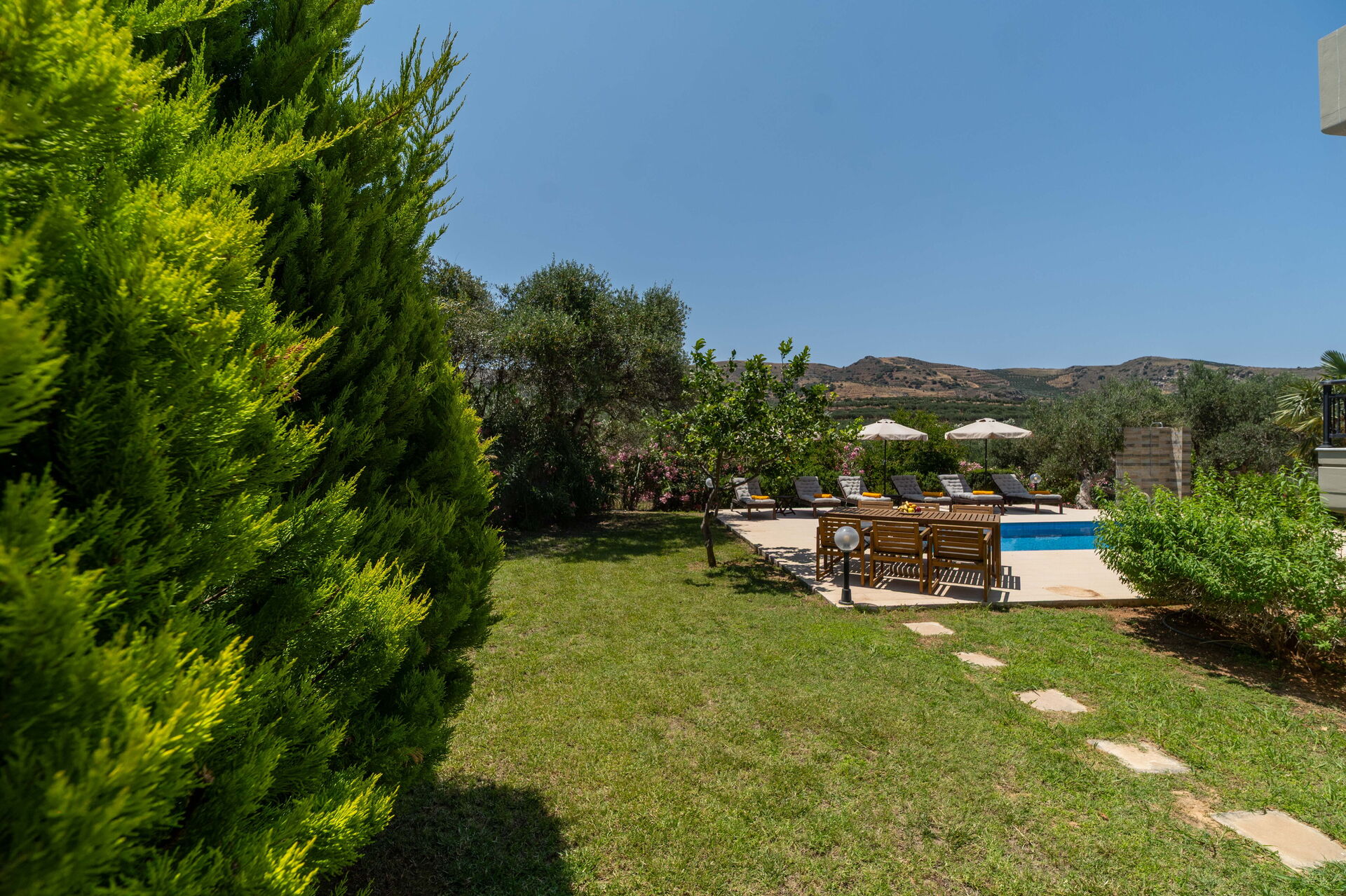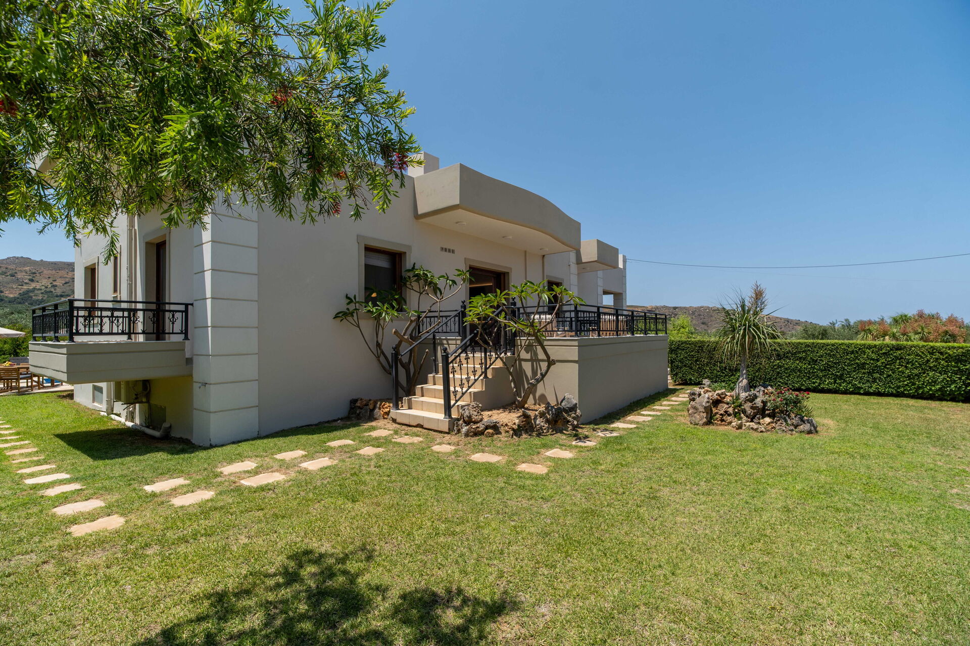 À l’extérieur la villa est entourée d’un jardin bien entretenu ainsi que de plusieurs terrasses panoramiques, dont une équipée d’une table pour les repas en plein air, une belle piscine avec solarium avec transats et tables basses: c’est l’endroit parfait pour profiter des rayons du soleil crétois tout en se relaxant et en partageant des moments inoubliables en famille ou entre amis tout en profitant de la belle vue sur la mer et les collines environnantes.