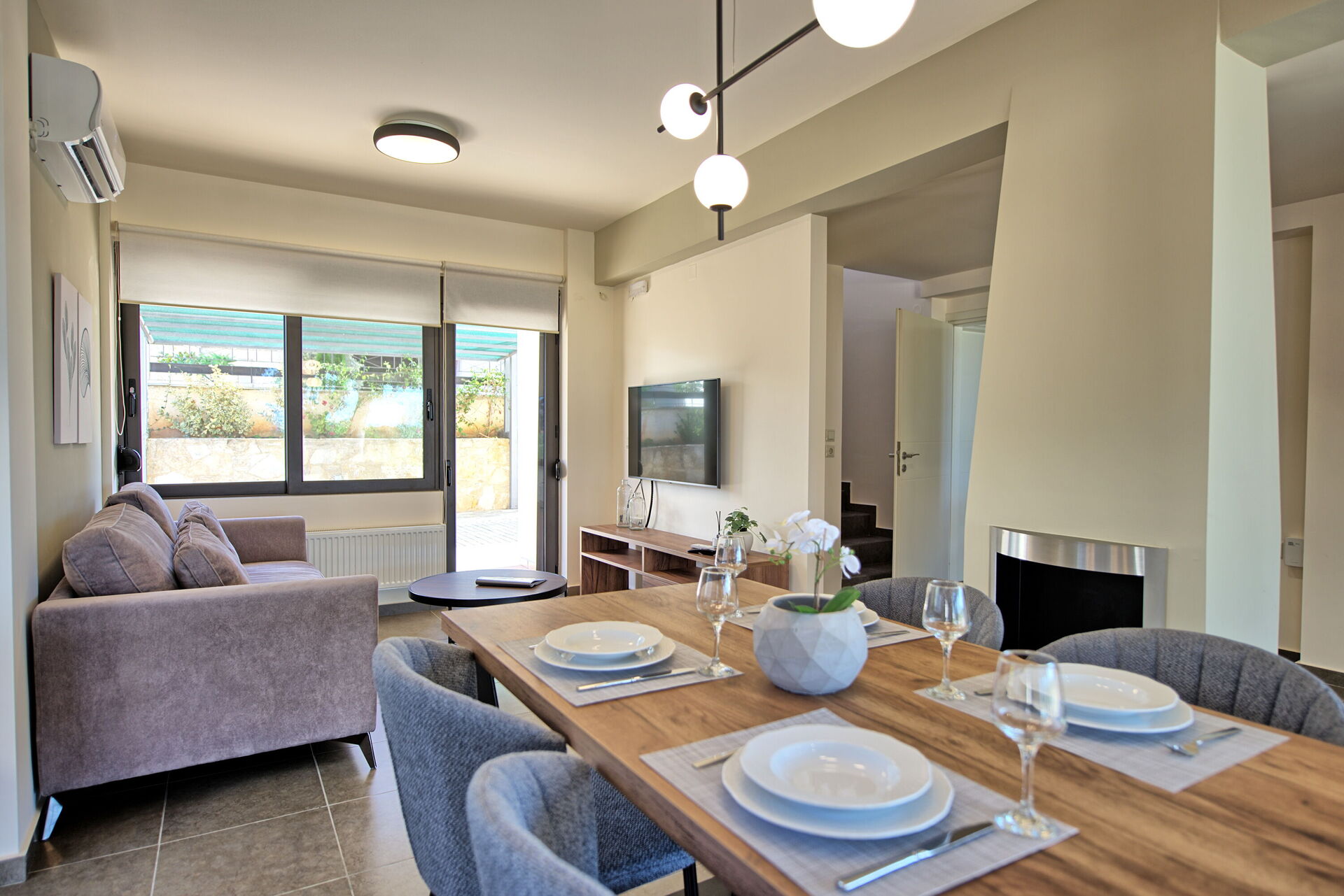 Cette magnifique maison à louer fait partie d’un complexe de 4 maisons toutes "jumelles" (Iris, Dioni, Phaedra e Aelia). Développée sur trois niveaux, la splendide maison à louer offre 2 chambres et une pièce avec un canapé-lit, pouvant accueillir jusqu’à 5 personnes. En plus du prestige du mobilier, cette maison moderne se caractérise par la lumière: les grandes fenêtres rendent chaque pièce de la maison à louer incroyablement lumineuse.