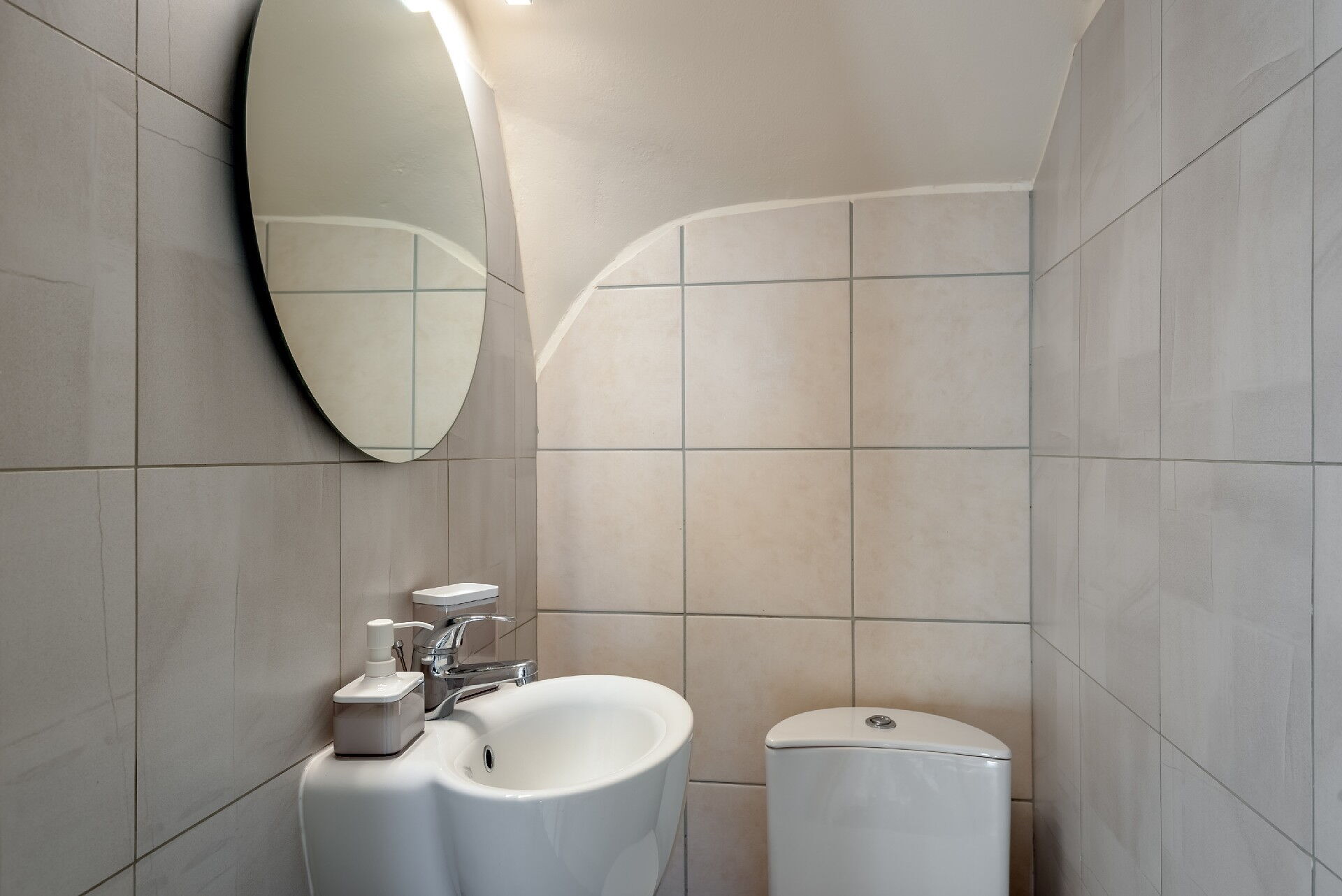 Premier étage: chambre double avec salle de bain privée avec douche, chambre avec deux lits simples, salle de bain avec baignoire (machine à laver). À partir des deux chambres il est possible d’accéder à une très grande terrasse avec table et chaises.