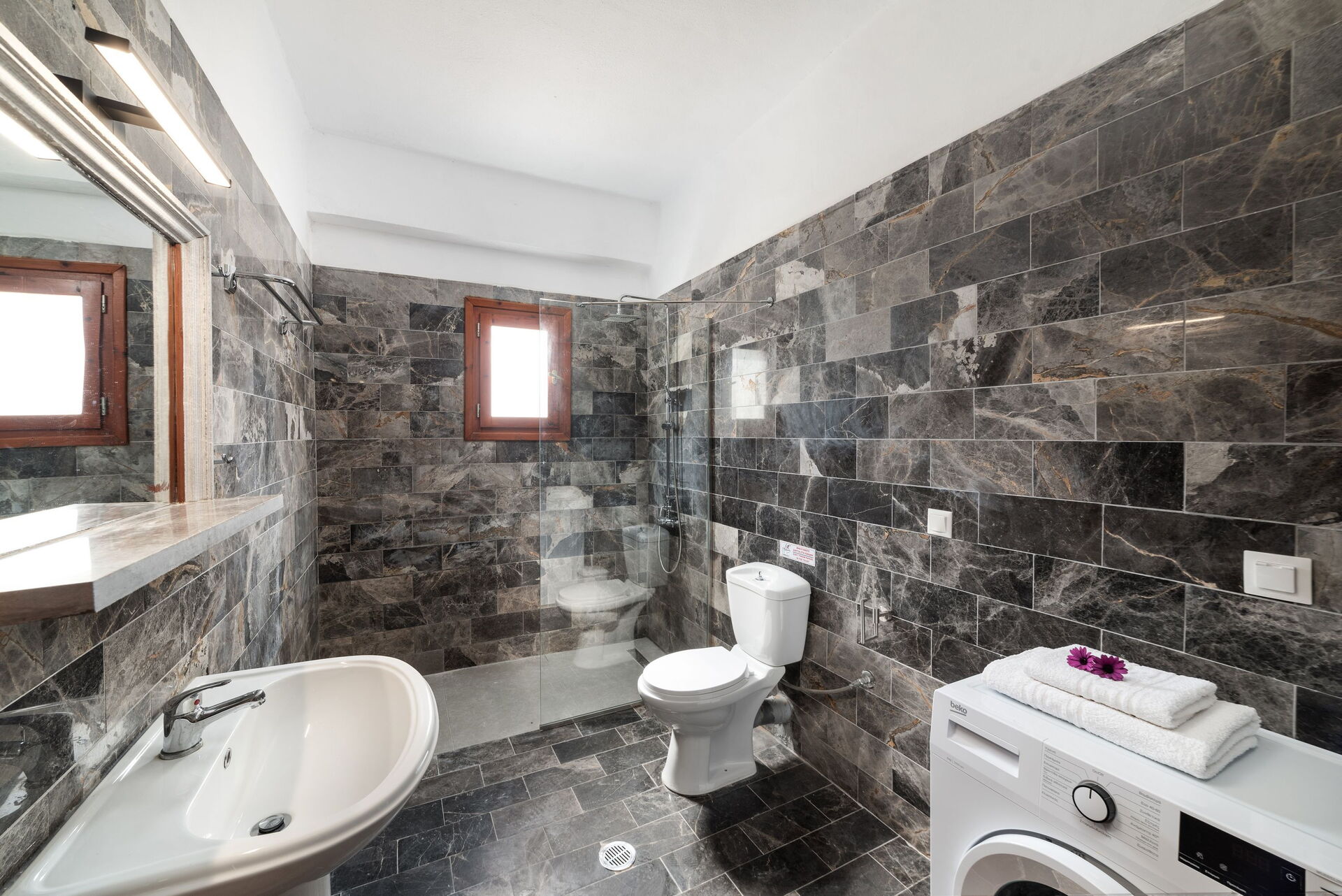 Rez-de-chaussée: salon (air conditionné, TV) avec coin repas, cuisine (plaque de cuisson, four, congélateur, réfrigérateur, lave-vaisselle, cafetière, grille-pain), chambre double (climatisée) avec salle de bain privée avec douche, chambre avec deux lits simples (climatisée), salle de bain avec douche, chambre double (climatisée).