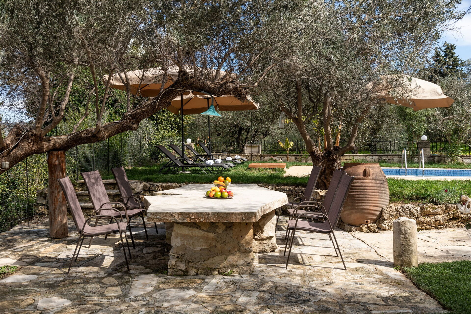 À l'extérieur, elle est entourée d'un jardin bien entretenu avec des oliviers et des arbres fruitiers: une véritable oasis où l'on peut passer des moments de détente en contact avec la nature. Dans le jardin se trouve une belle piscine privée (idéale pour se rafraîchir durant les chaudes journées d'été) et une belle vue panoramique sur la campagne environnante.