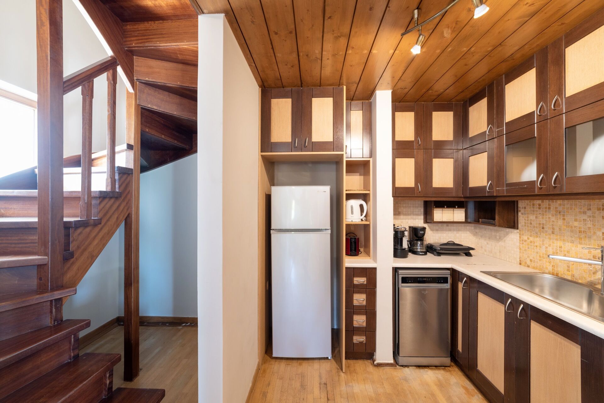 Rez-de-chaussée: séjour (TV, DVD) avec cheminée et coin cuisine (four, lave-vaisselle, cafetière expresso), salle de bain avec douche.