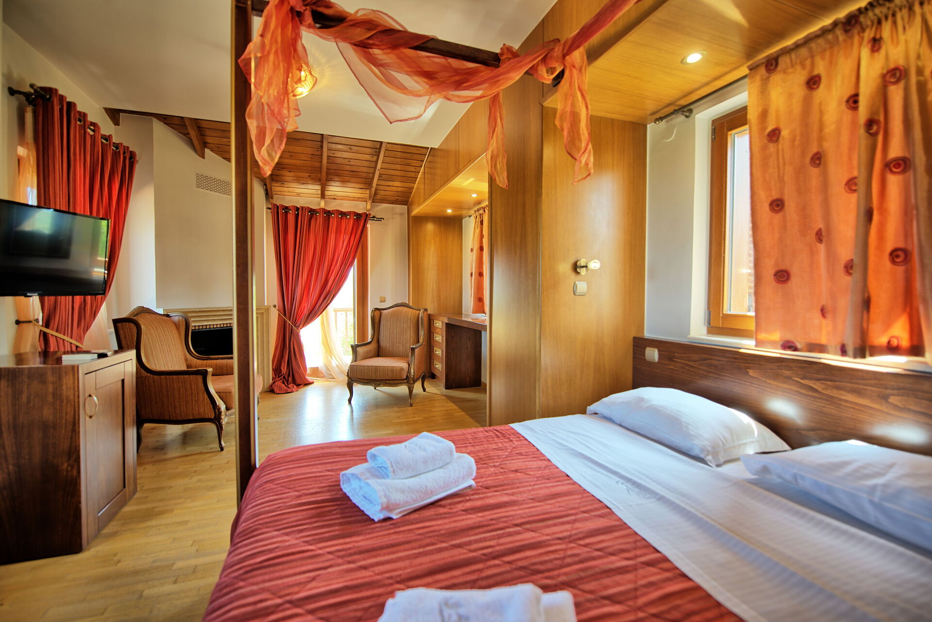 Premier étage: chambre avec lit double king size (à baldaquin), salle de bain avec baignoire (jacuzzi)