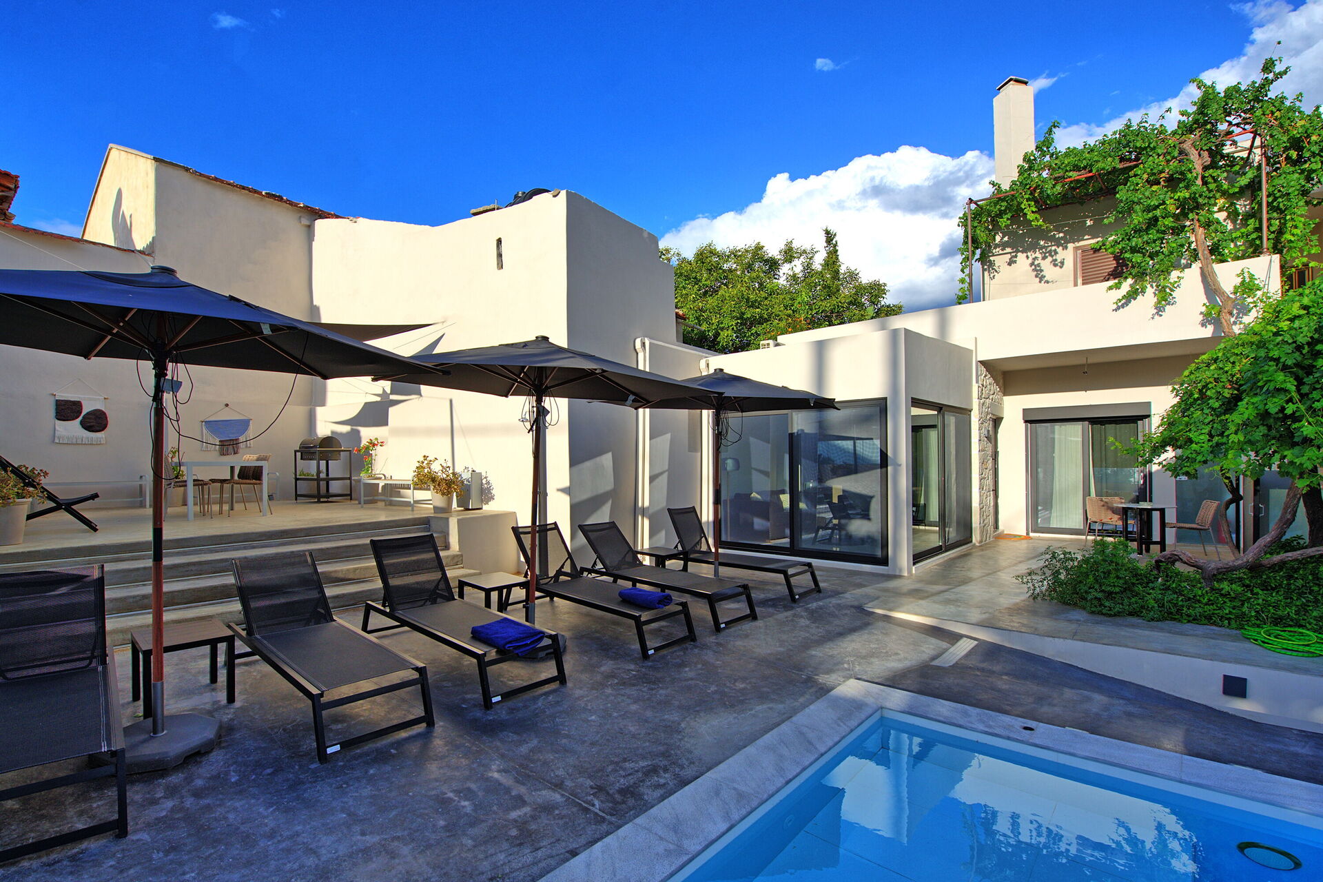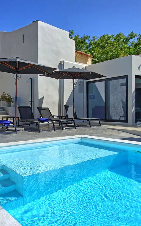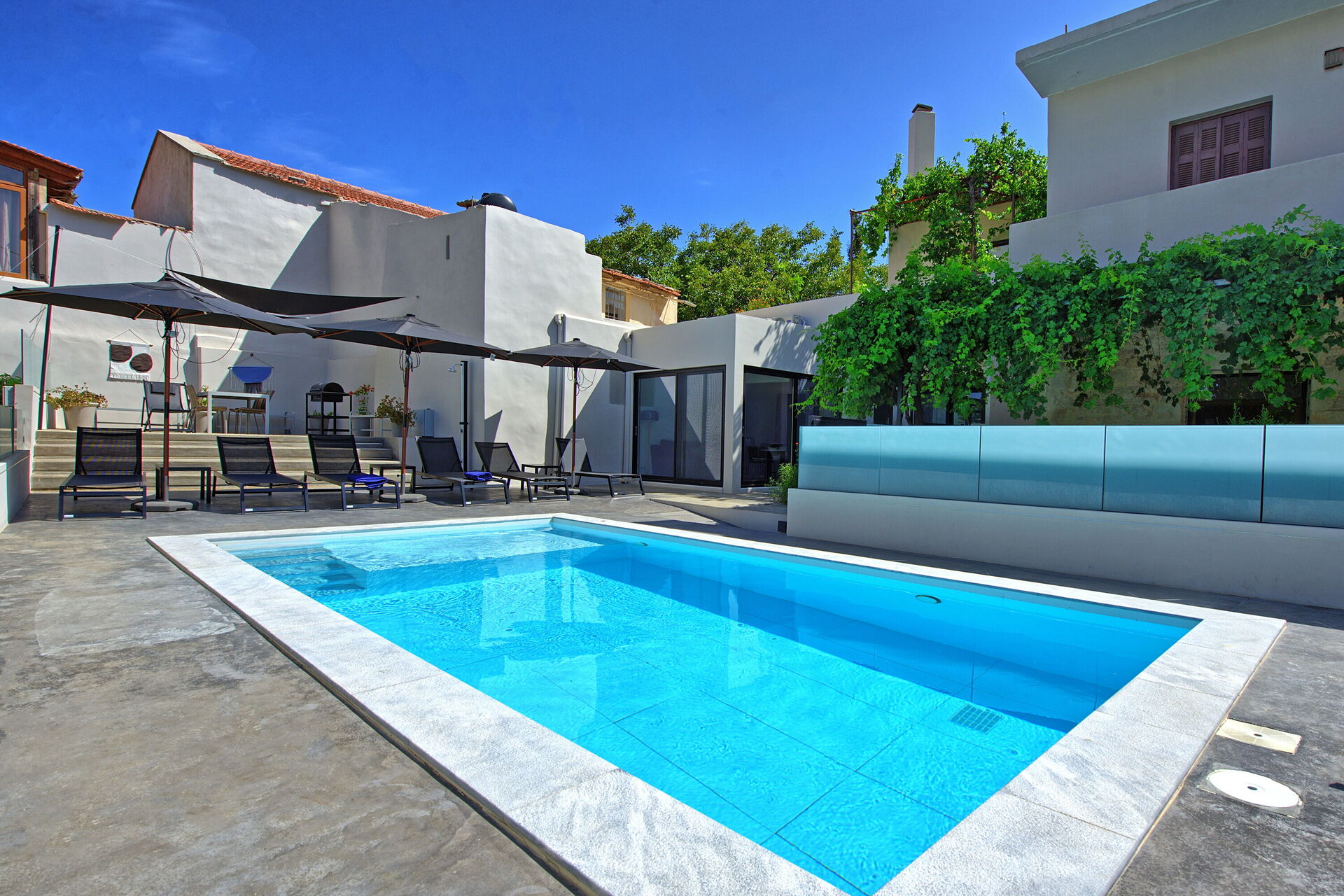 À quelques pas du portail d'entrée se trouvent un café grec traditionnel et une excellente taverne locale : une véritable extension de la maison pour ceux qui aiment la cuisine locale. Passé l'entrée privée, les clients sont accueillis dans un espace extérieur isolé. Le patio surélevé, protégé par une grande voile d'ombrage, abrite un coin repas avec barbecue, idéal pour manger en plein air. Le solarium entoure la piscine privée réservée à l'usage exclusif des clients : un atout rare dans un centre historique.