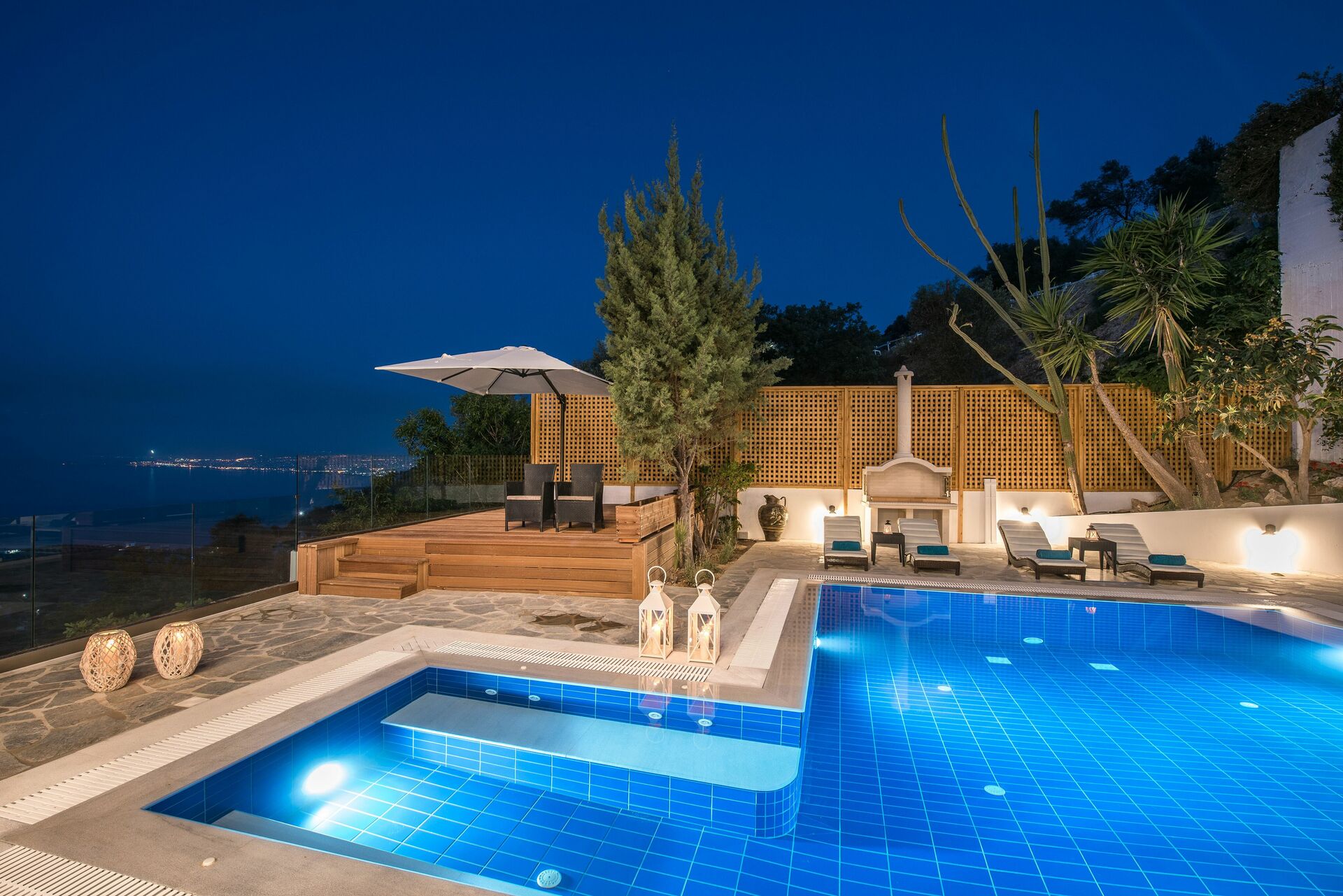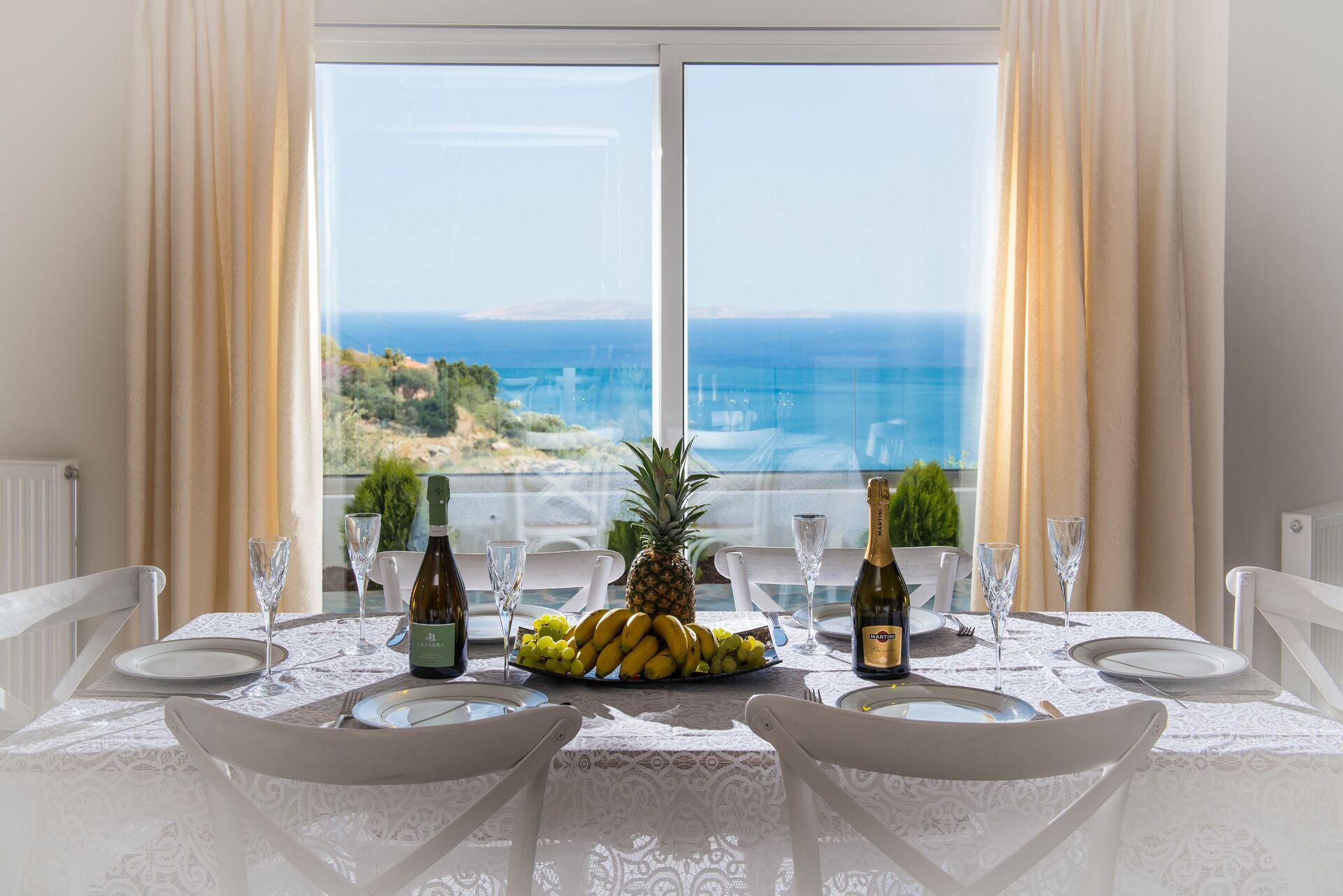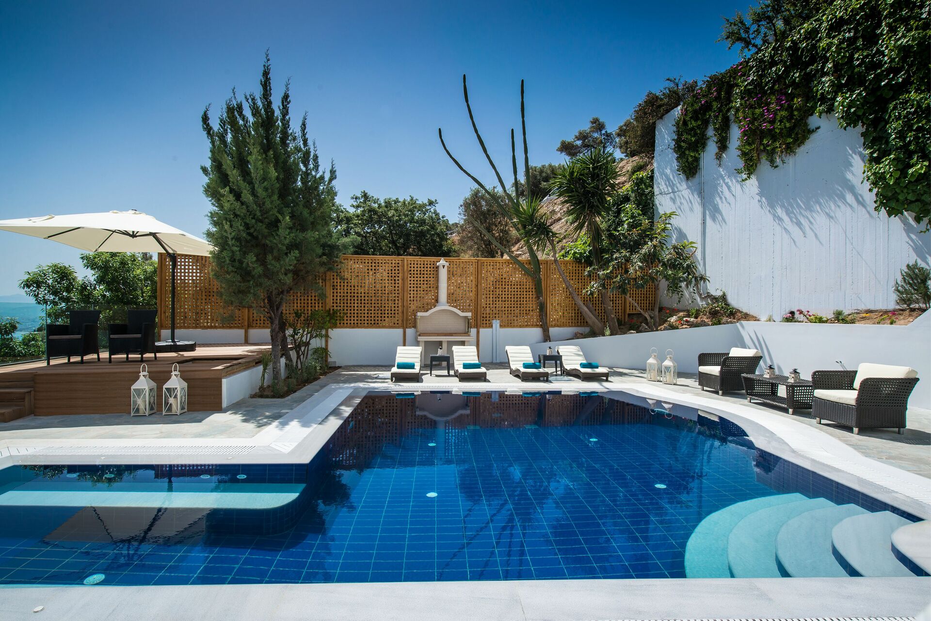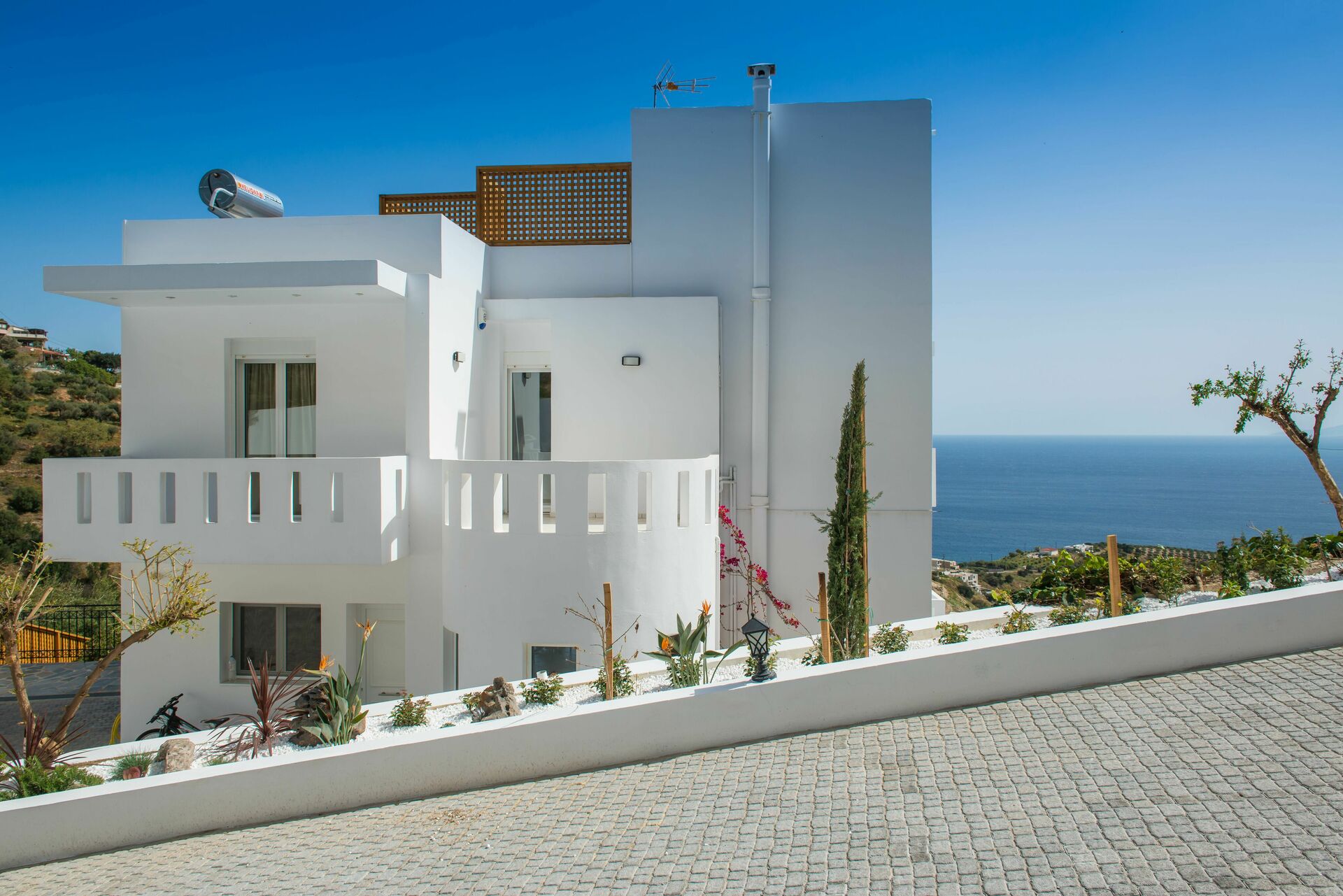 La villa dispose d'un beau jardin riche en fleurs exotiques et arbres fruitiers avec une vue imprenable sur la mer Egée et la ville de Rodia qui prend son nom d'une ancienne église datant de l'occupation vénitienne en 1553.
