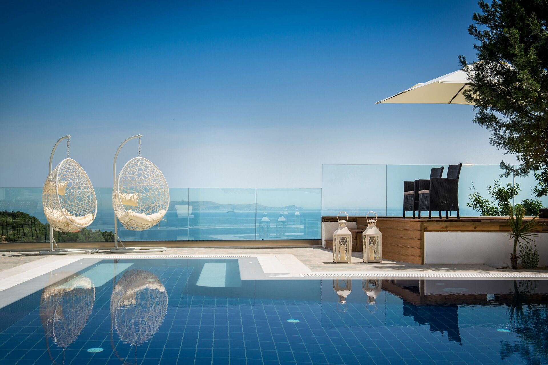 La villa est entourée de collines verdoyantes avec, comme toile de fond, le bleu de la mer.