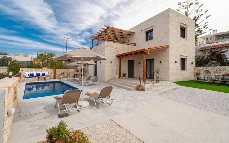 Le véritable point fort de la Villa Blini è sa logistique exceptionnelle. À seulement 350 mètres de la porte d'entrée se trouve le cœur de Plaka : vous pourrez oublier la voiture et rejoindre à pied les tavernes typiques, les bars et les petites boutiques d'artisanat. Pour les amoureux de la mer, la célèbre plage d'Almyrida se trouve à seulement 2 km, faisant de cette villa la base idéale pour ceux qui recherchent la commodité sans renoncer à l'intimité. L'espace extérieur est une véritable oasis de bien-être : la piscine privée est entourée d'un solarium équipé, idéal pour se rafraîchir lors des chaudes journées crétoises ou pour savourer un apéritif au coucher du soleil.Intérieurs lumineux et confort de dernière génération