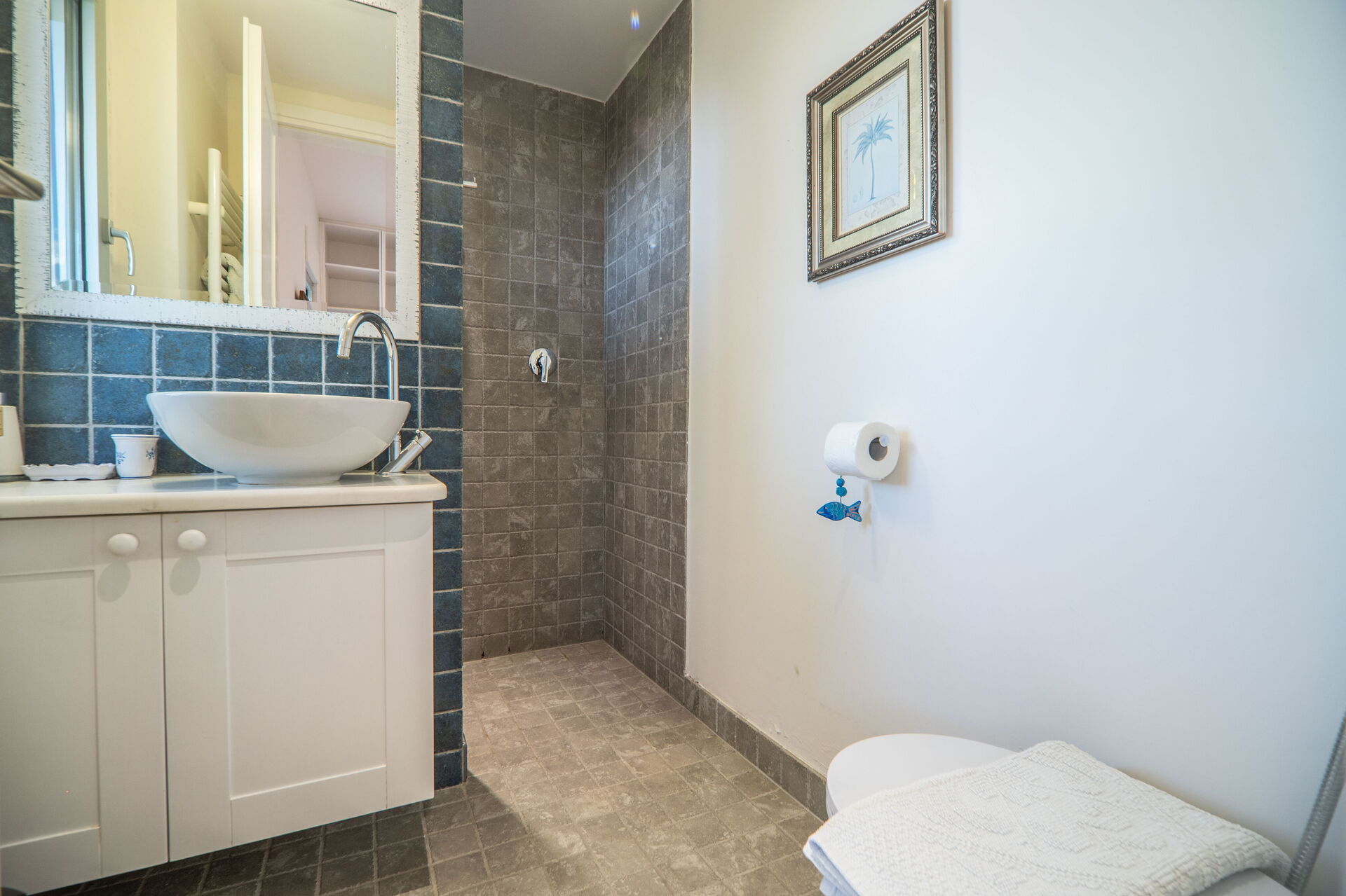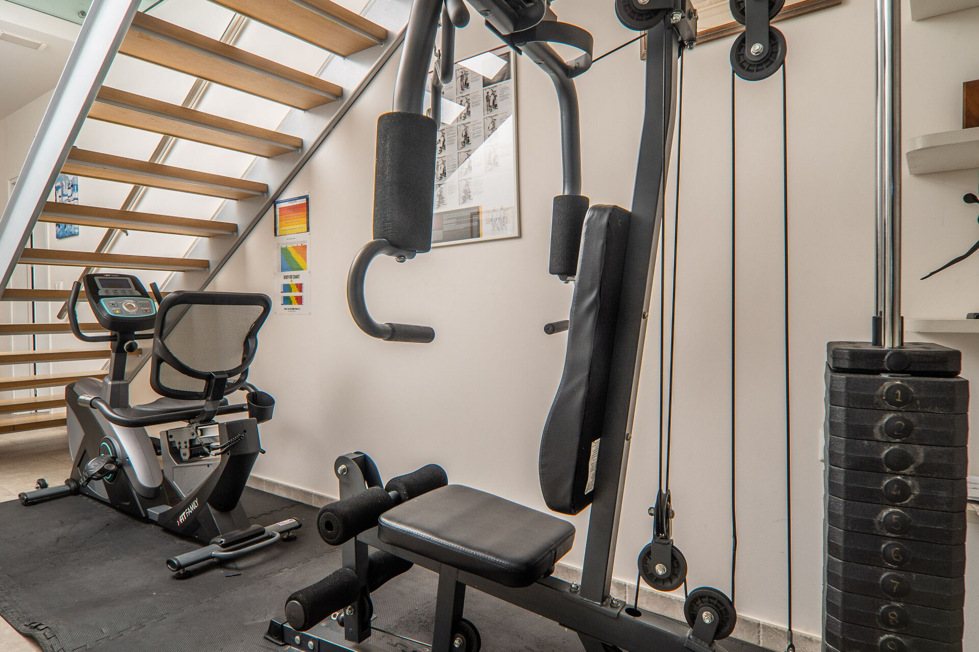 Étage inférieur: 1 chambre double, 1 salle de bain avec douche et baignoire, 2 chambres doubles avec salle de bain privée avec douche, buanderie (lave-linge et sèche-linge), salle de sport avec vélo d’appartement et appareil de musculation.