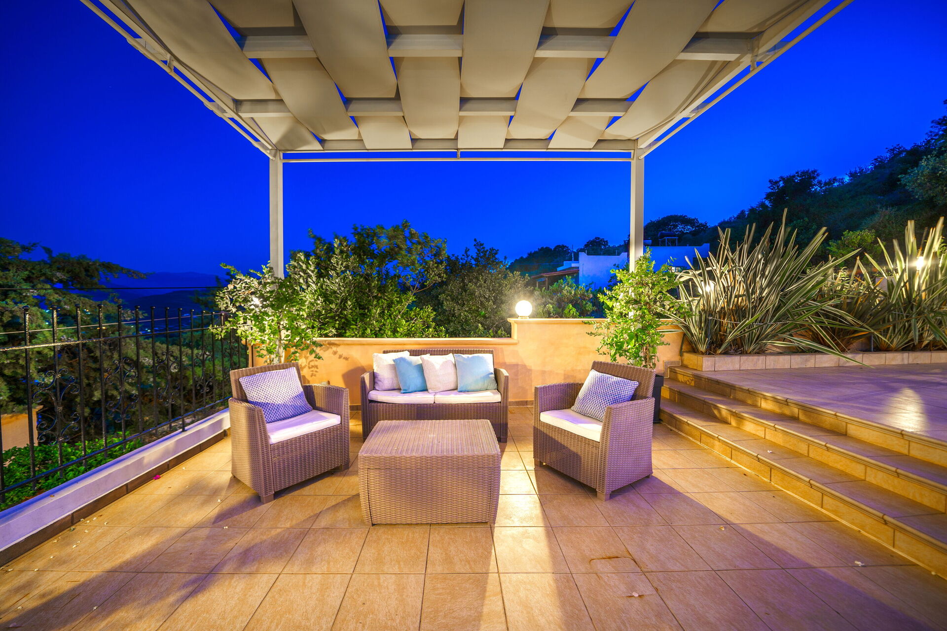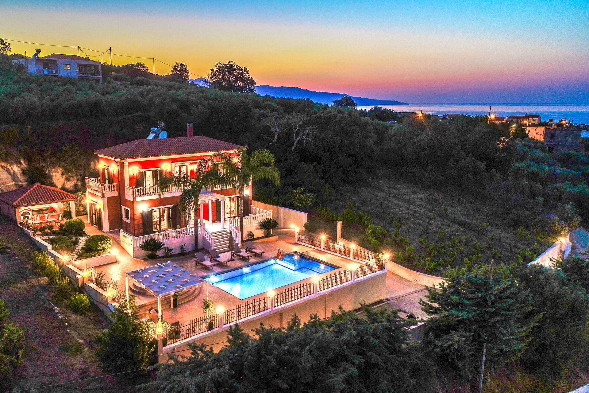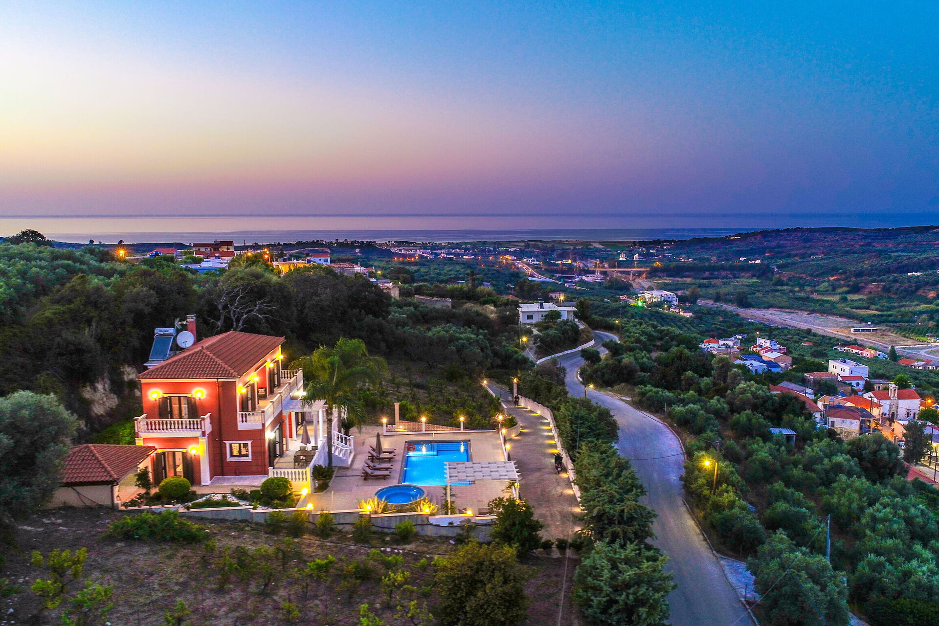 Iro Royal Villa est une belle villa avec piscine privée à louer pour des vacances en Crète: elle est située sur une colline dans la partie Ouest de la ville de La Canée et offre une belle vue panoramique.
