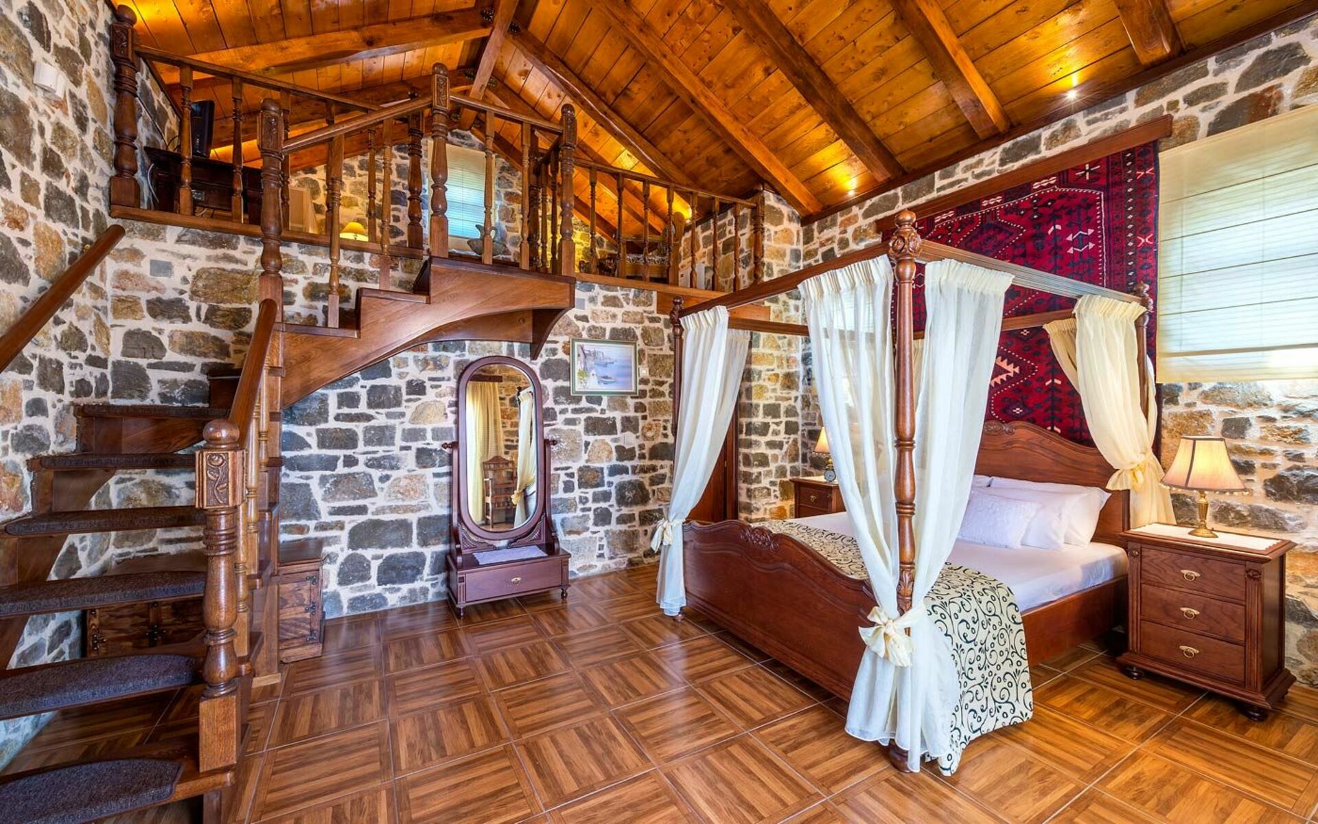 Premier étage: une grande chambre double avec salle de bains privée avec douche, accès à une terrasse privée panoramique et à une soupente avec petit salon, une chambre avec 2 lits à une place et salle de bains privée avec douche.