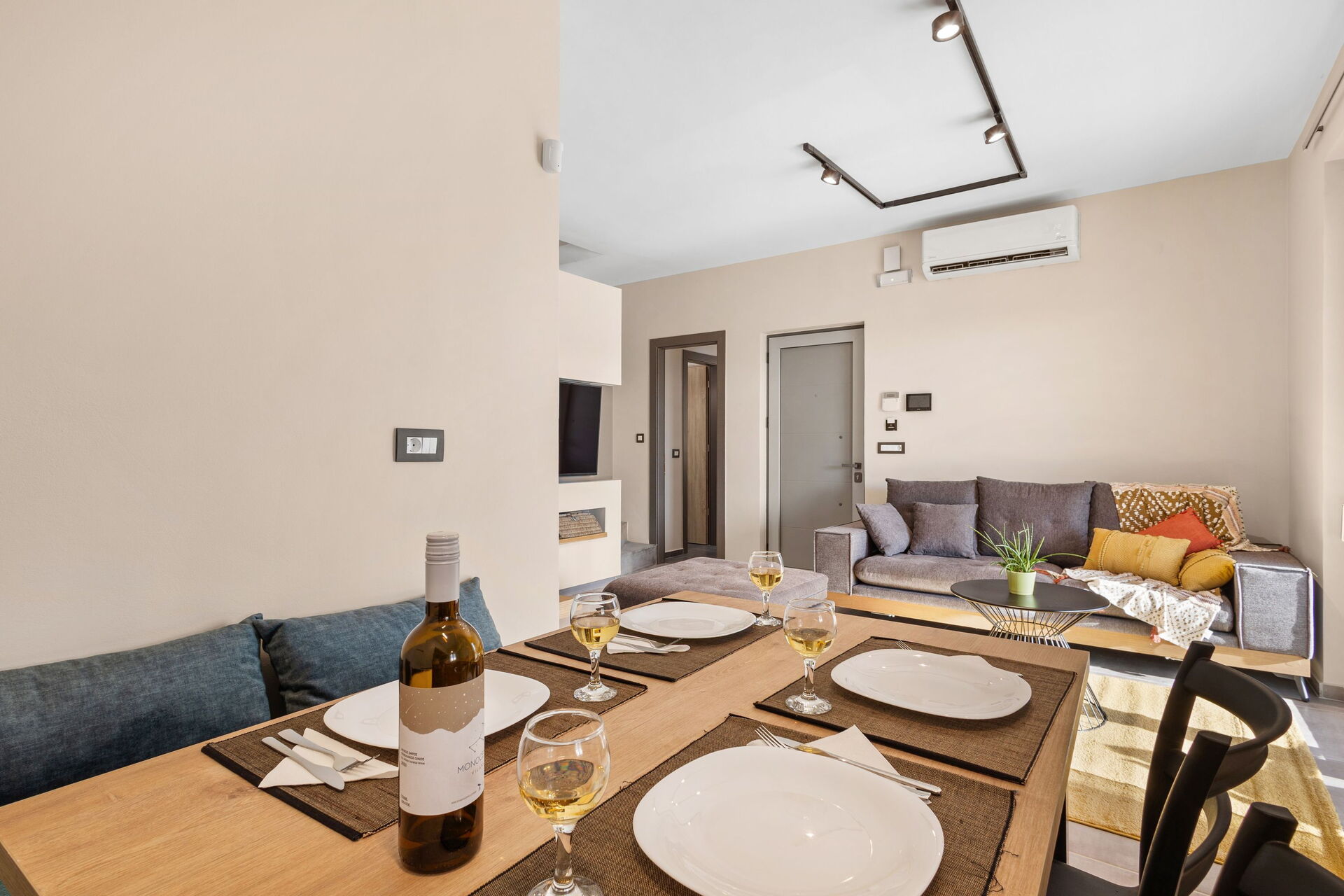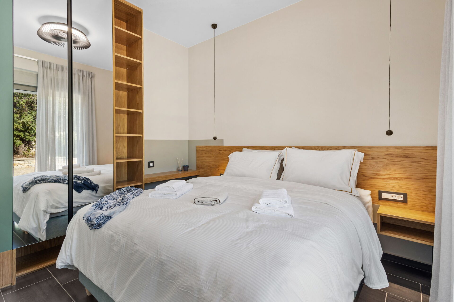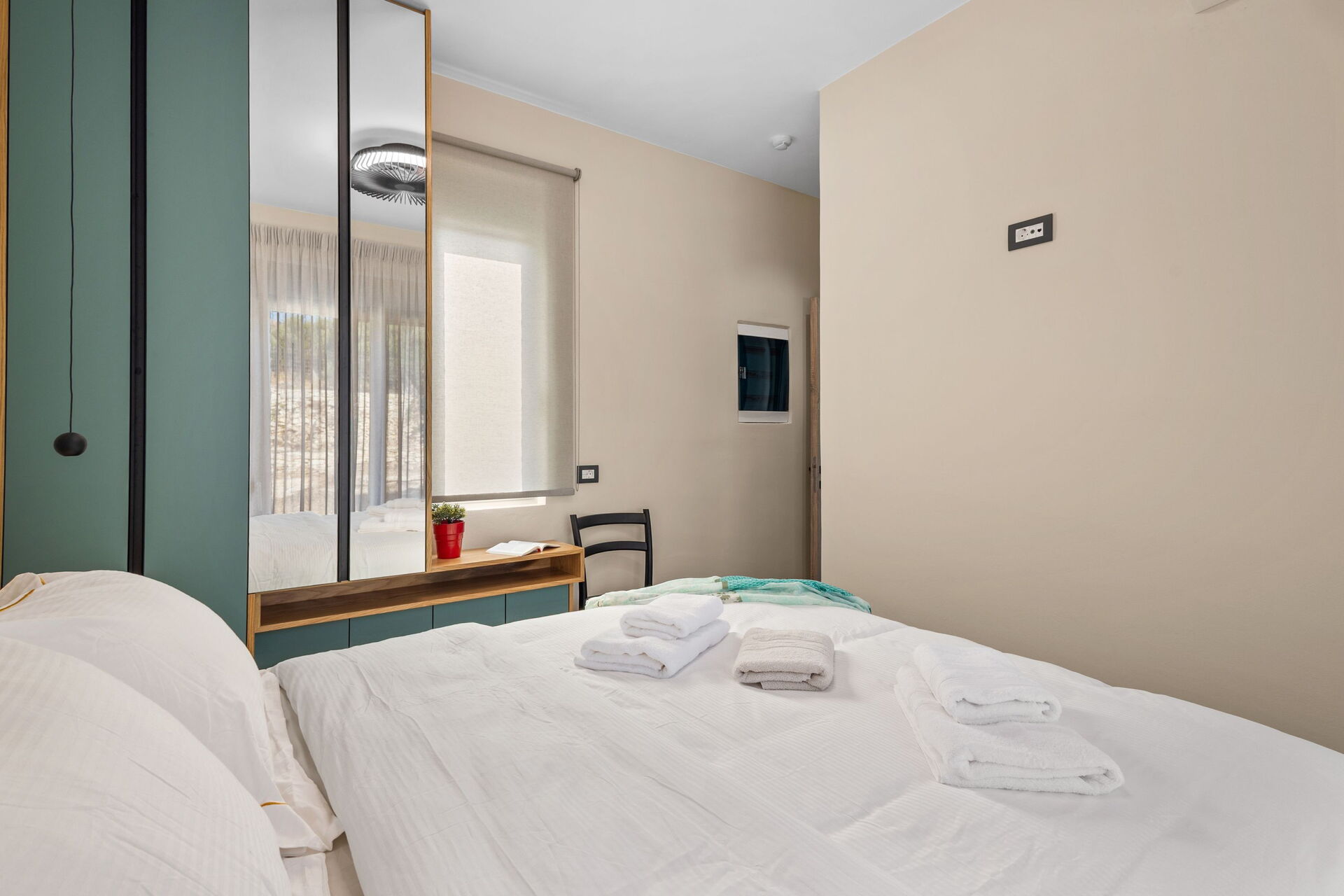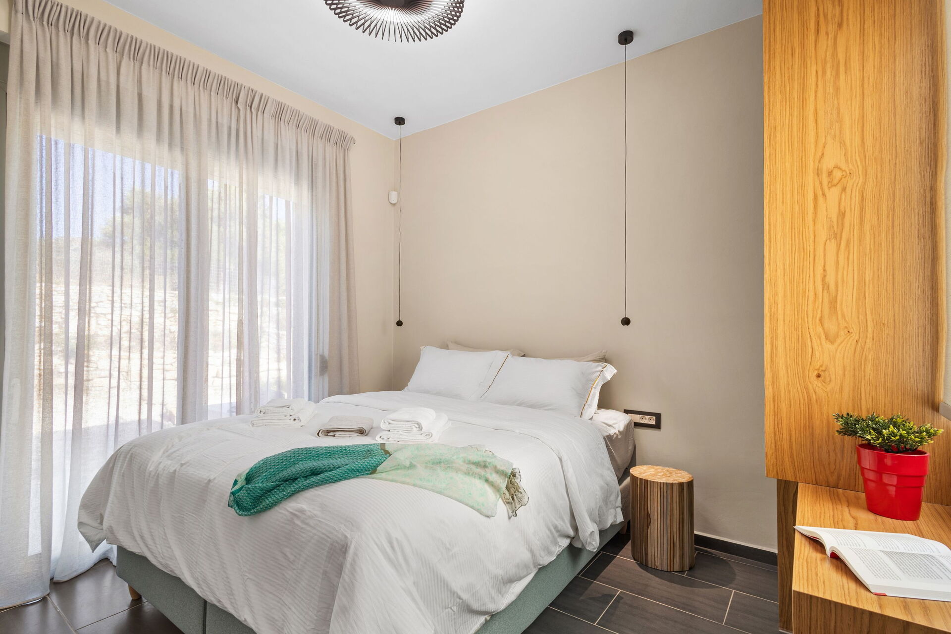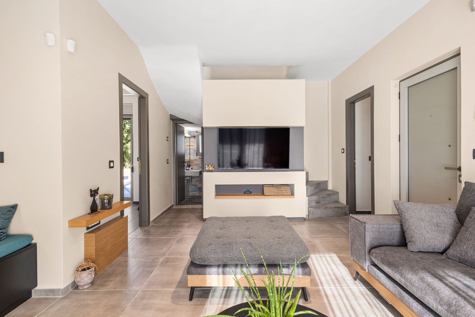La villa est très accueillante : le mobilier est de style moderne et l'ensemble de l'environnement est lumineux et confortable. Répartie sur deux étages, elle peut accueillir confortablement jusqu'à 6 personnes grâce à ses 3 chambres doubles.