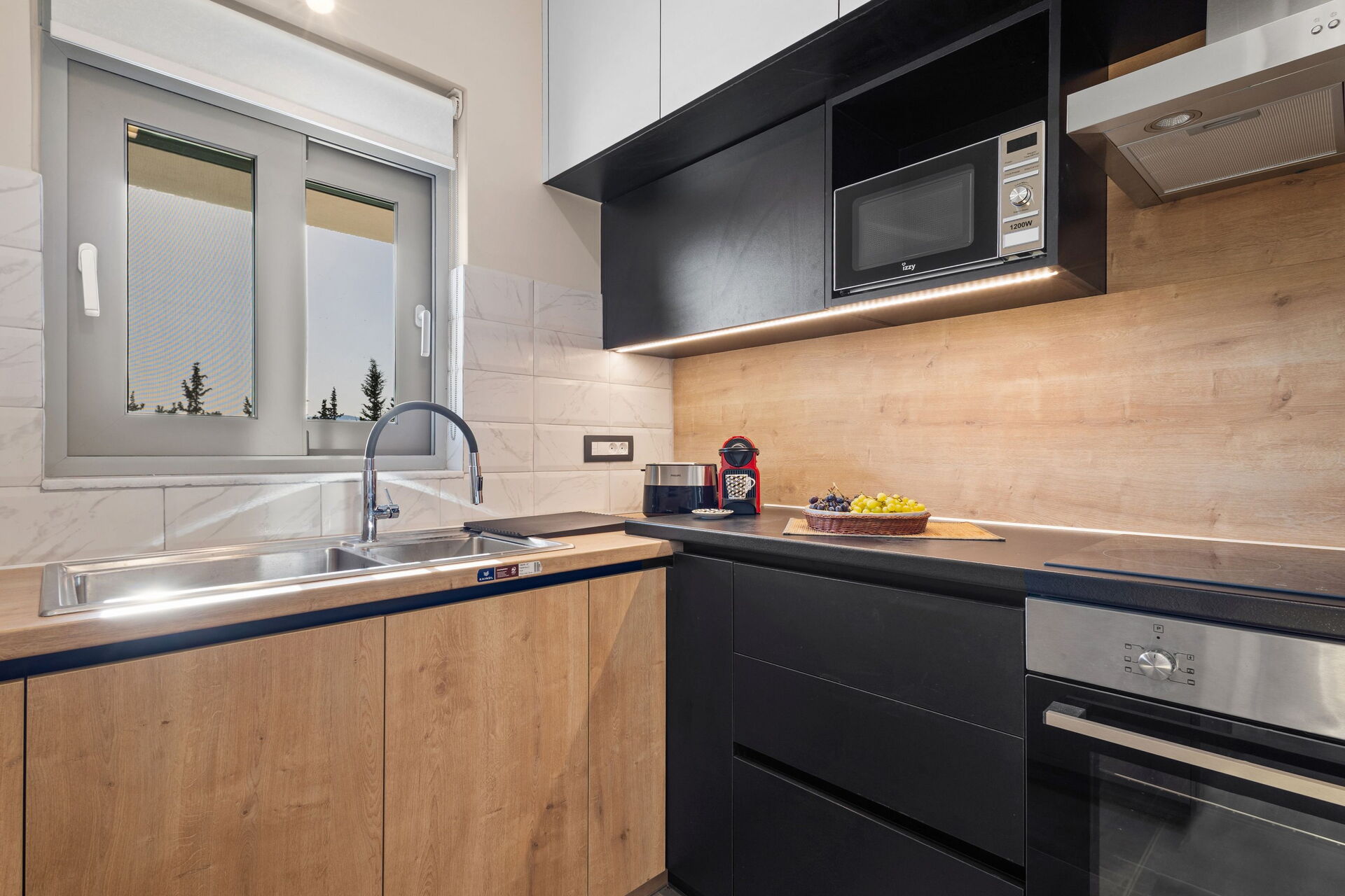 Rez-de-chaussée : séjour lumineux avec coin repas et cuisine (four, congélateur, réfrigérateur, plaque de cuisson, lave-vaisselle, micro-ondes, grille-pain, machine à café expresso), 2 chambres doubles, 2 salles de bain avec douche.