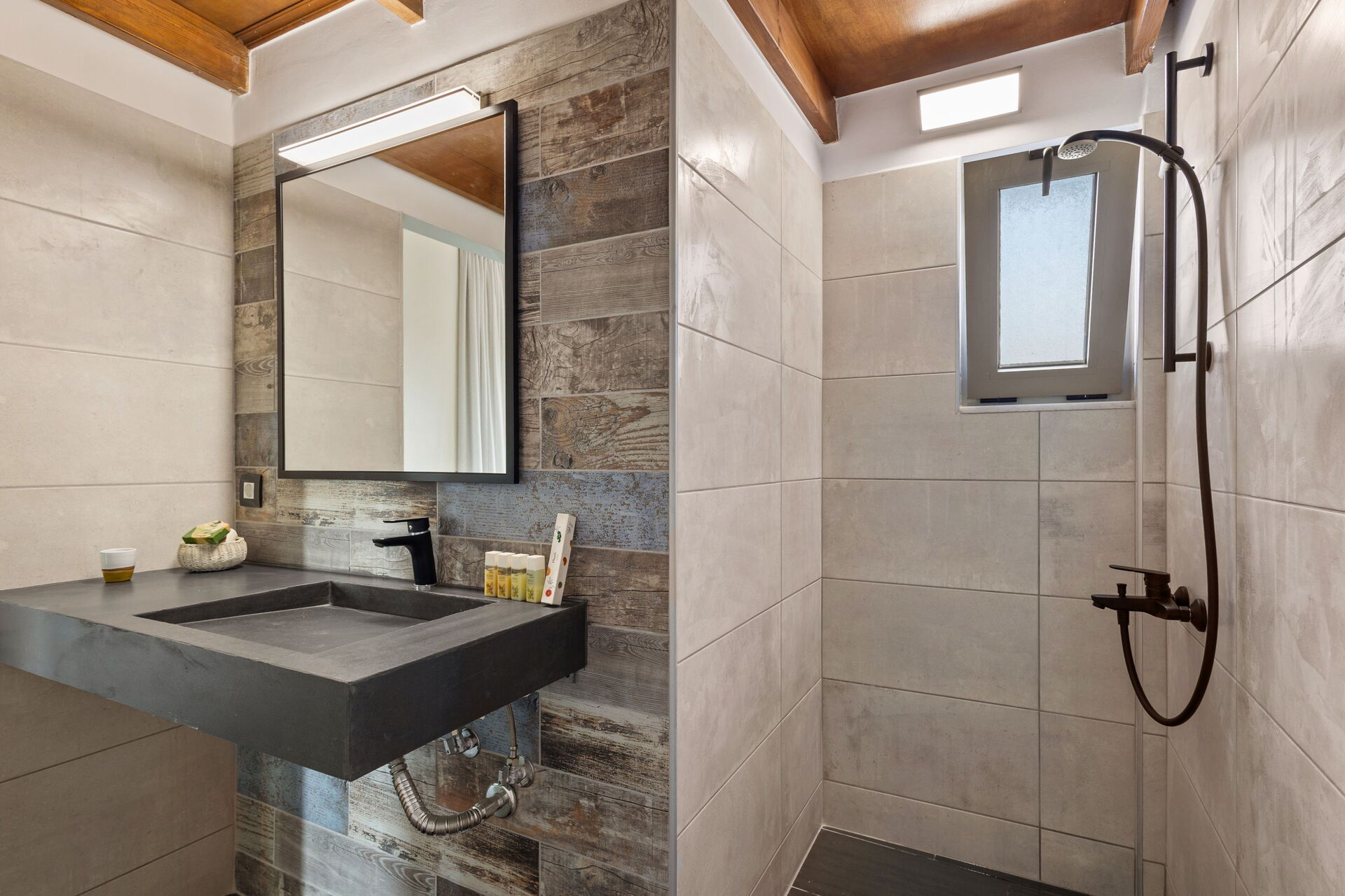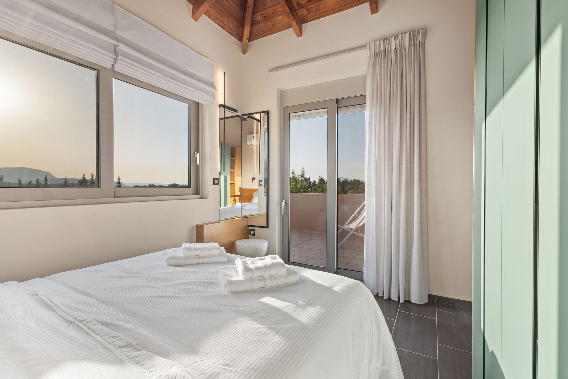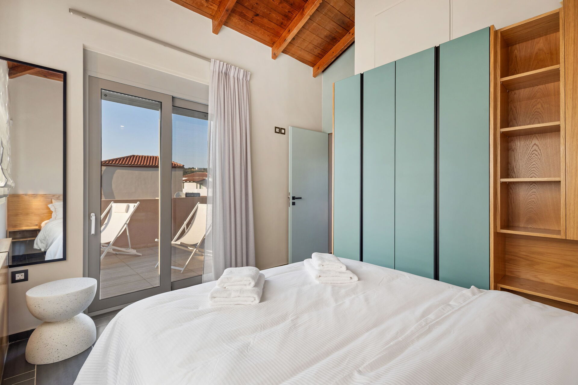 Premier étage : chambre double avec salle de bain privée avec douche, accès à la terrasse.