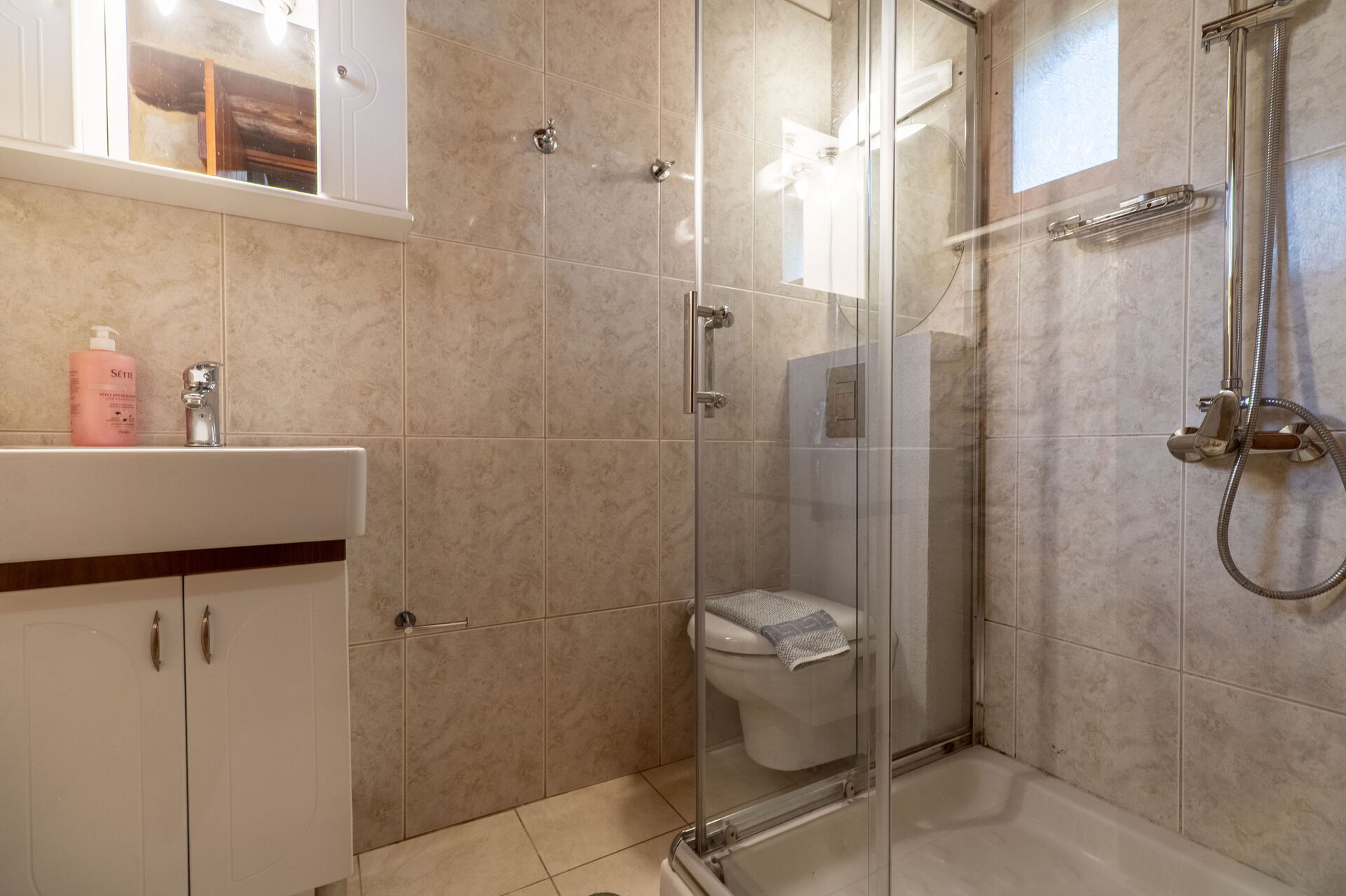 Premier étage : une chambre double (air conditionné), une chambre avec 2 lits à une place (air conditionné), salle de bains avec baignoire. Les chambres à coucher du premier étage ont accès sur une terrasse couverte d’où l’on jouit d’une belle vue sur le paysage des alentours.