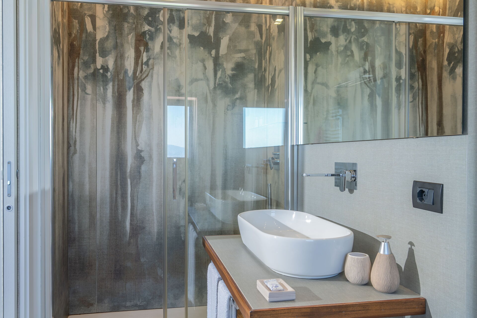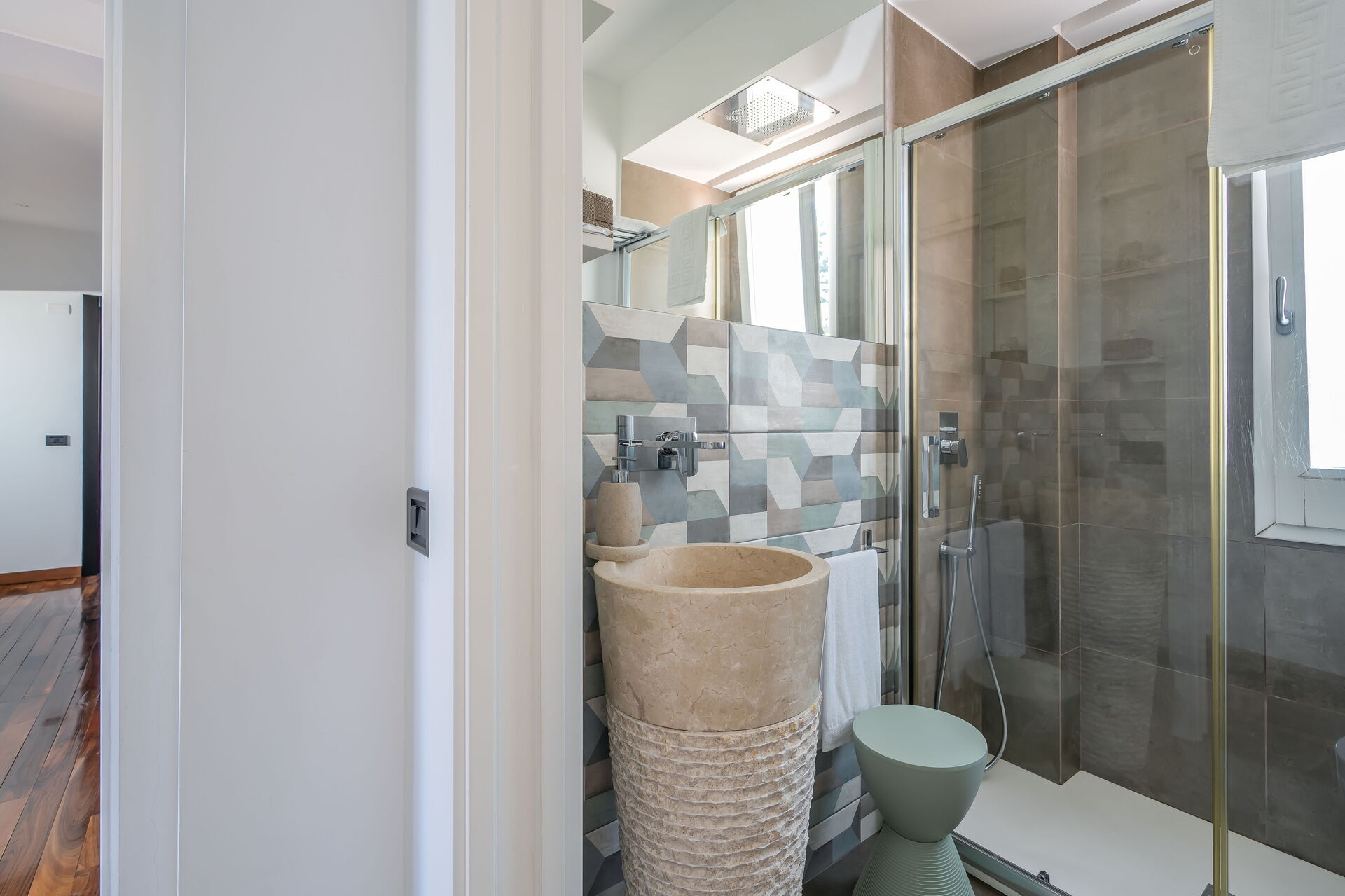 Premier étage: 2 chambres doubles toutes deux avec salle de bain privée avec douche, chambre double (sur demande le lit double peut être divisé en 2 lits simples) avec salle de bain privée avec douche, suite avec antichambre avec canapé-lit double et chambre principale avec lit double et salle de bain privée avec baignoire jacuzzi et douche. Chaque chambre dispose d'une smart TV connectée à la fibre wi-fi et d'une terrasse équipée d'une table et de chaises (deux terrasses ont vue sur la mer et deux sur le jardin et la piscine).