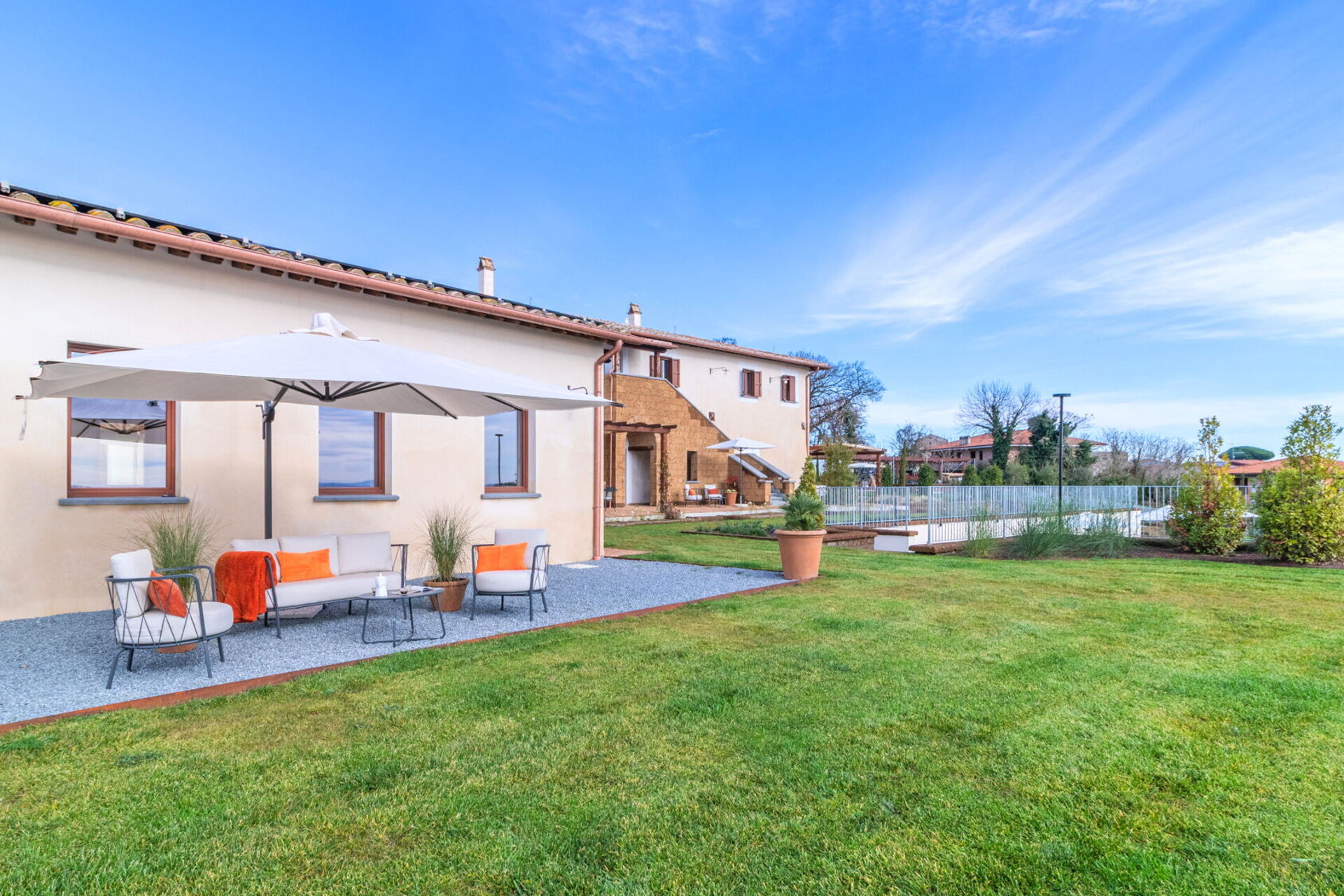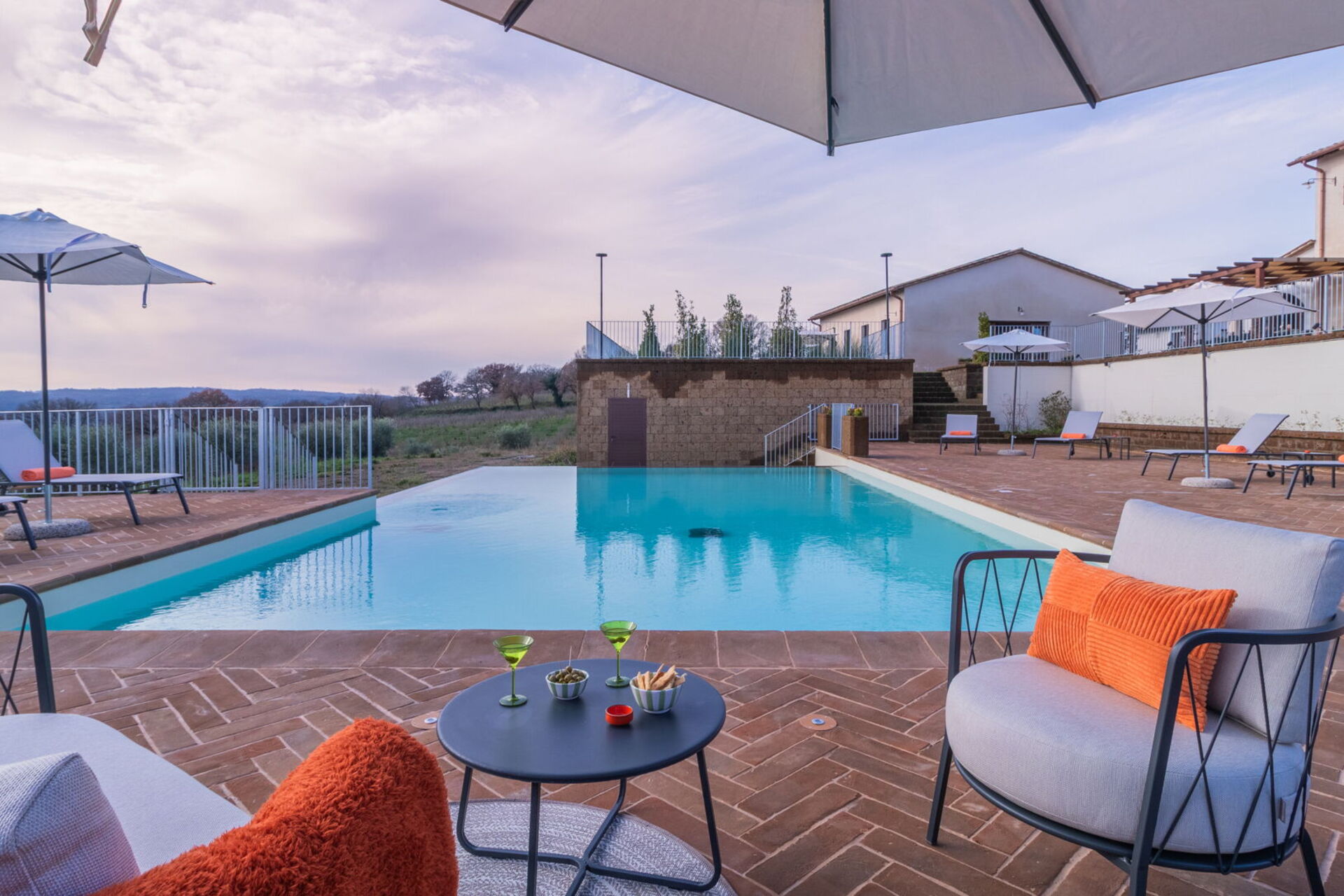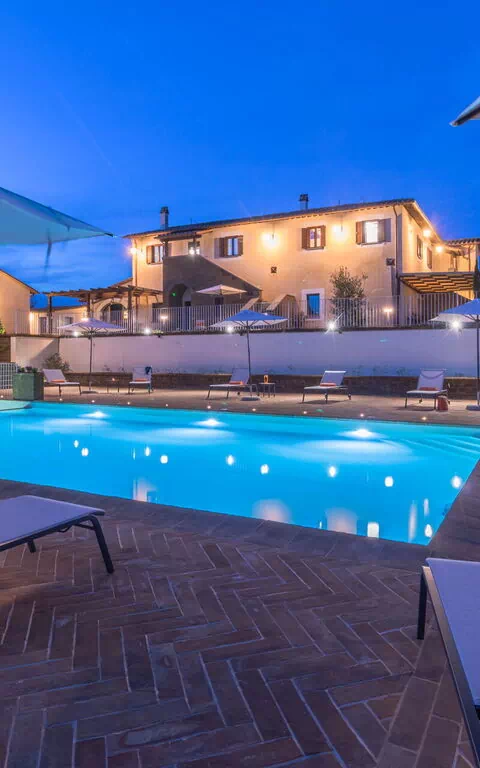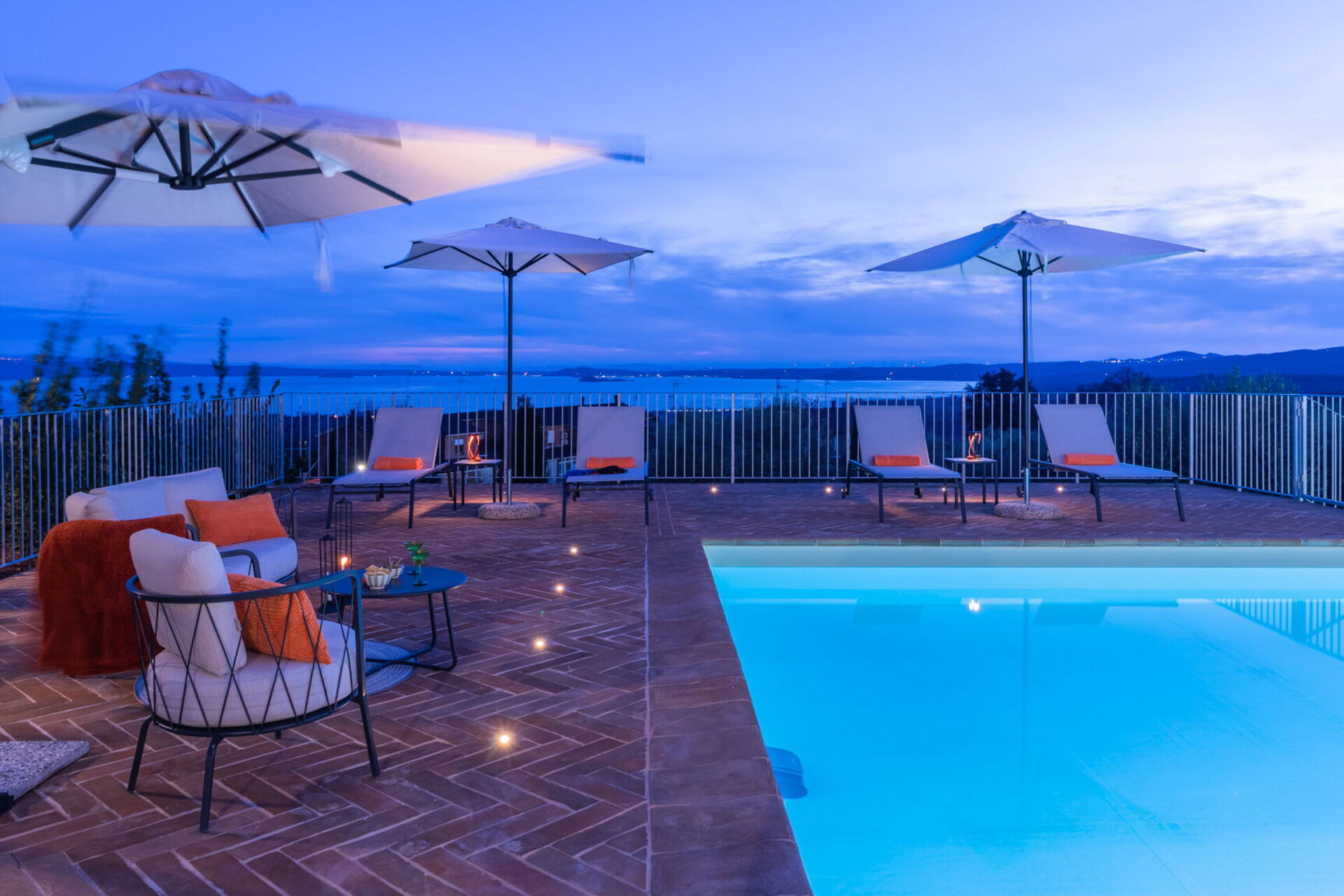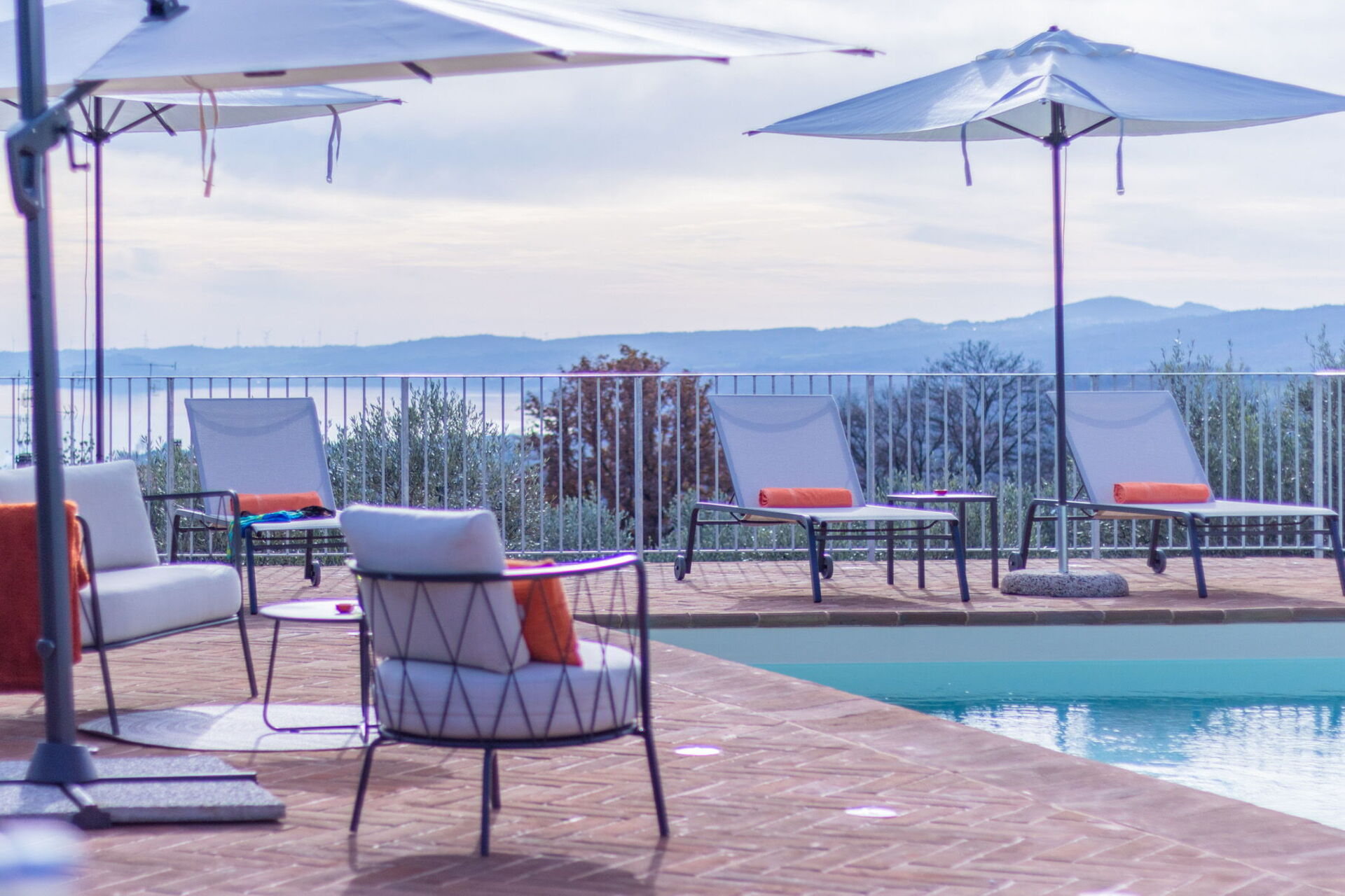 À l’extérieur, Tenuta Poggio Guiano dispose d’un jardin soigneusement entretenu dont la superficie totale est d’environ 2.000 m², accueillant une très belle piscine avec vue sur le lac de Bolsena et réservée à l’usage exclusif des hôtes: la piscine se trouve en position panoramique et avec la véranda équipée pour les repas en plein air elle constitue l’endroit idéal pour passer les journées estivales ensoleillées, se détendre et se rafraîchir en compagnie d’amis et de la famille.