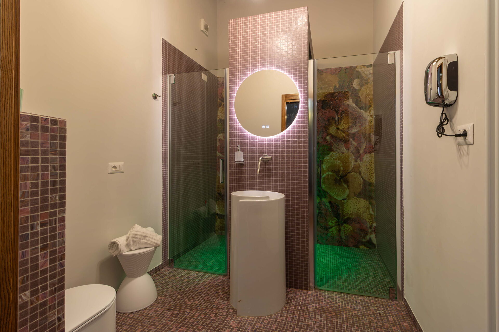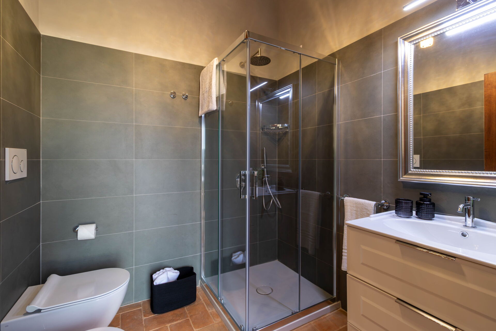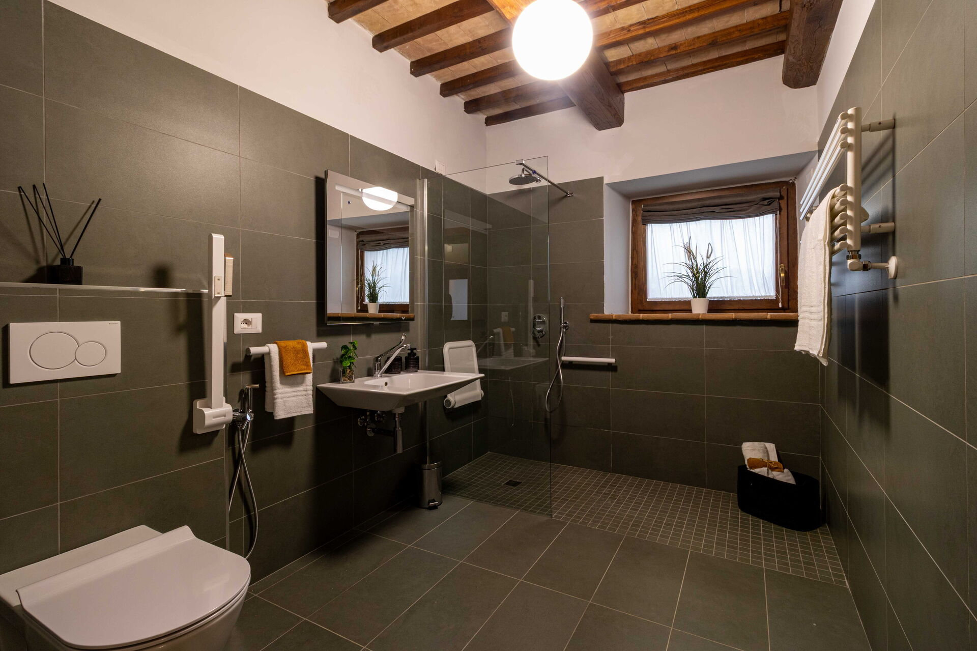 Rez-de-chaussée (non reliée intérieurement aux autres unités): chambre avec lit à la française avec salle de bain privée avec douche à l’italienne (sans fenêtre, idéale pour les personnes à mobilité réduite et les personnes en situation d’handicap).