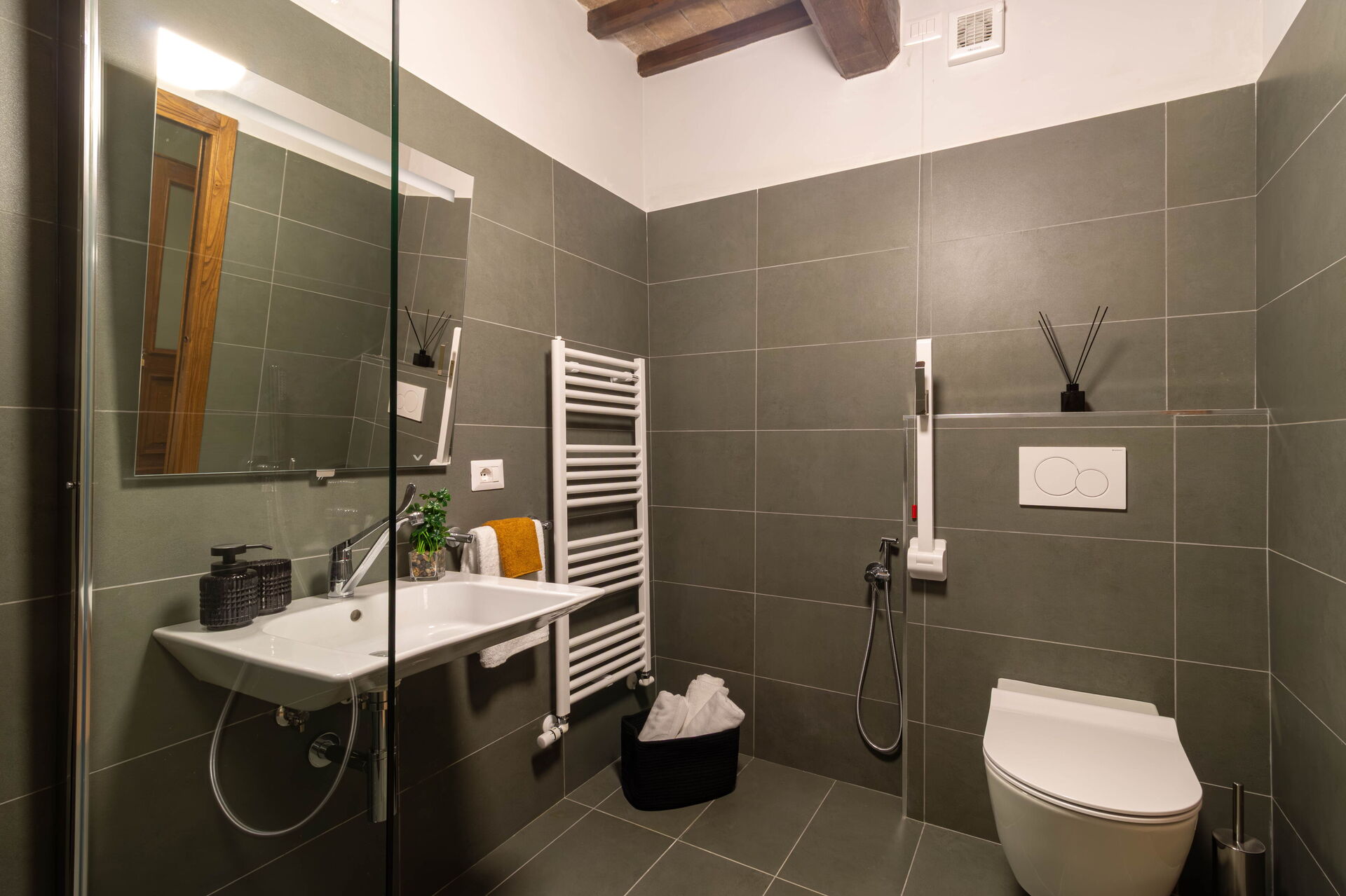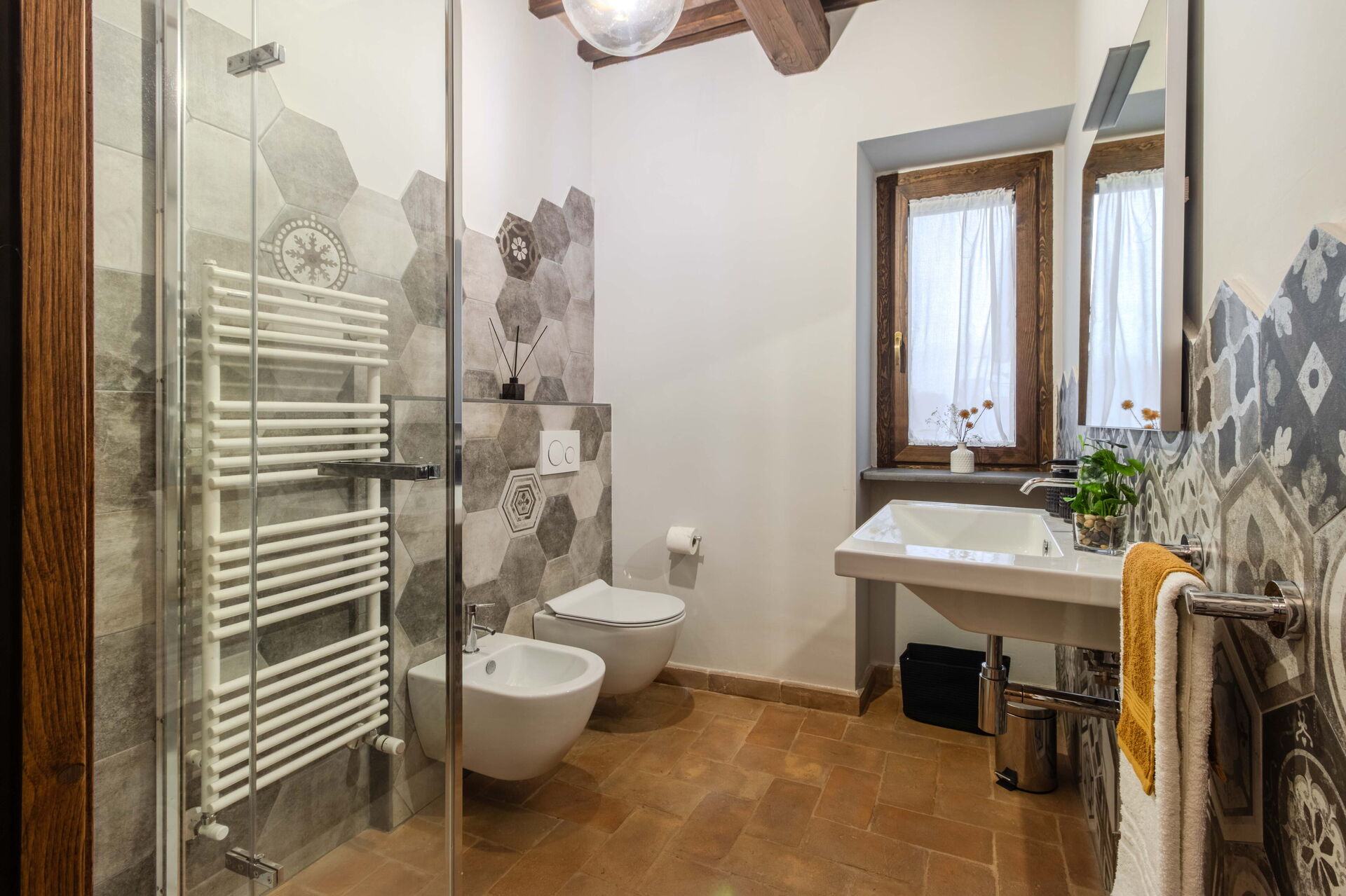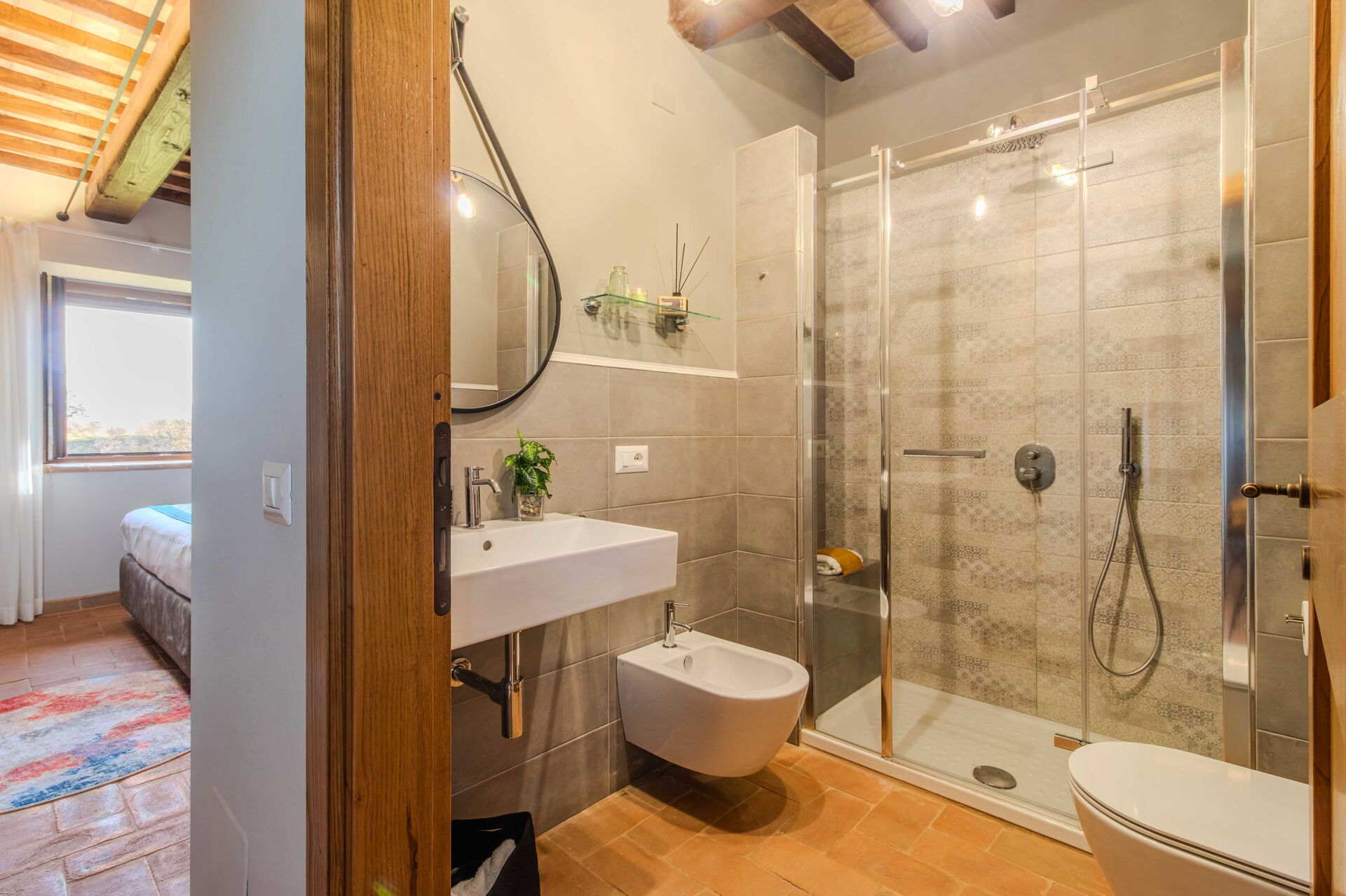 Rez-de-chaussée (non reliée intérieurement aux autres unités): chambre avec lit à la française avec salle de bain privée avec douche à l’italienne (sans fenêtre, idéale pour les personnes à mobilité réduite et les personnes en situation d’handicap).