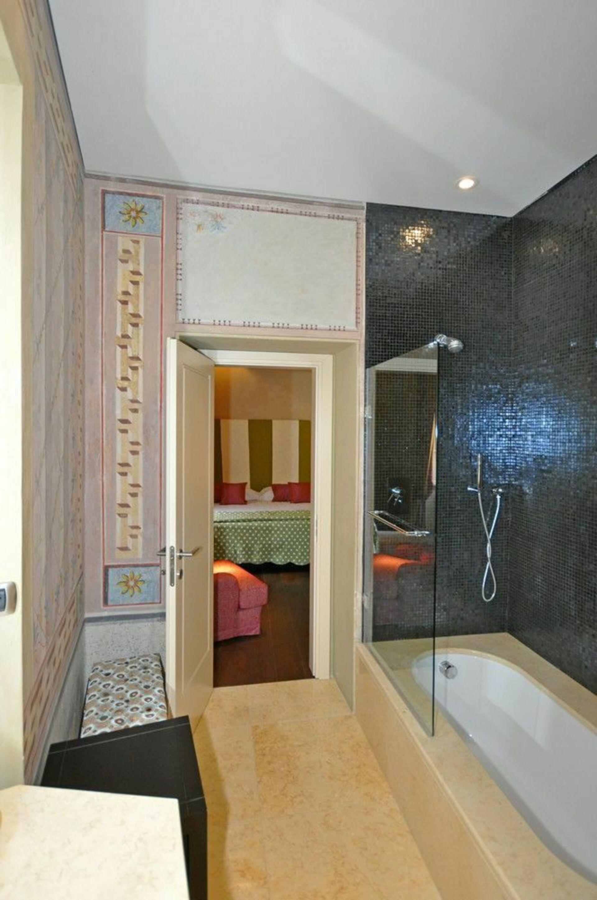 4 marches plus haut : une chambre double avec salle de bains privée avec baignoire/douche.
