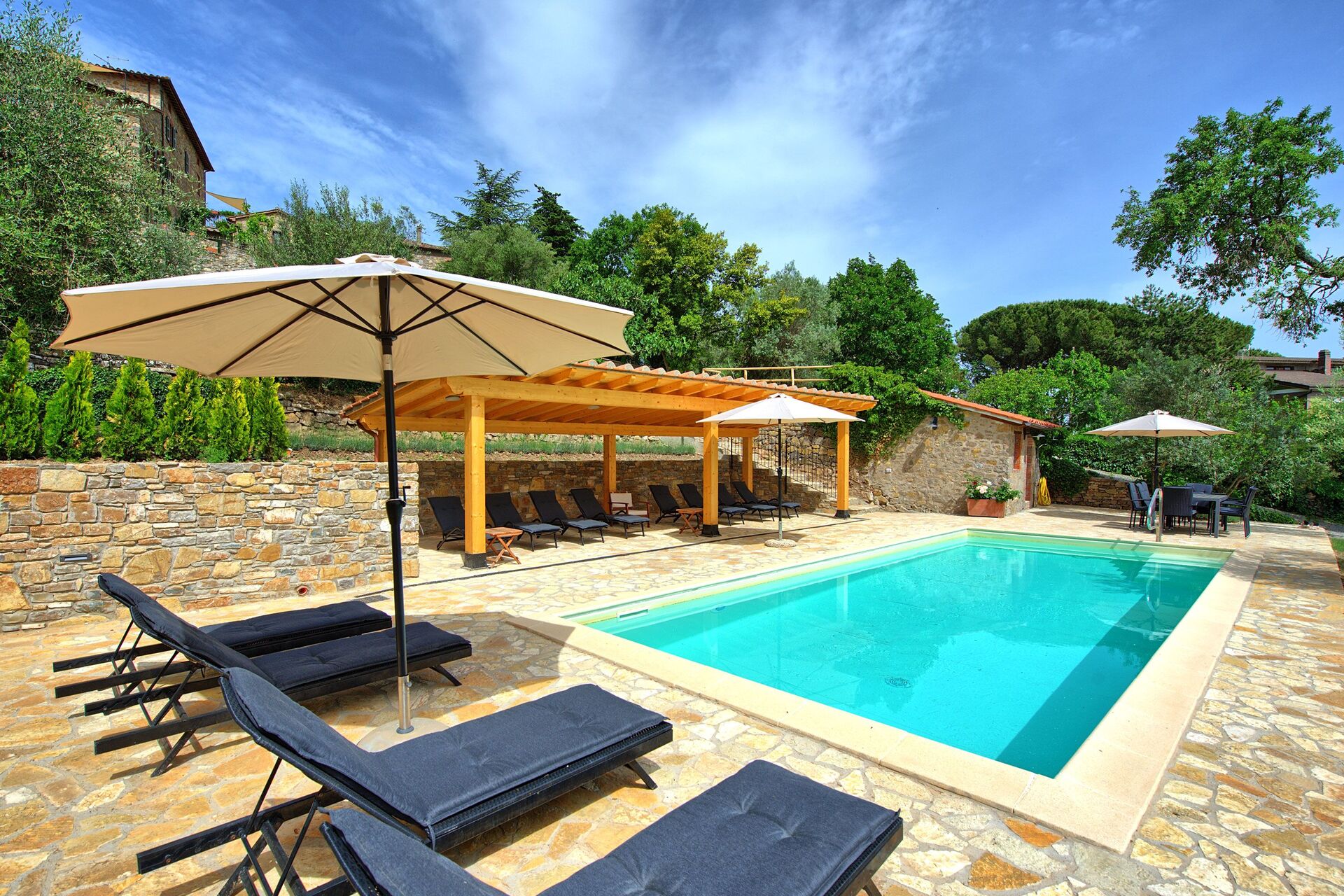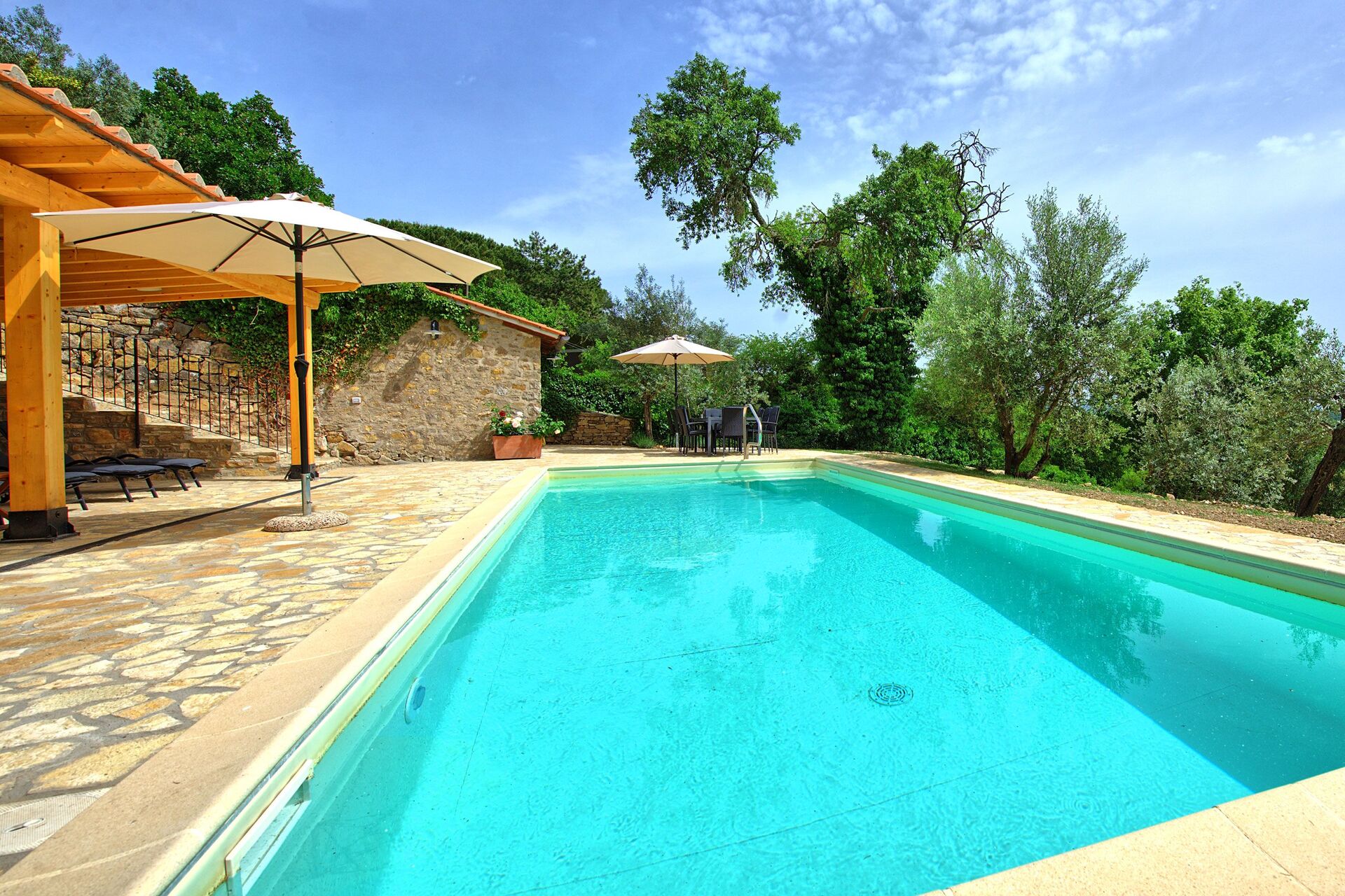 La maison est située dans un village mais dispose d'un grand jardin qui se développe sur le flanc d’une colline et descend vers une piscine privée en position panoramique.