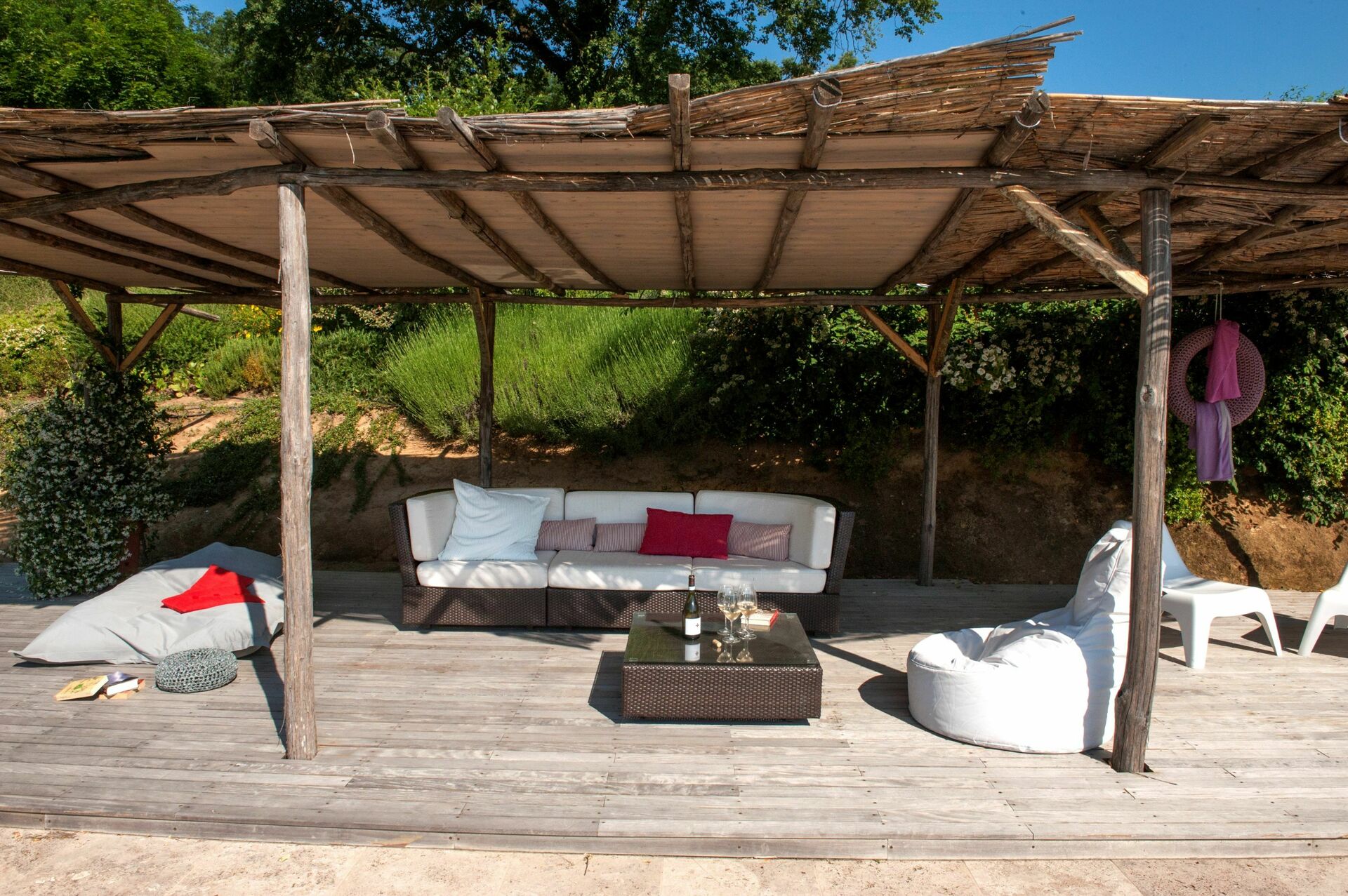 Jardin bien entretenu avec piscine privée et chauffée par énergie solaire (7 x 14m – prof. : 1,20/2,20m), chaises longues et zones ombragées avec canapés et petits fauteuils.