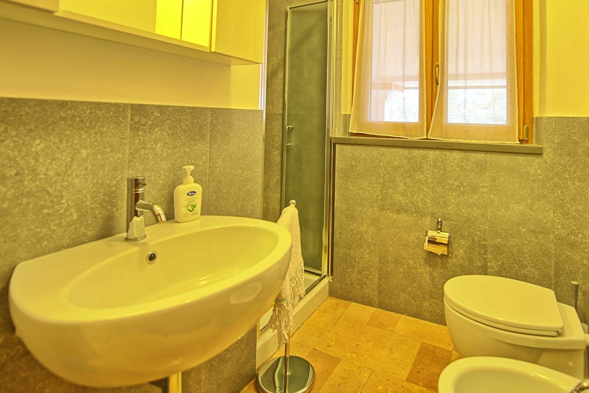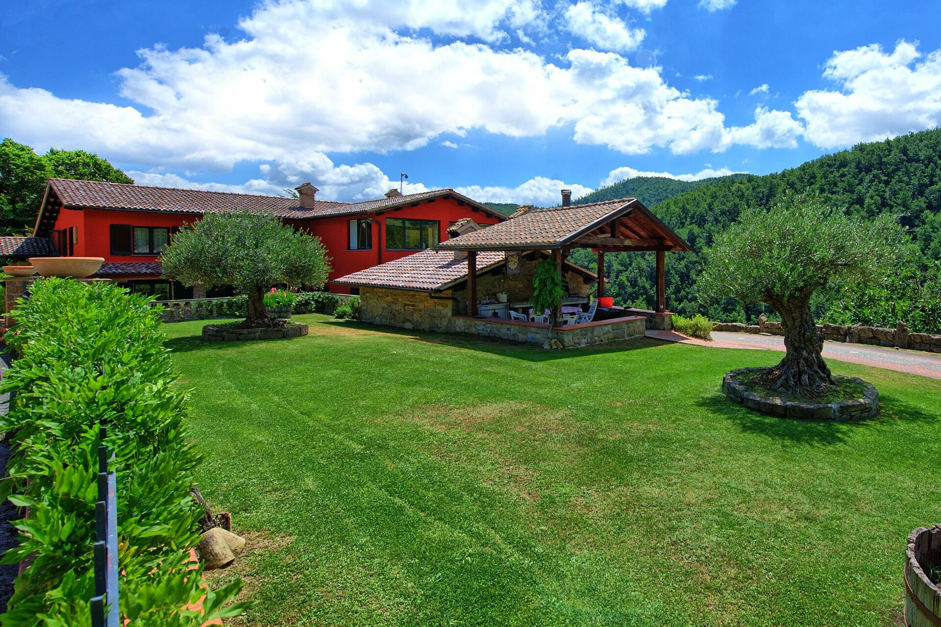 The Villa itsel has 5 bedrooms and 3 bathrooms, two kitchens and dining areas. The kitchens are completely stocked with anything and everything a cook will need for meal preparation and there is an outdoor room and patio area for those who like to grill. The bedrooms are well appointed and everyone in the family felt they slept well and long, sometimes too long when planning for a day trip! The bathrooms are each lovely and either have a shower or a tub. The property itself is a paradise in the hills, but still only 5 minutes away from town. Our family loved the fact that there is a really friendly dog who "owns" the property and kept our grandkids entertained as well as giving them a job to feed him!. There were also some new kittens to entertain us. What an absolutely lovely 3 weeks we experienced. We want to thank Oliver and his wife and Carlo for the kindness, assistance and guidance they provided! This is a wonderful family who totally made us feel at home and welcomed! Every need or question was taken care of. Carlo even helped us find a chef who would cook osso bucco for our son-in-law!