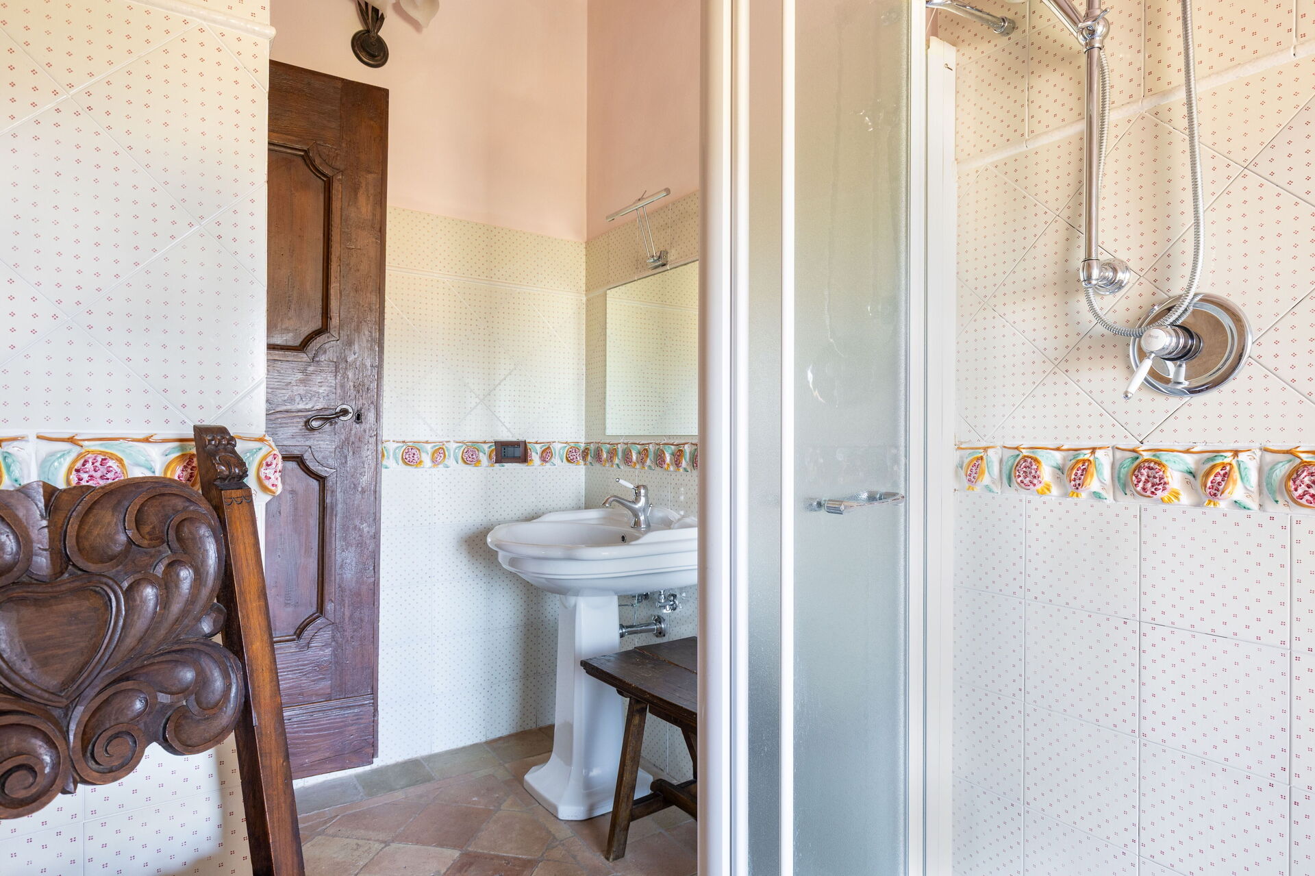 Premier étage : grande suite avec coin séjour, grand lit, un lit à une place adapté à un enfant, accès sur 2 terrasses panoramiques et salle de bains privée avec douche, une chambre de passage avec 2 lits à une place, salle de bains avec douche et accès à une chambre double avec terrasse d’où l’on jouit d’une belle vue sur Assise.