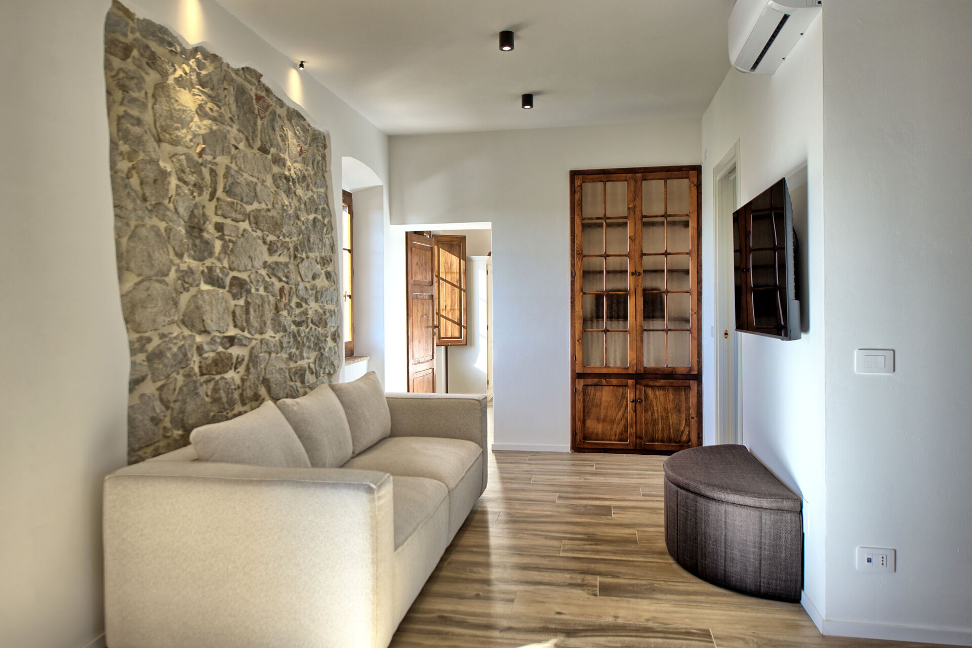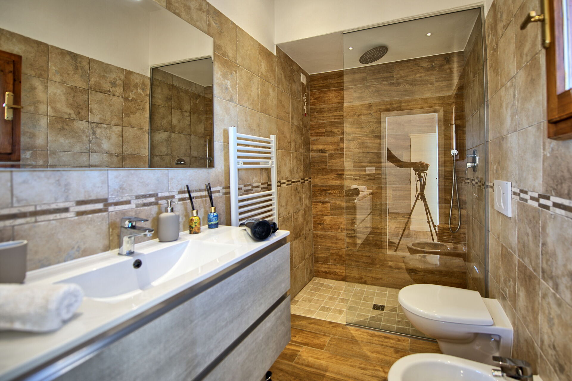 Premier étage: salon avec Smart-TV, chambre double, salle de bain avec douche, chambre avec lit double + lit simple avec salle de bain privée et douche ainsi qu’accès à une terrasse panoramique privée.
