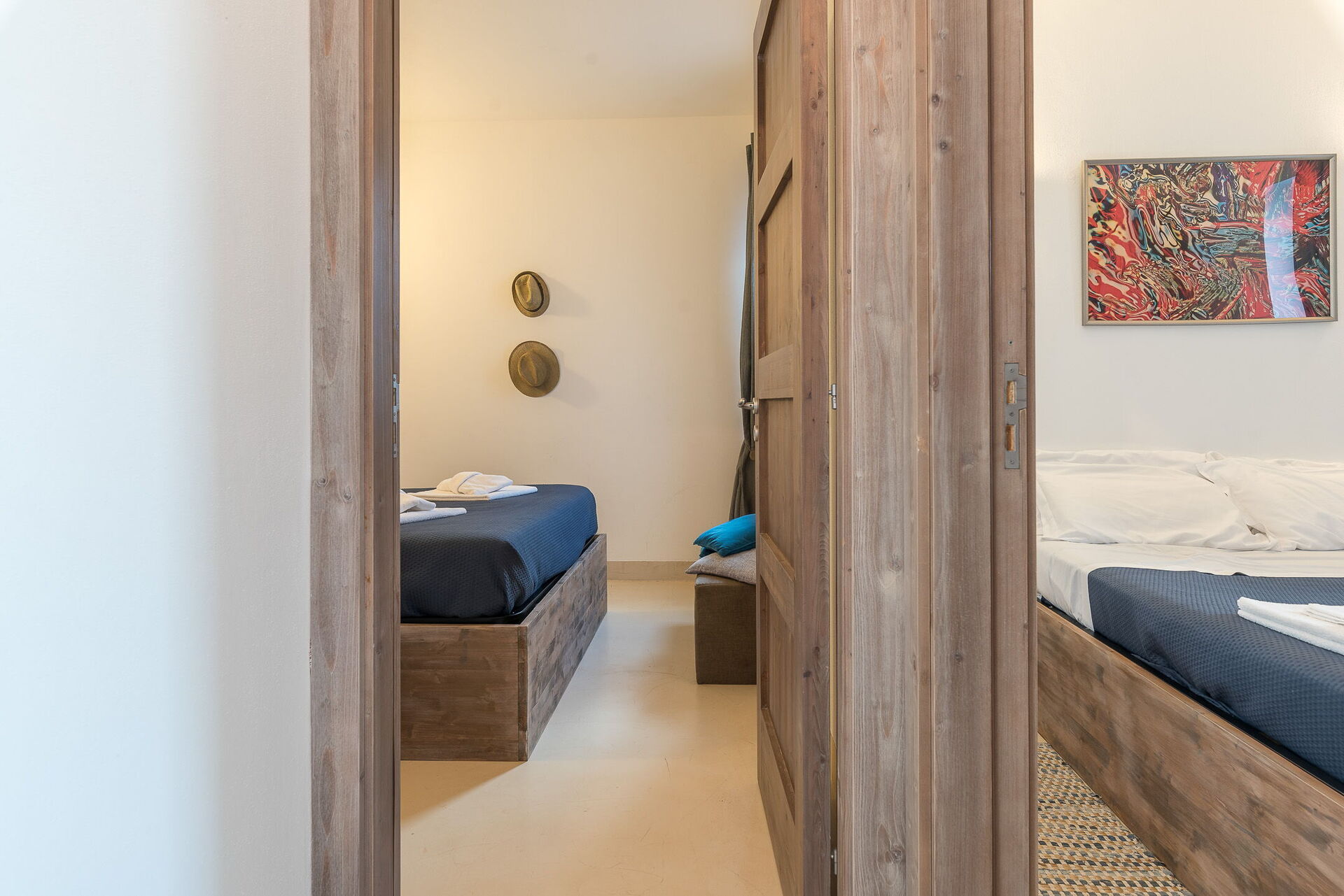 Premier étage: une chambre double avec accès sur deux terrasses panoramiques, salle de bains avec douche.
