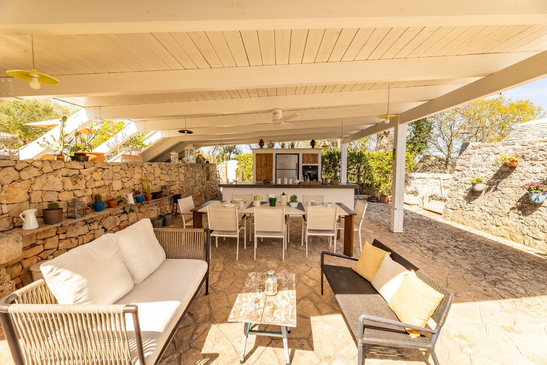 La merveilleuse villa à louer est une combinaison parfaite de tradition et de modernité. Grâce aux 5 chambres, elle peut accueillir jusqu’à 10 personnes. La structure, composée de 2 bâtiments indépendants (un Trullo et une Lamia), est la solution idéale pour passer des vacances entre amis ou en famille.