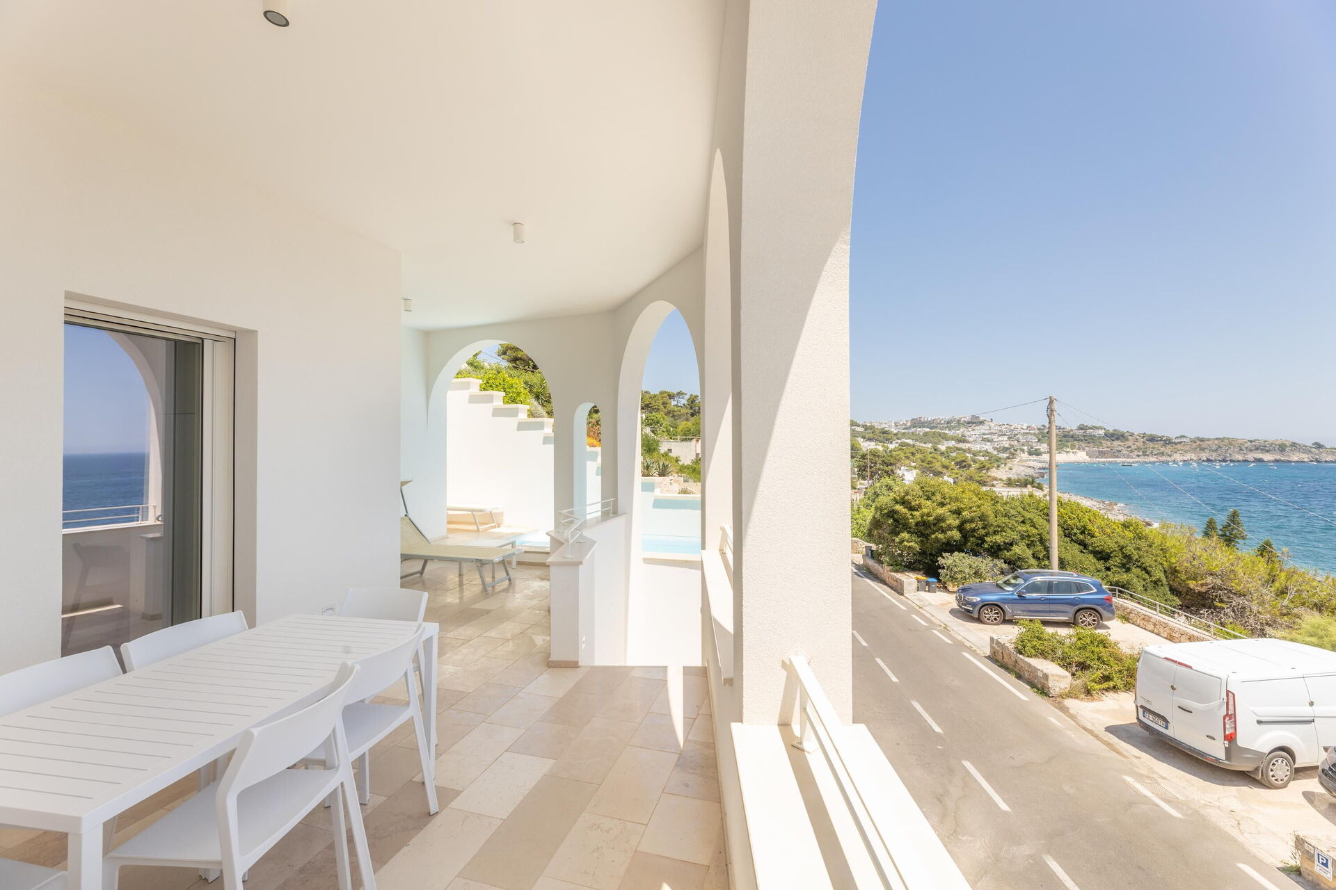 La propriété dispose d'une terrasse panoramique couverte avec de grandes ouvertures en arc, équipée d'une table et de chaises pour les repas en plein air, ainsi qu’une piscine privée (chauffable au printemps et en automne, inclus dans le prix) offrant une vue agréable sur la mer bleue des Pouilles.