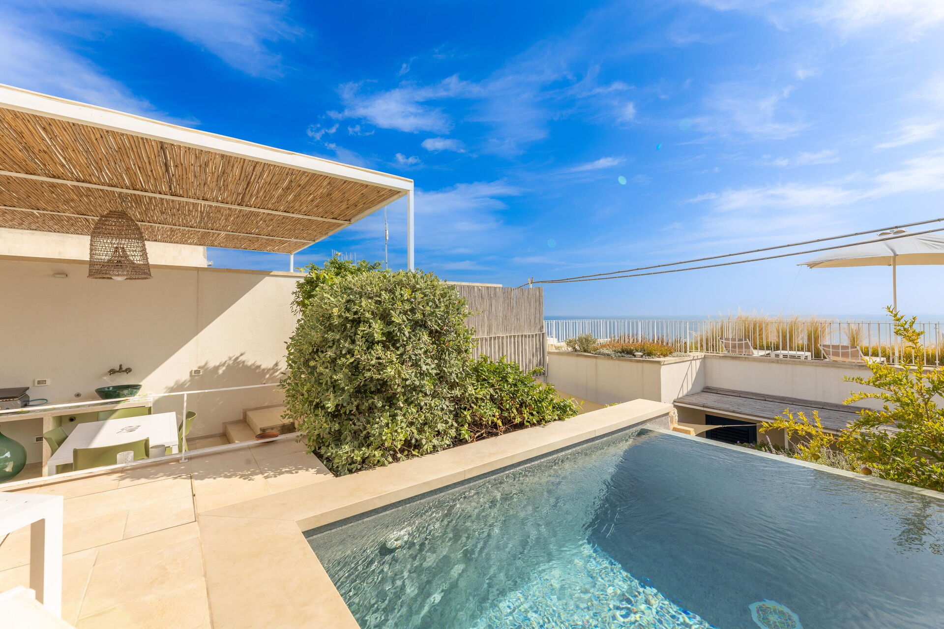 À l'extérieur, vous trouverez une piscine privée qui sera une excellente alternative à la plage, idéale pour se rafraîchir durant les journées italiennes ensoleillées, ainsi qu’une terrasse-solarium panoramique donnant sur la mer et équipée de chaises longues et de parasols. Un espace équipé de tables et de chaises sera l'endroit idéal pour profiter de repas en extérieur et organiser des dîners sous les étoiles.