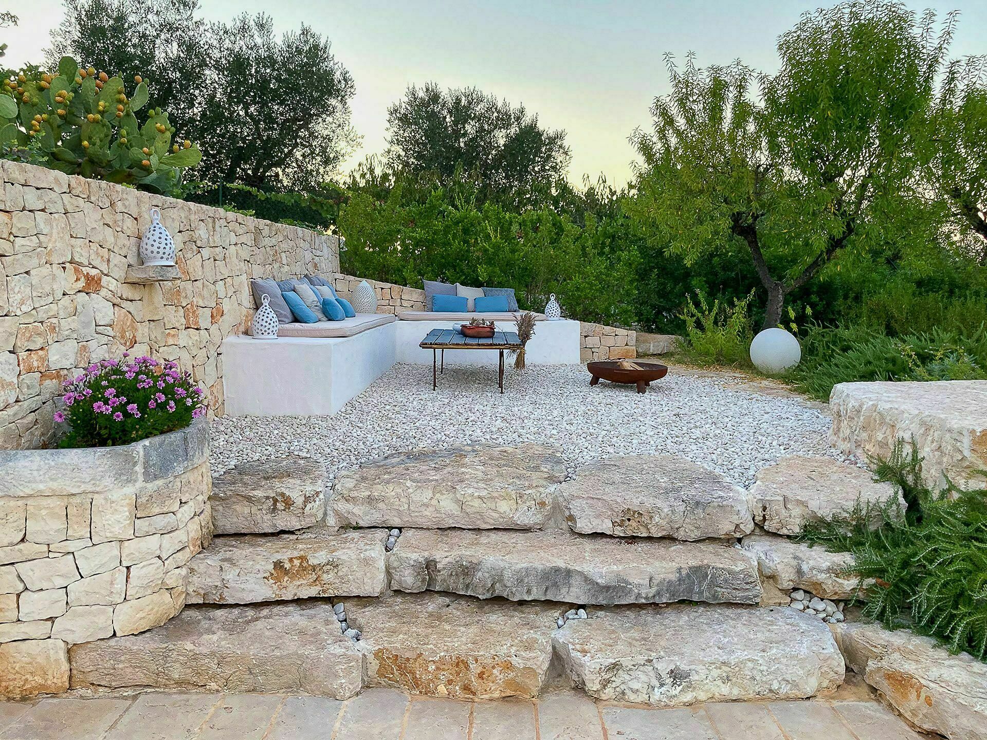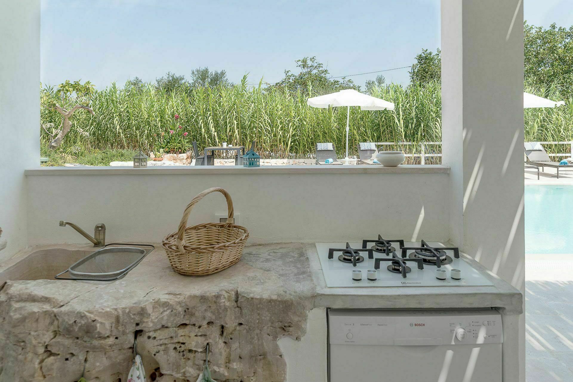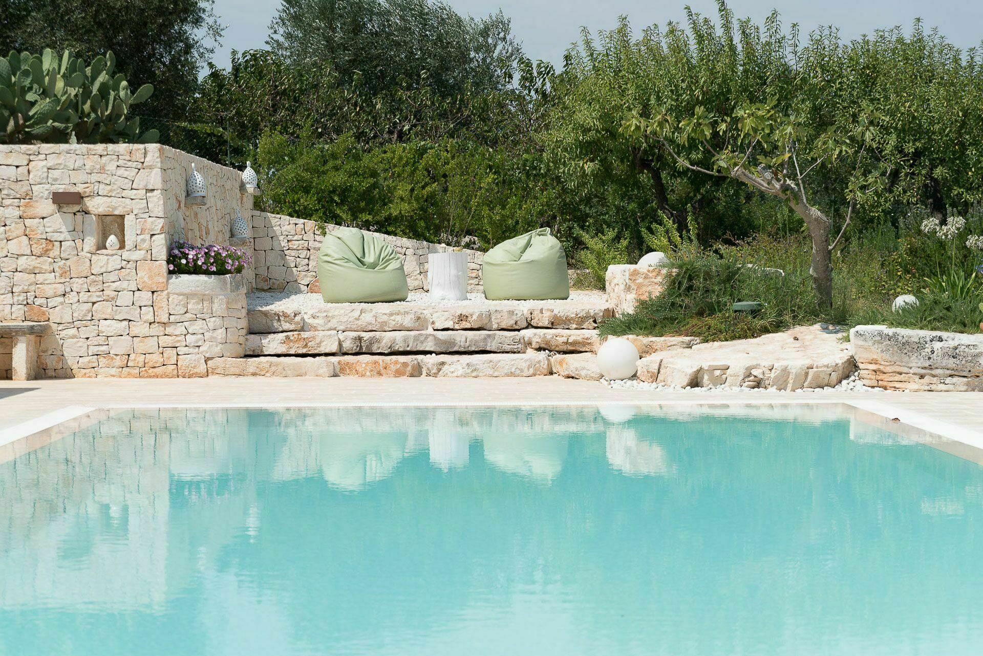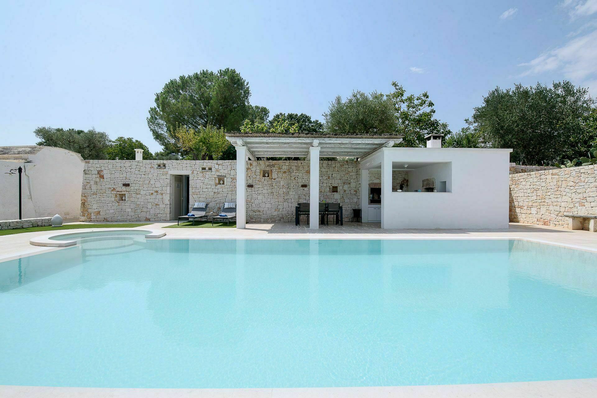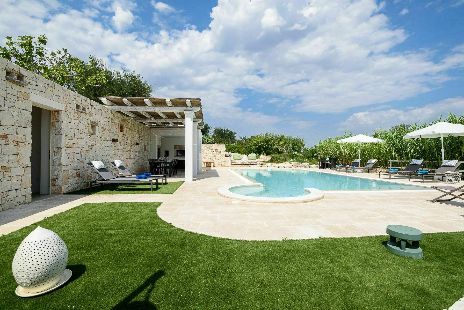 Un grand jardin bien entretenu entoure la propriété. Derrière la villa et entourée d'un beau gazon à l’anglaise, une magnifique piscine au sel (escalier romain et zone jets massants) pour des bains relaxants et des chaises longues pour profiter du soleil et de la tranquillité des Pouilles. Proche de la piscine, une grande véranda avec cuisine extérieure dotée de lave-vaisselle, four à bois, barbecue et zone repas. Un endroit idéal pour de bonnes grillades en famille ou entre amis. A proximité de la véranda, une zone détente avec sièges en pierre. A côté de "La Lamia", caractéristique pergola avec table et chaises pour se détendre en admirant la magnifique campagne du Salento.