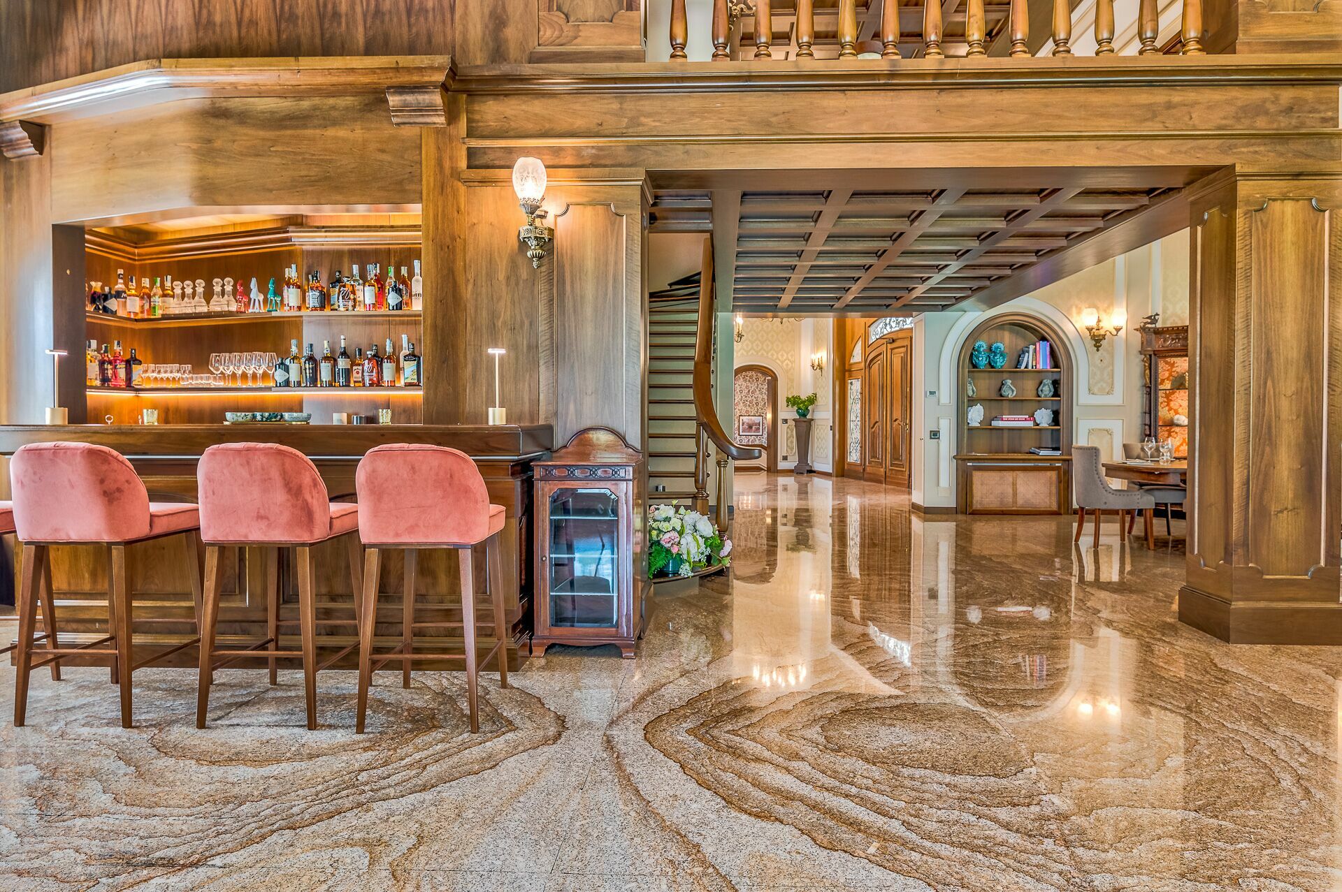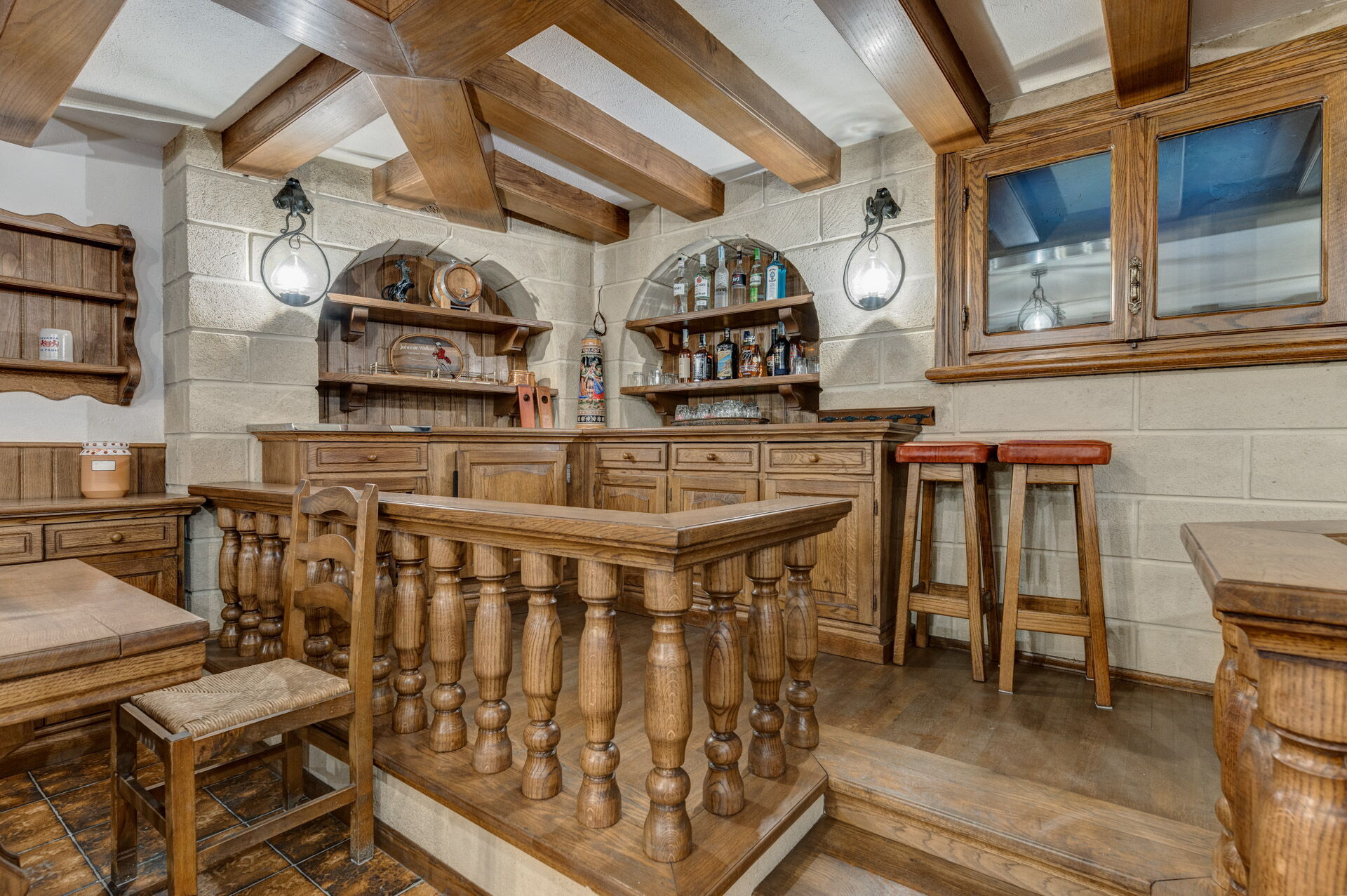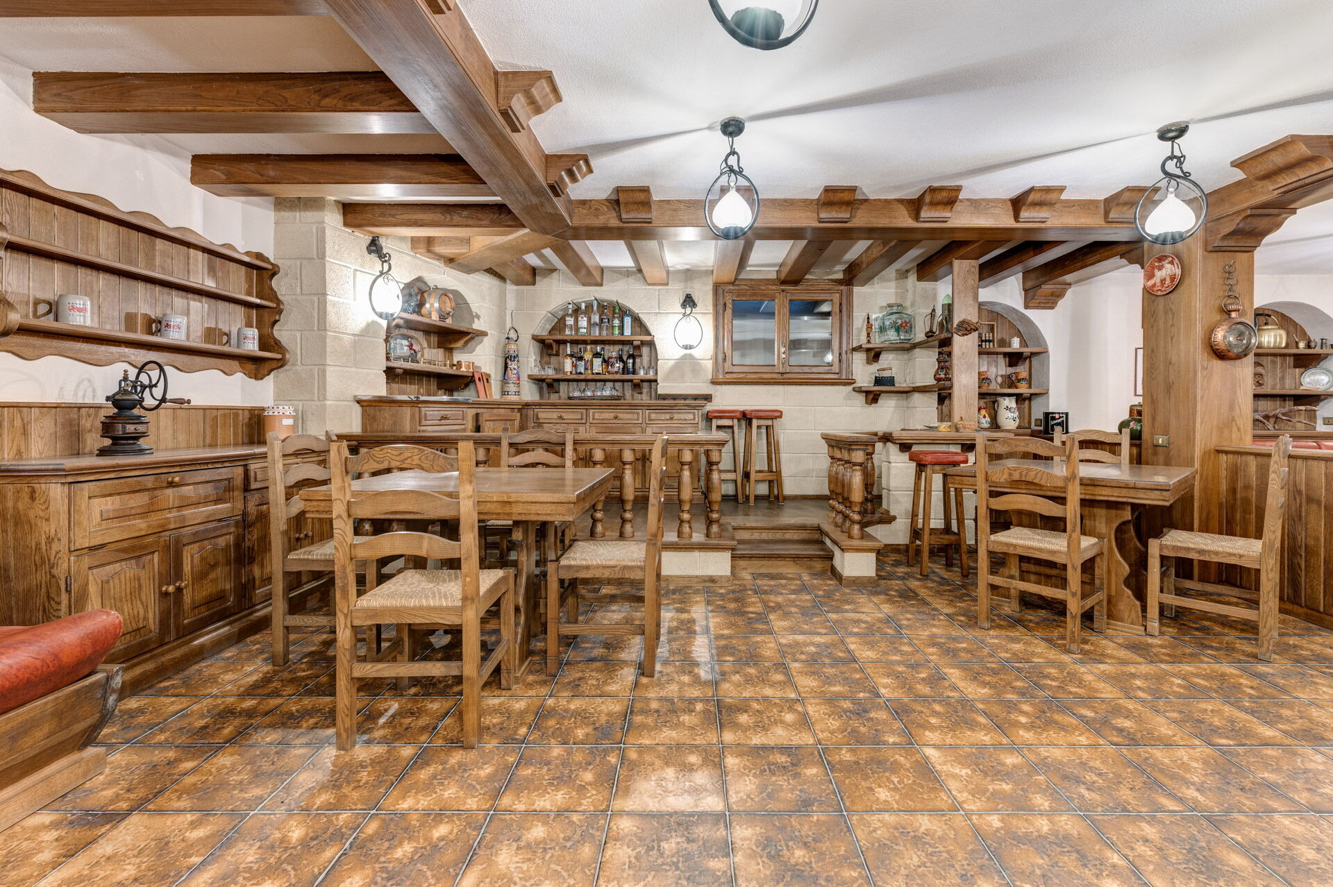 Sous-sol: zone bien-être, salle de gymnastique, taverne avec salle à manger, salle billard.