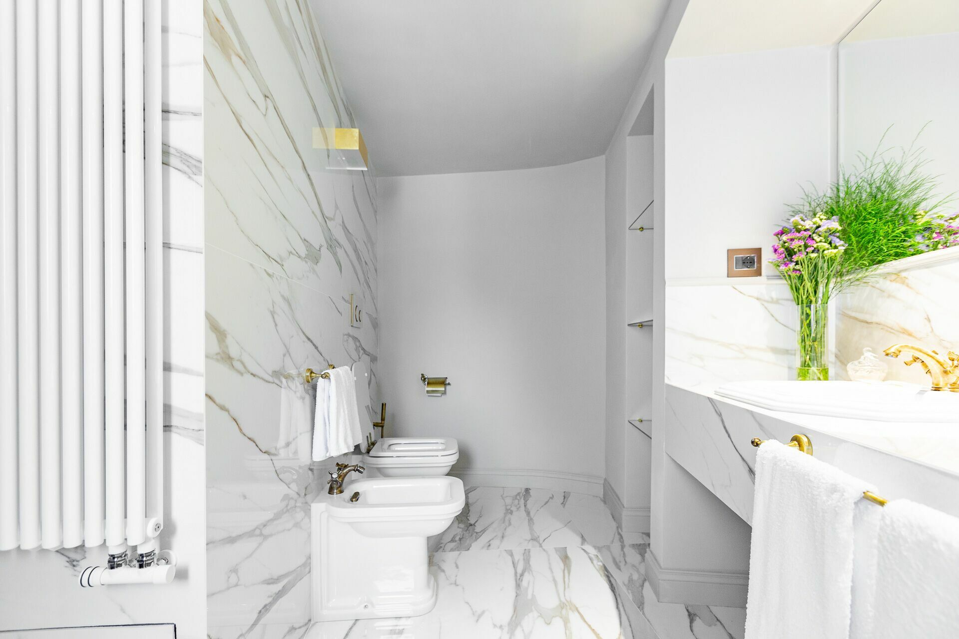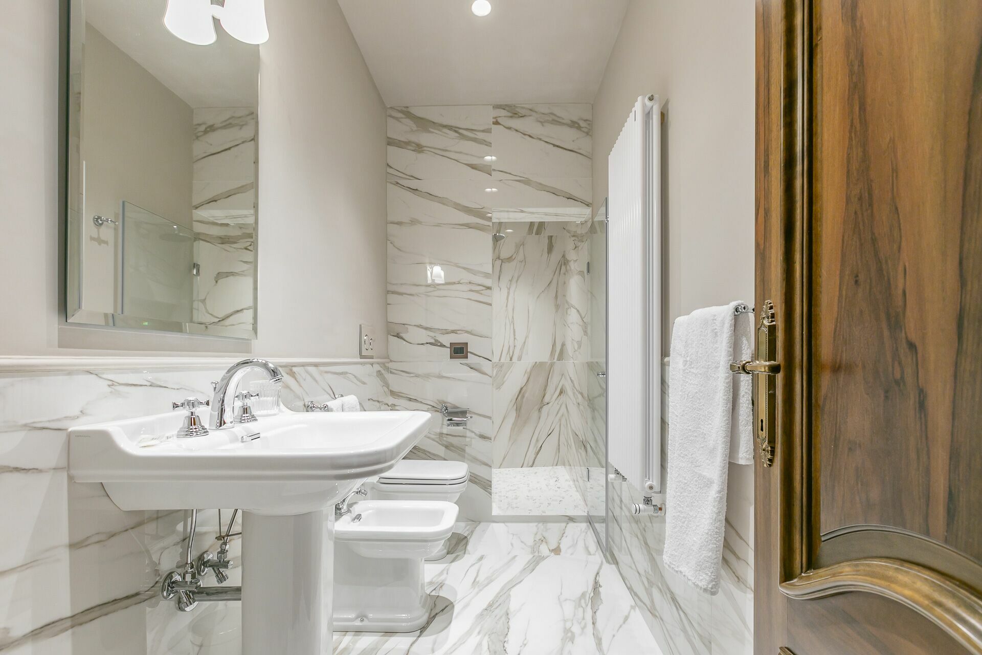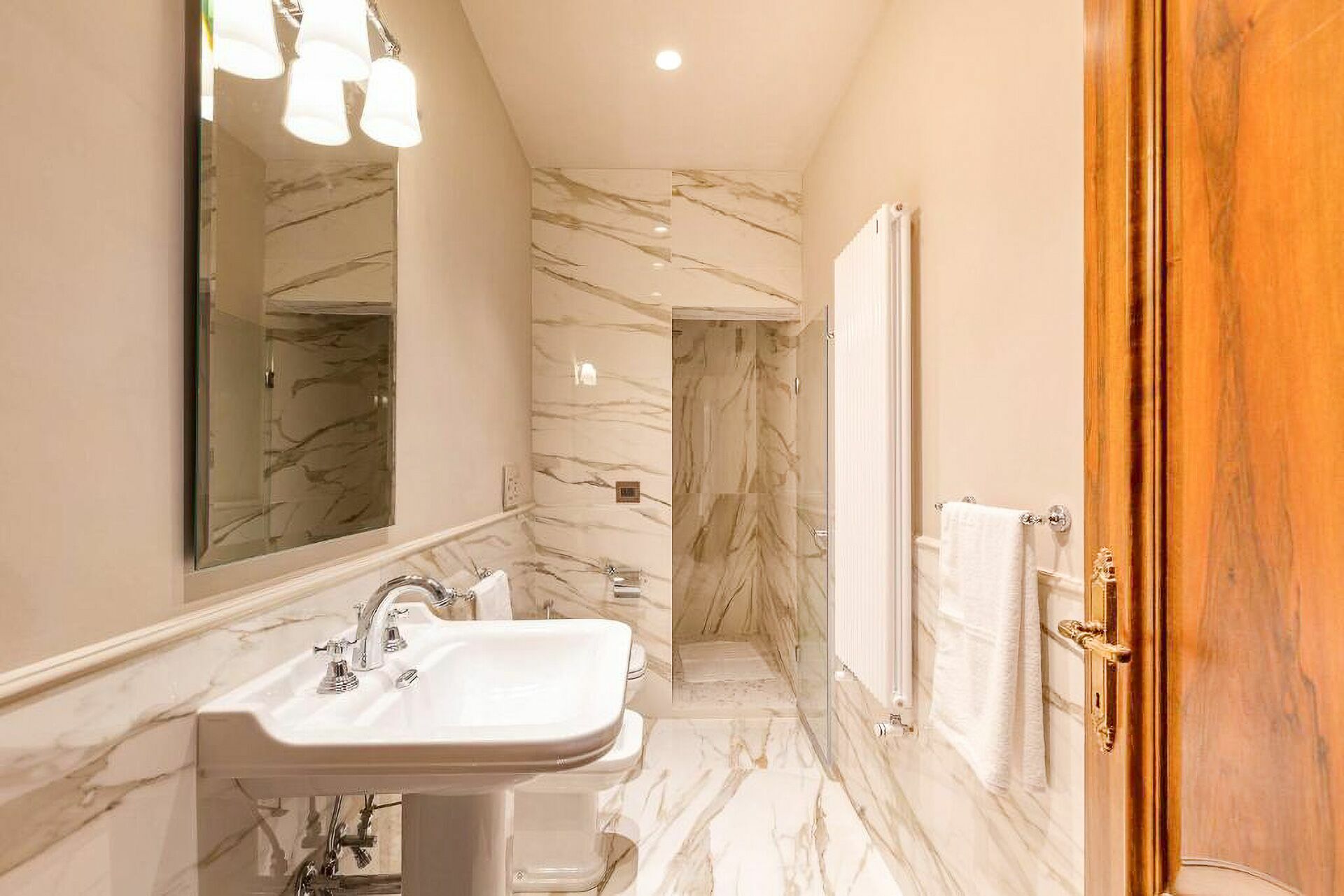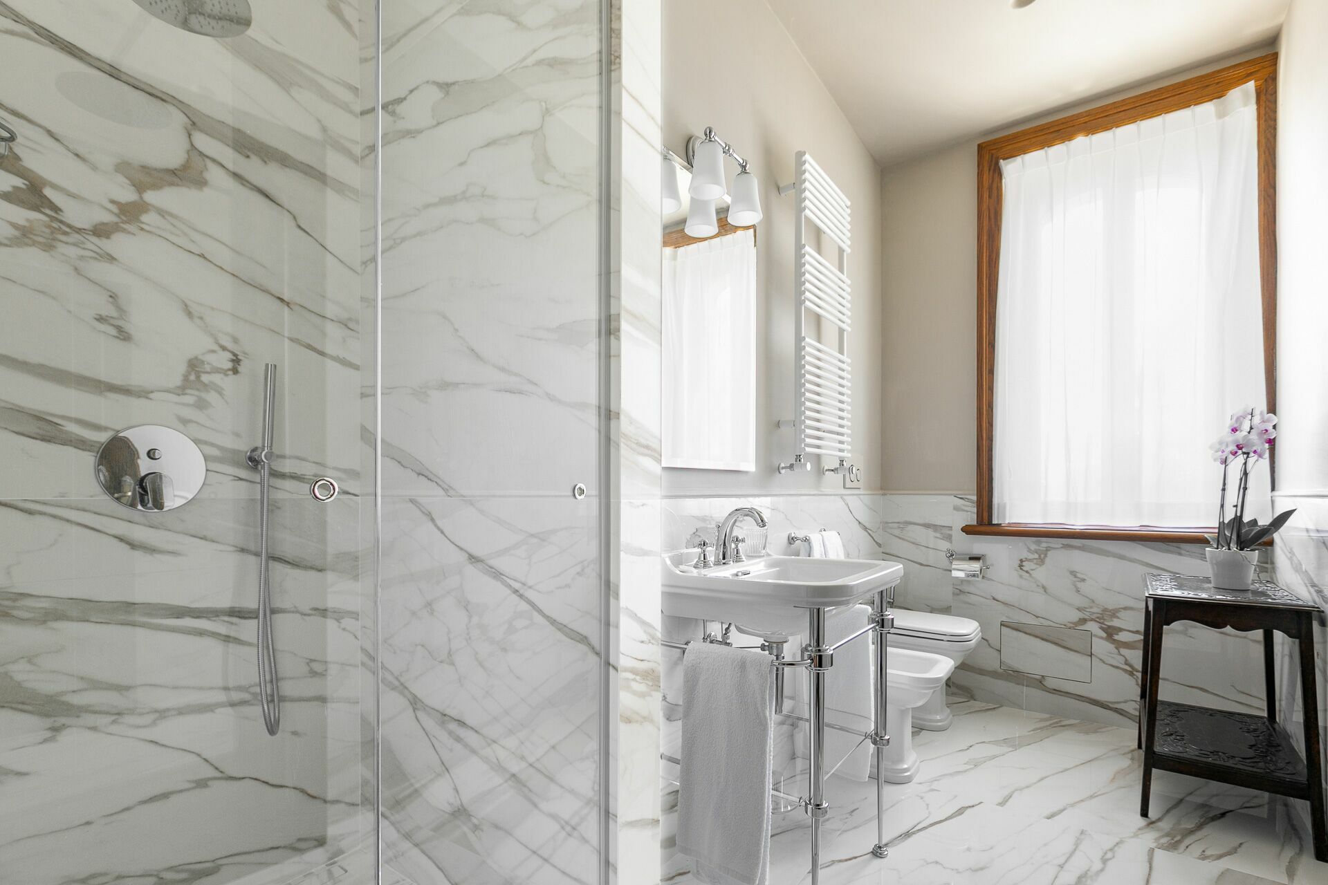 Deuxième étage: une chambre double (lit super king size) avec salle de bains privée avec douche et accès à une terrasse privée.