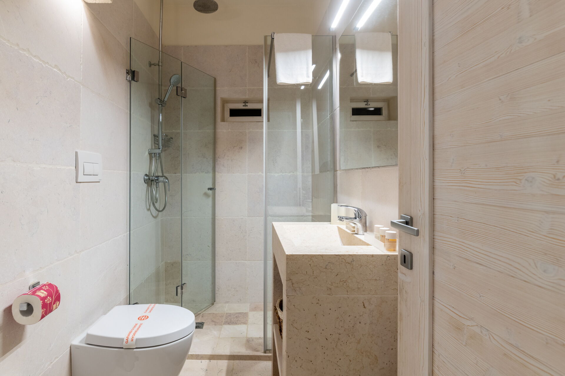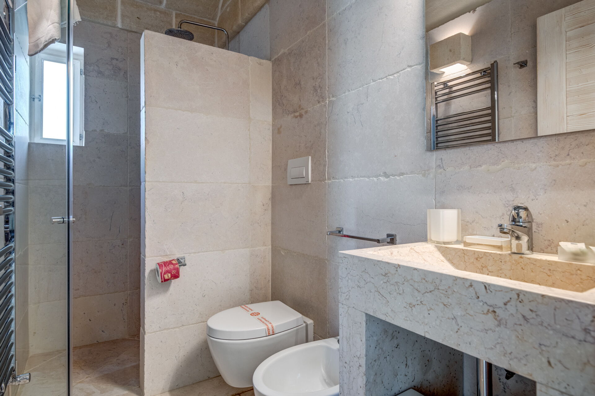 Étage inférieur (accès par un escalier extérieur): une chambre double avec air conditionné et salle de bains privée avec douche, pièce de service avec lave-linge.