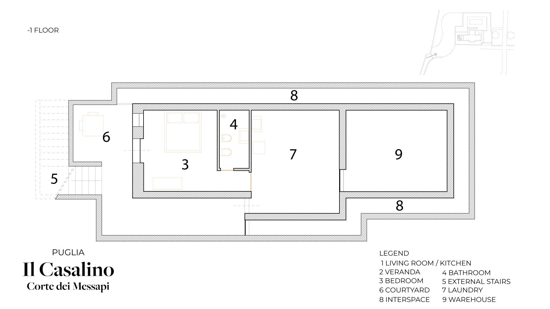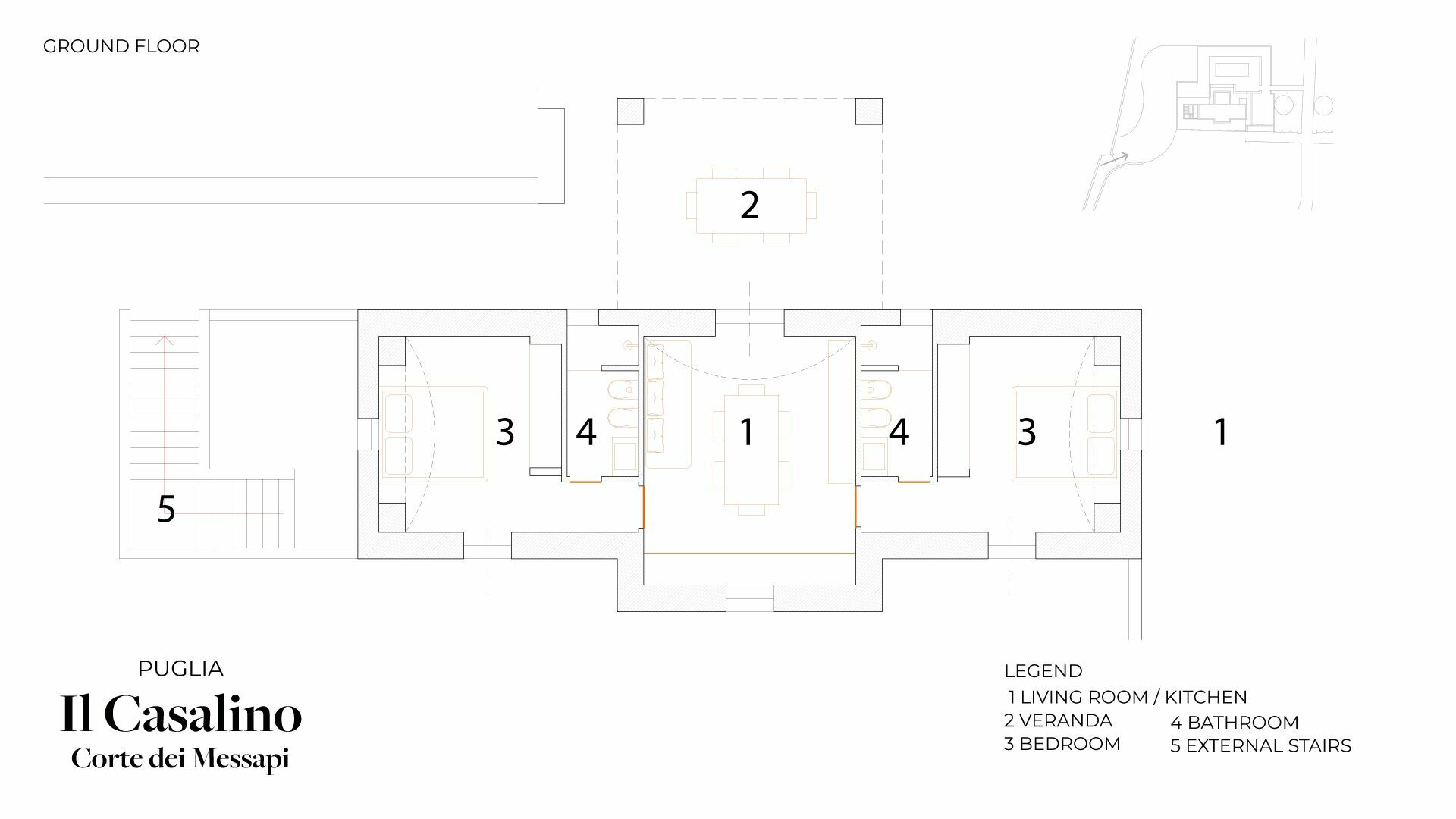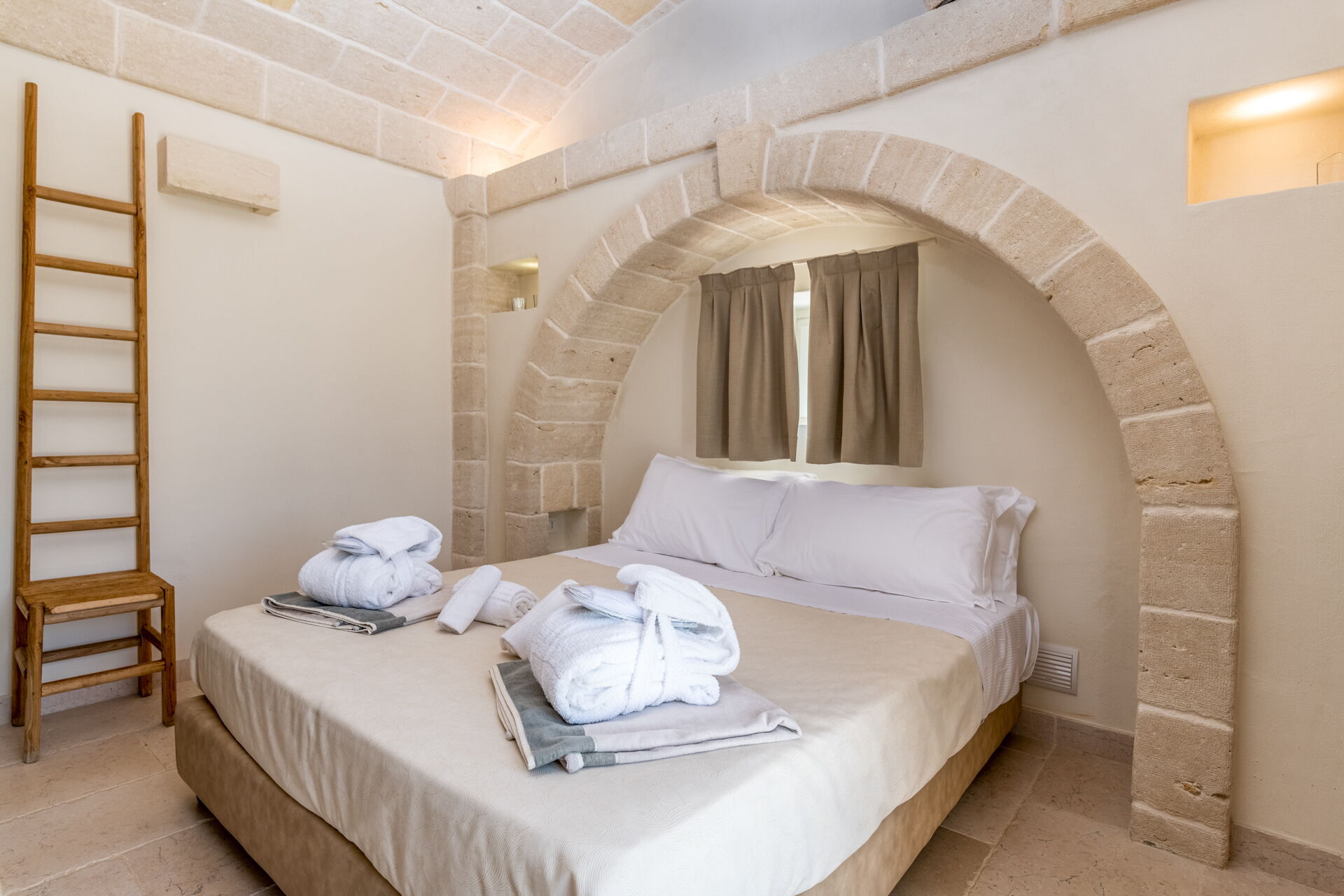 Casalino dei Messapi peut accueillir jusqu'à 6 personnes et se compose de deux chambres doubles au rez-de-chaussée et d'une troisième chambre double à l'étage inférieur (accessible uniquement de l’extérieur).