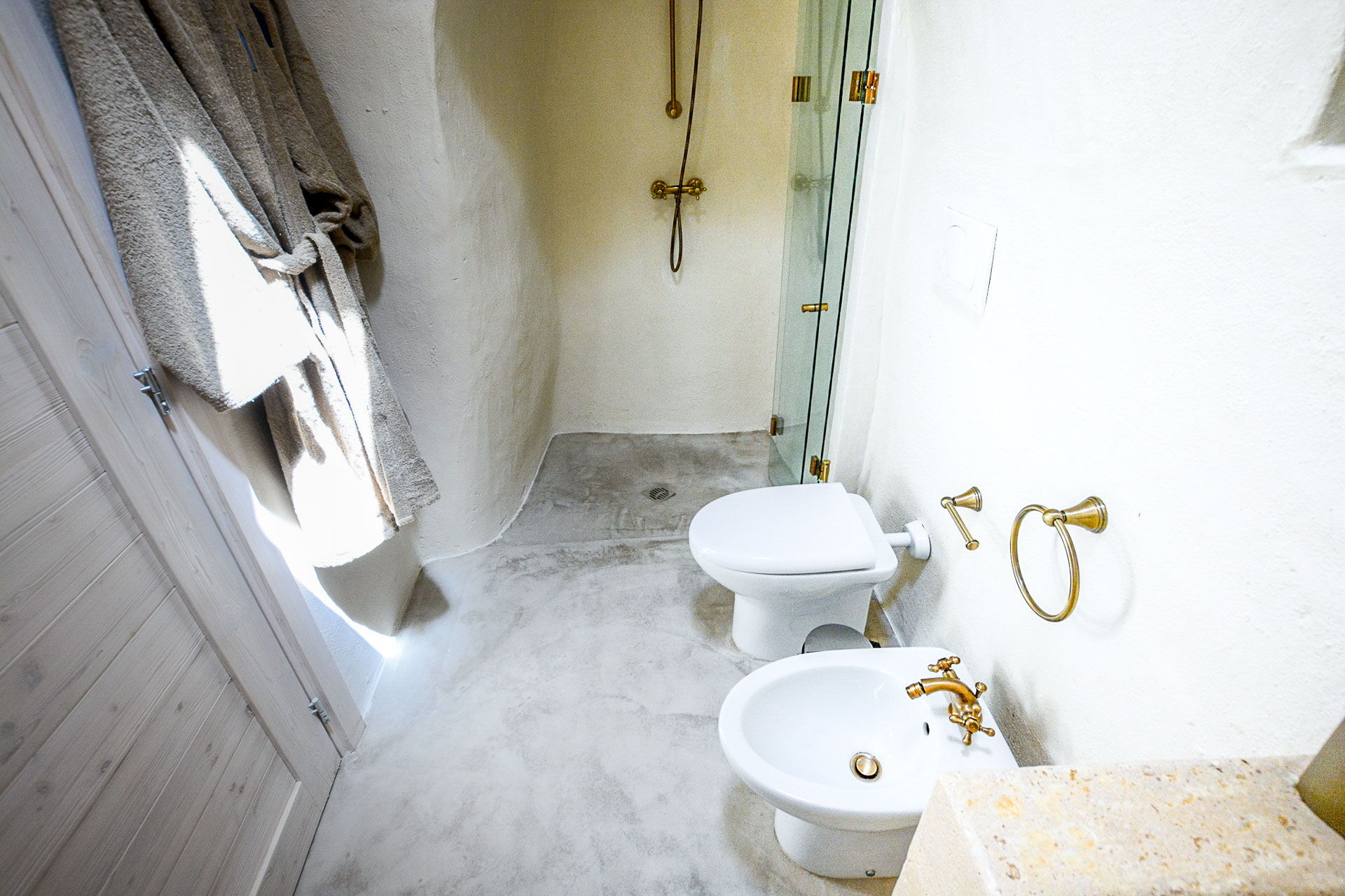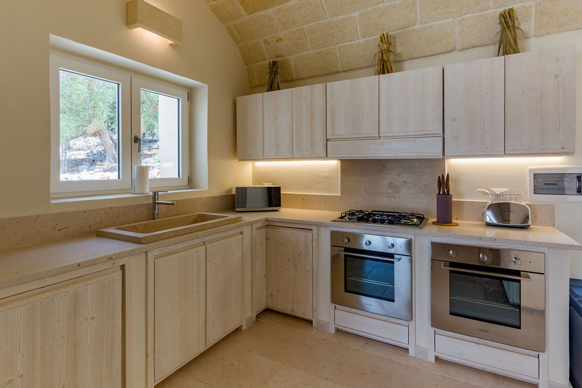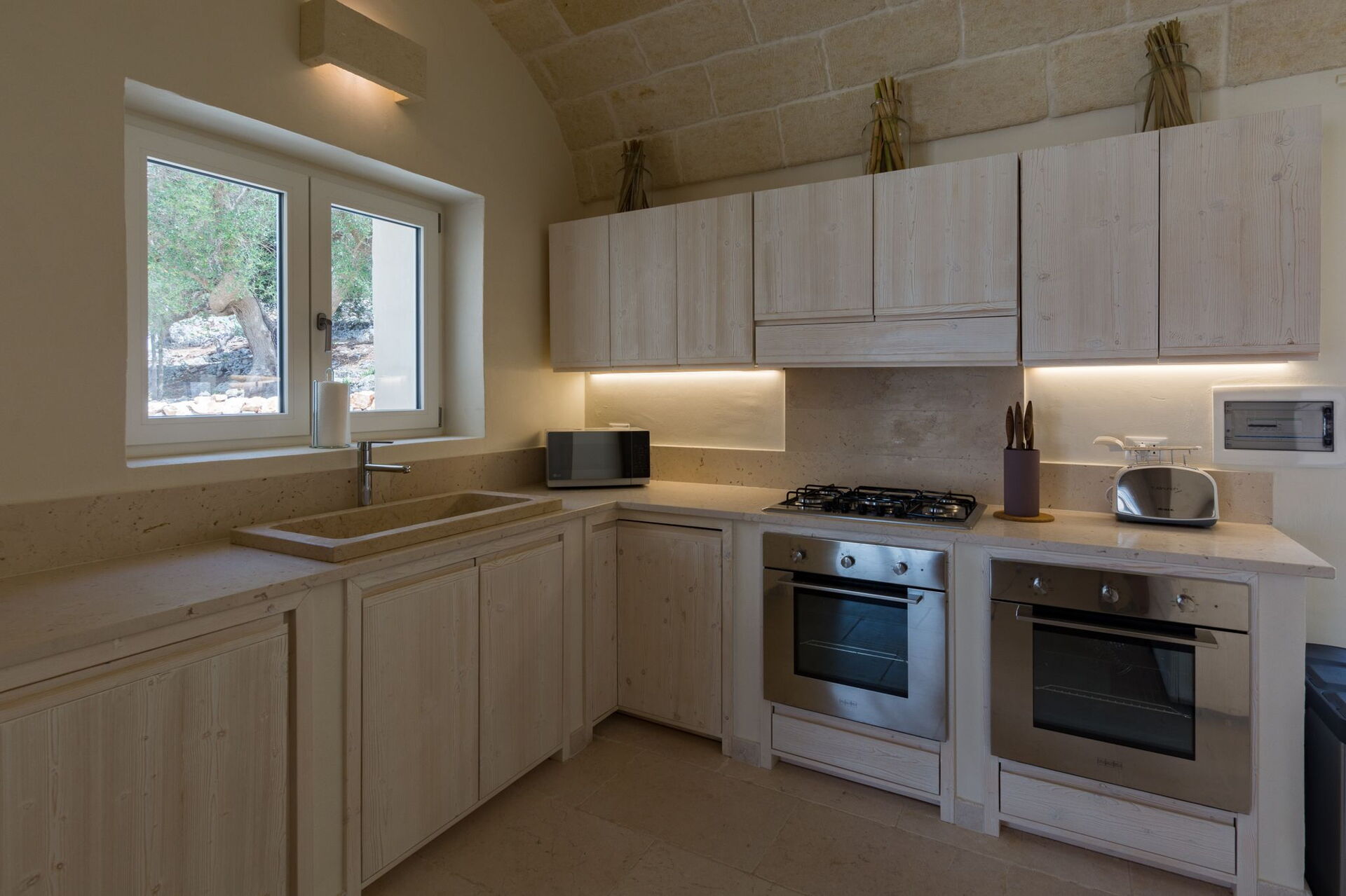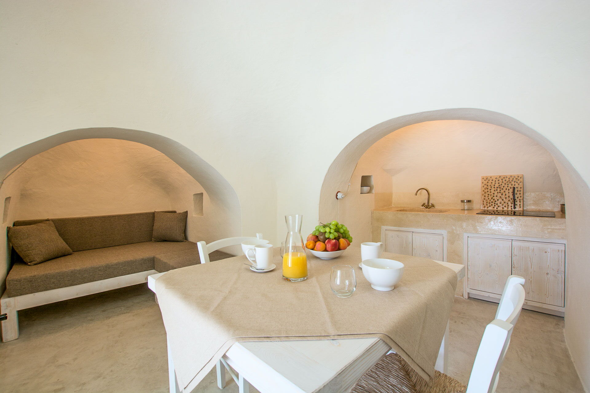 Dépendance (trullo sur demande): chambre double avec salle de bain privée et cuisine avec plaques de cuisson électriques. Salon avec table et chaises faites à la main.