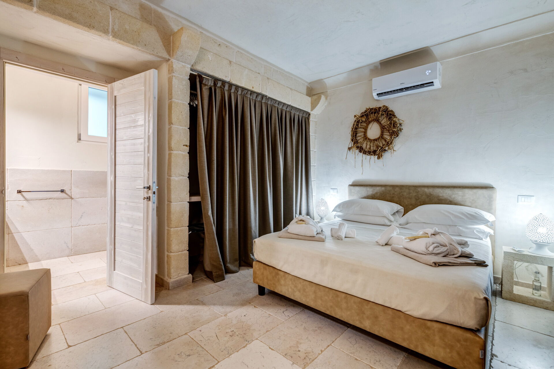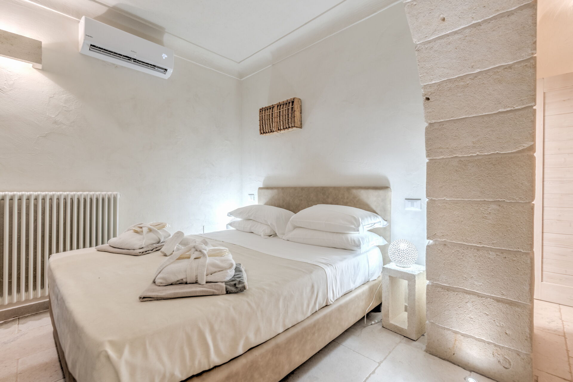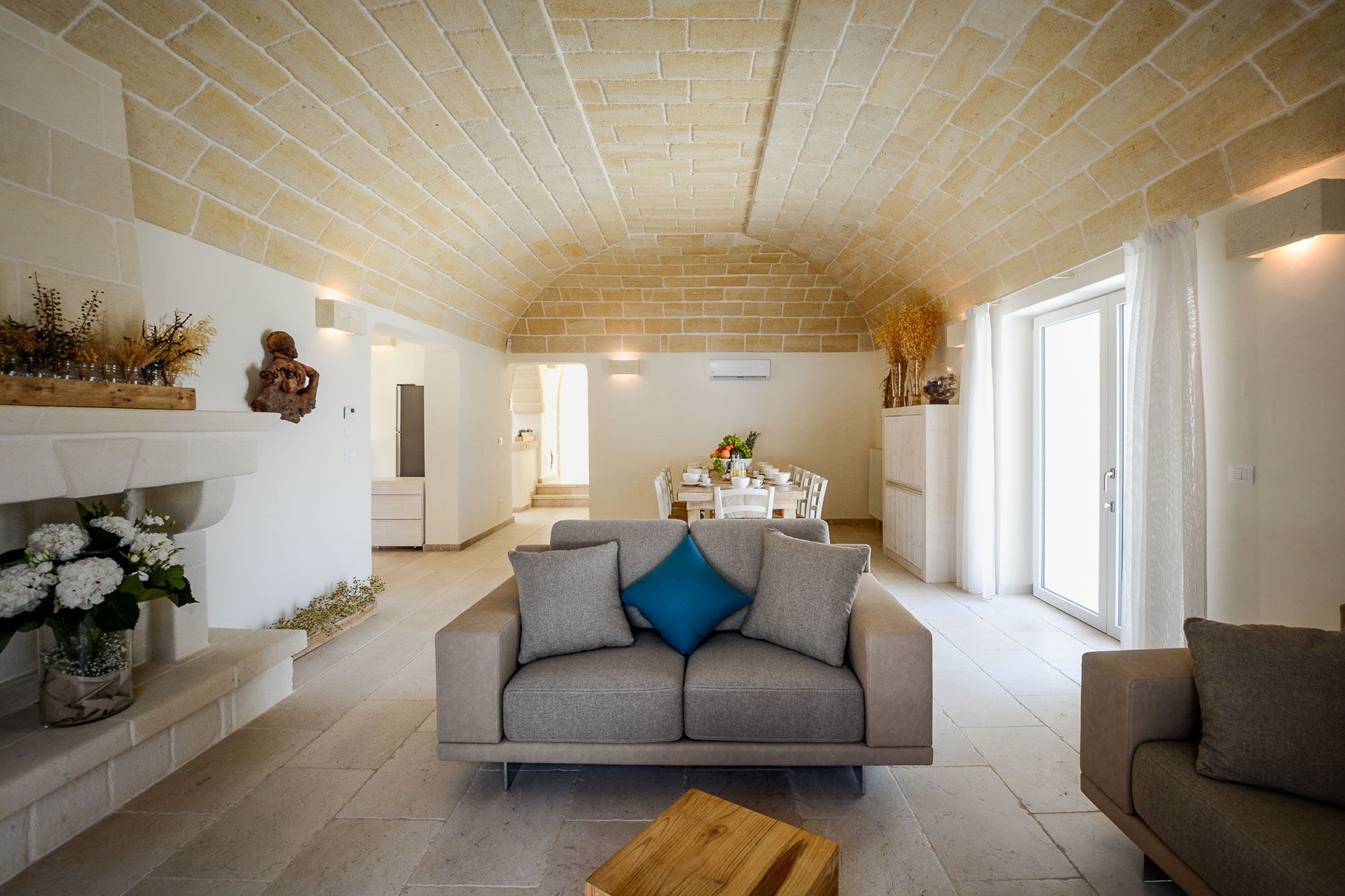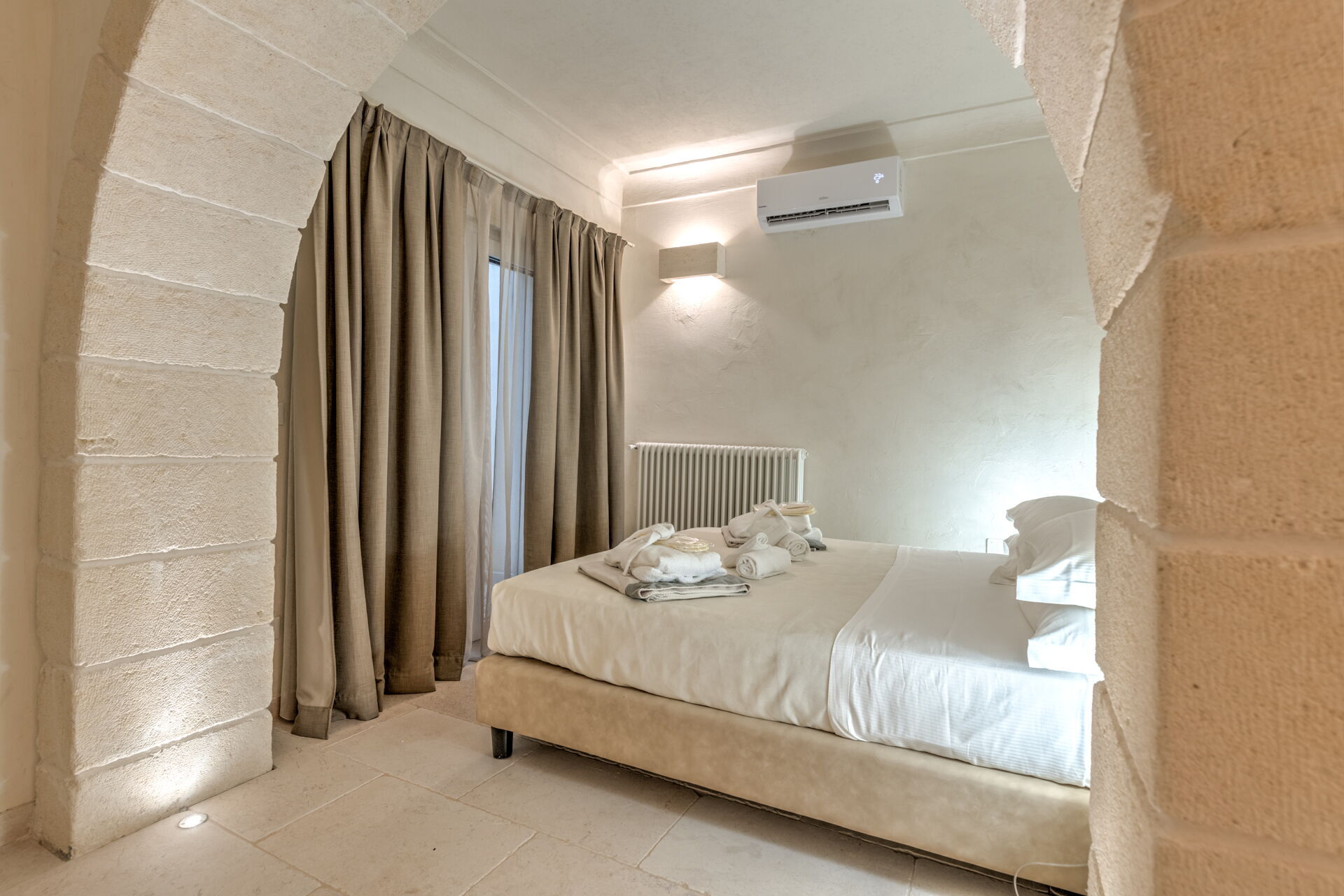 Grâce aux 7 chambres situées dans le corps principal de cette majestueuse villa ainsi qu’aux chambres situées dans les trulli en pierre adjacents, la résidence Corte dei Messapi peut accueillir jusqu'à 16 personnes. Les intérieurs sont conçus dans le style typique des Pouilles: un mélange de pierres, d'arches, de couleurs douces et de mobilier artisanal permettra aux hôtes de vivre une expérience inoubliable.