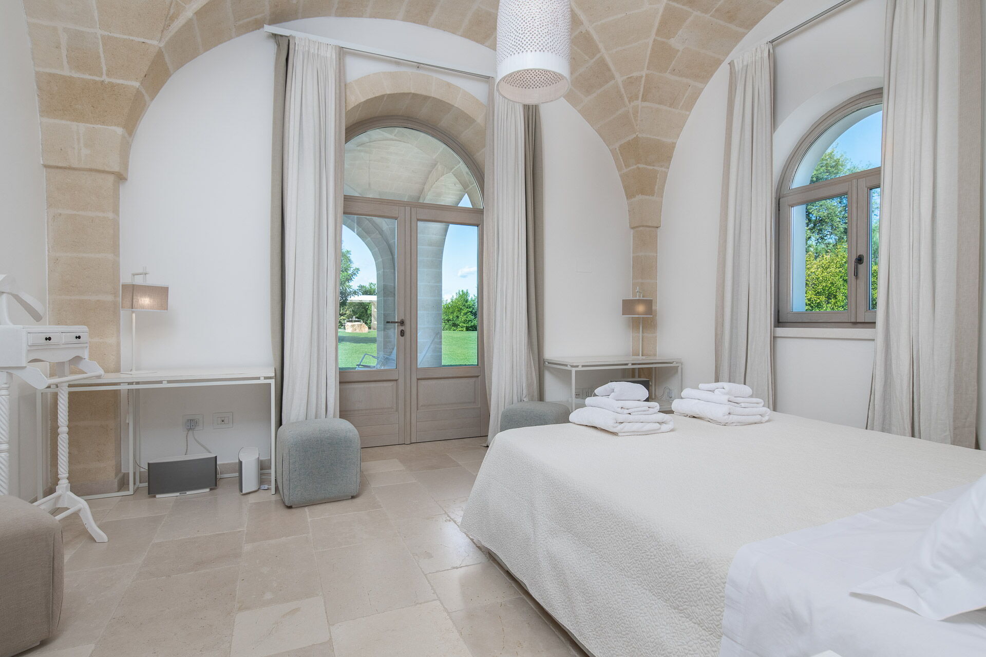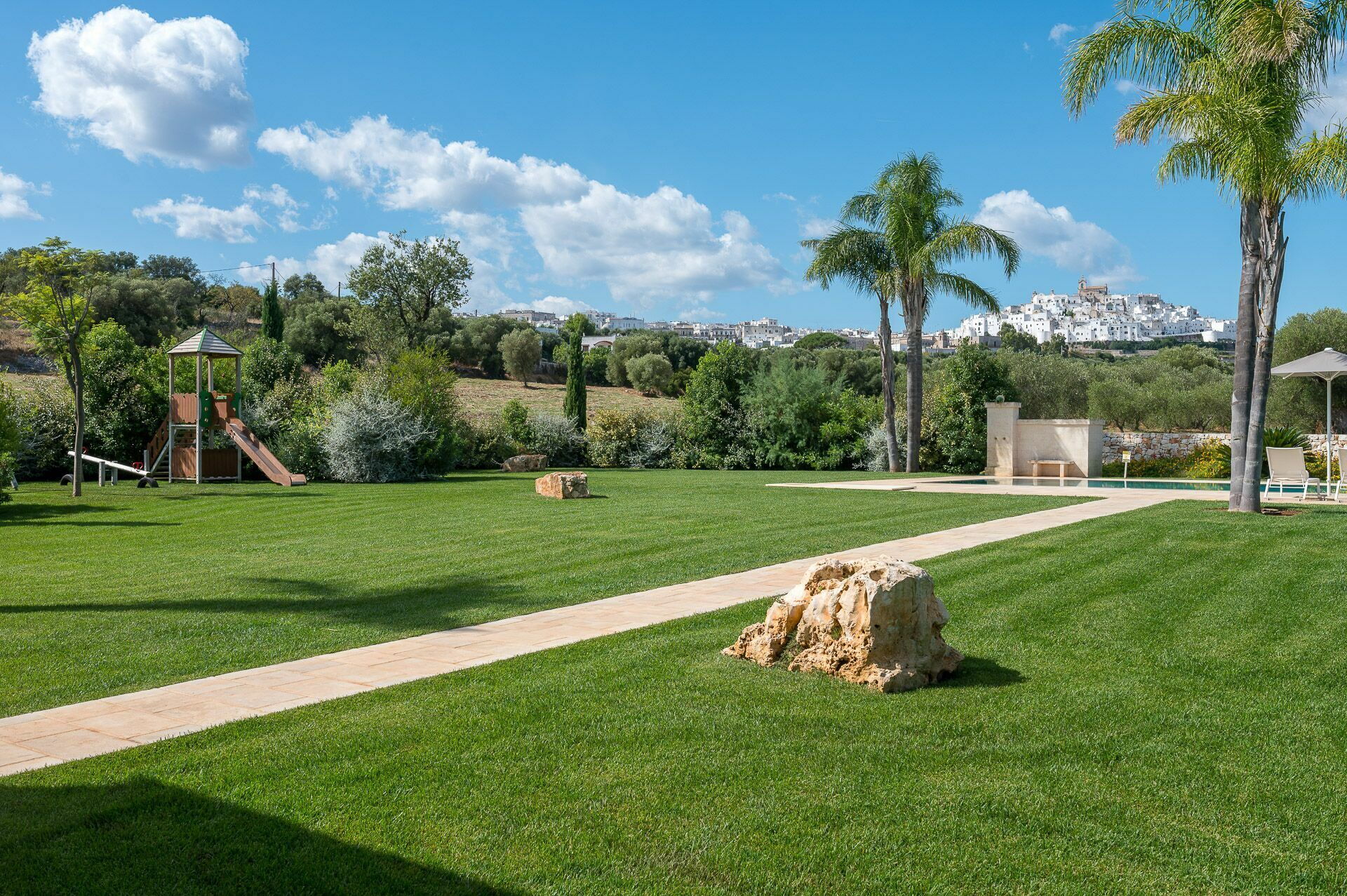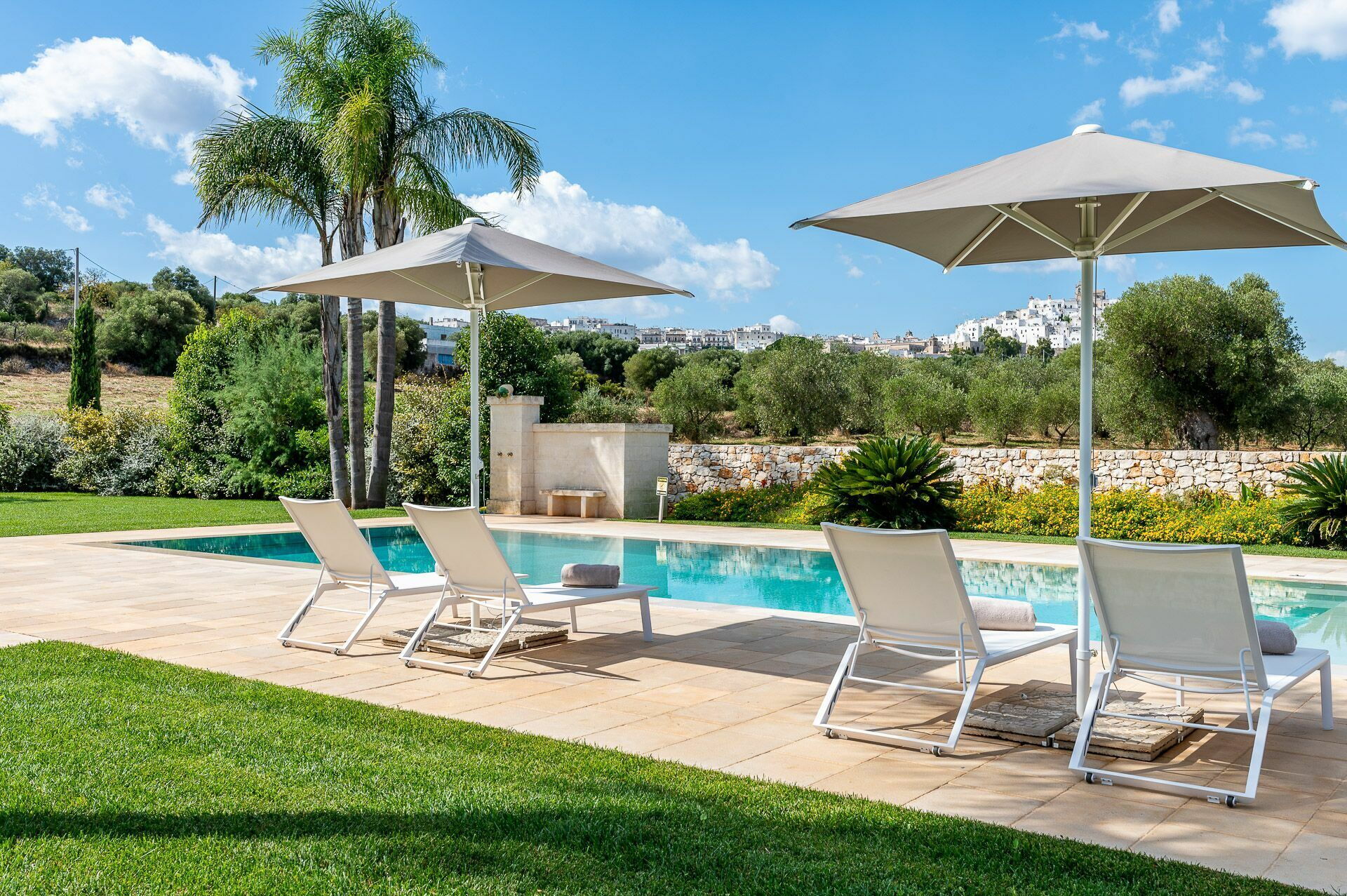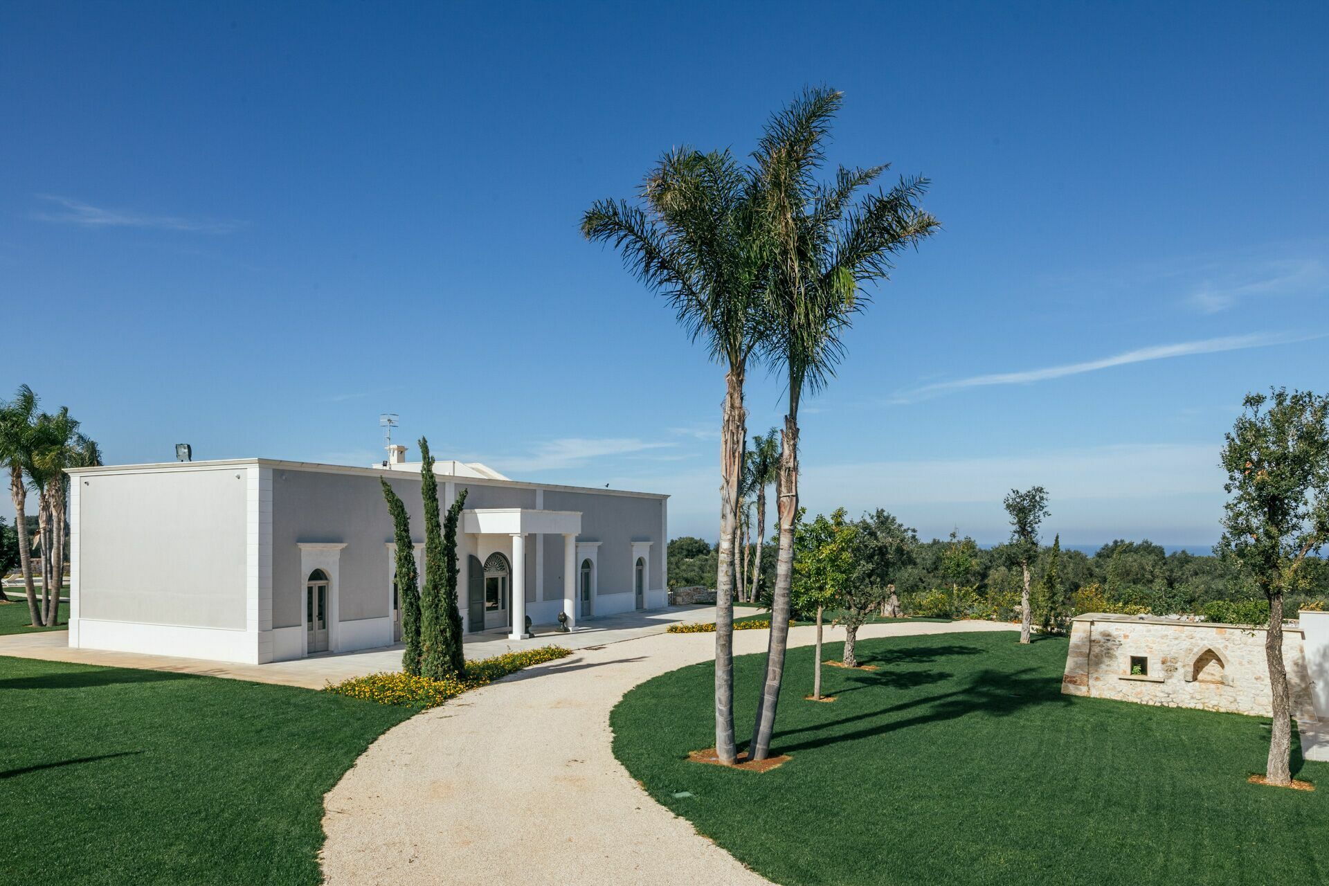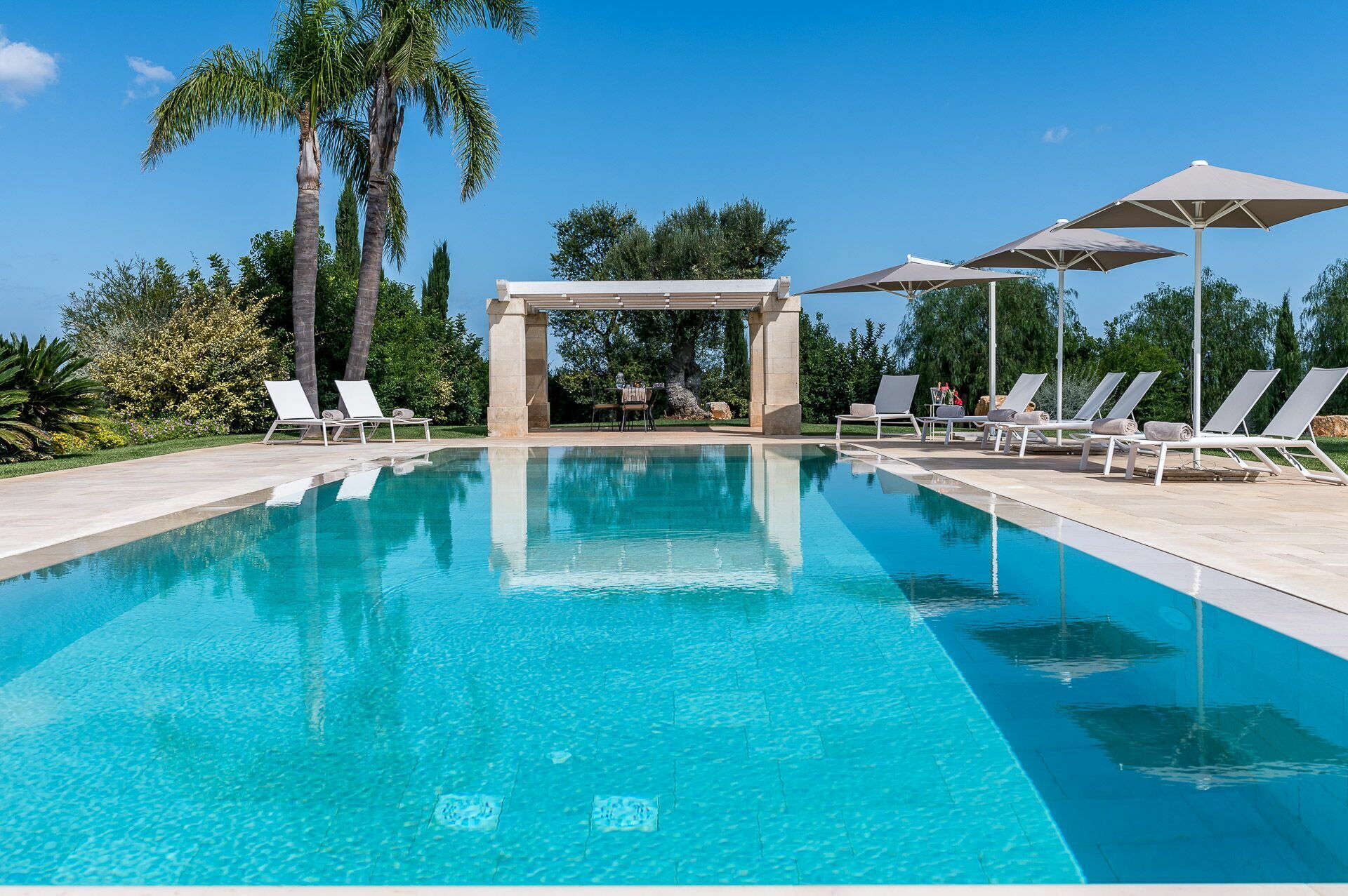 La décoration intérieure est très soignée et moderne, avec une attention particulière portée aux nuances et au style afin de mettre en valeur sa structure ancienne. La splendide propriété est entourée d’un gazon anglais soigné d'environ un hectare, délimitée par un mur de chaux typique. Dans le grand jardin se trouve l'élégante piscine (chauffable sur demande) avec des chaises longues et des parasols, qui communique avec la villa en location par une élégante allée en pierre.