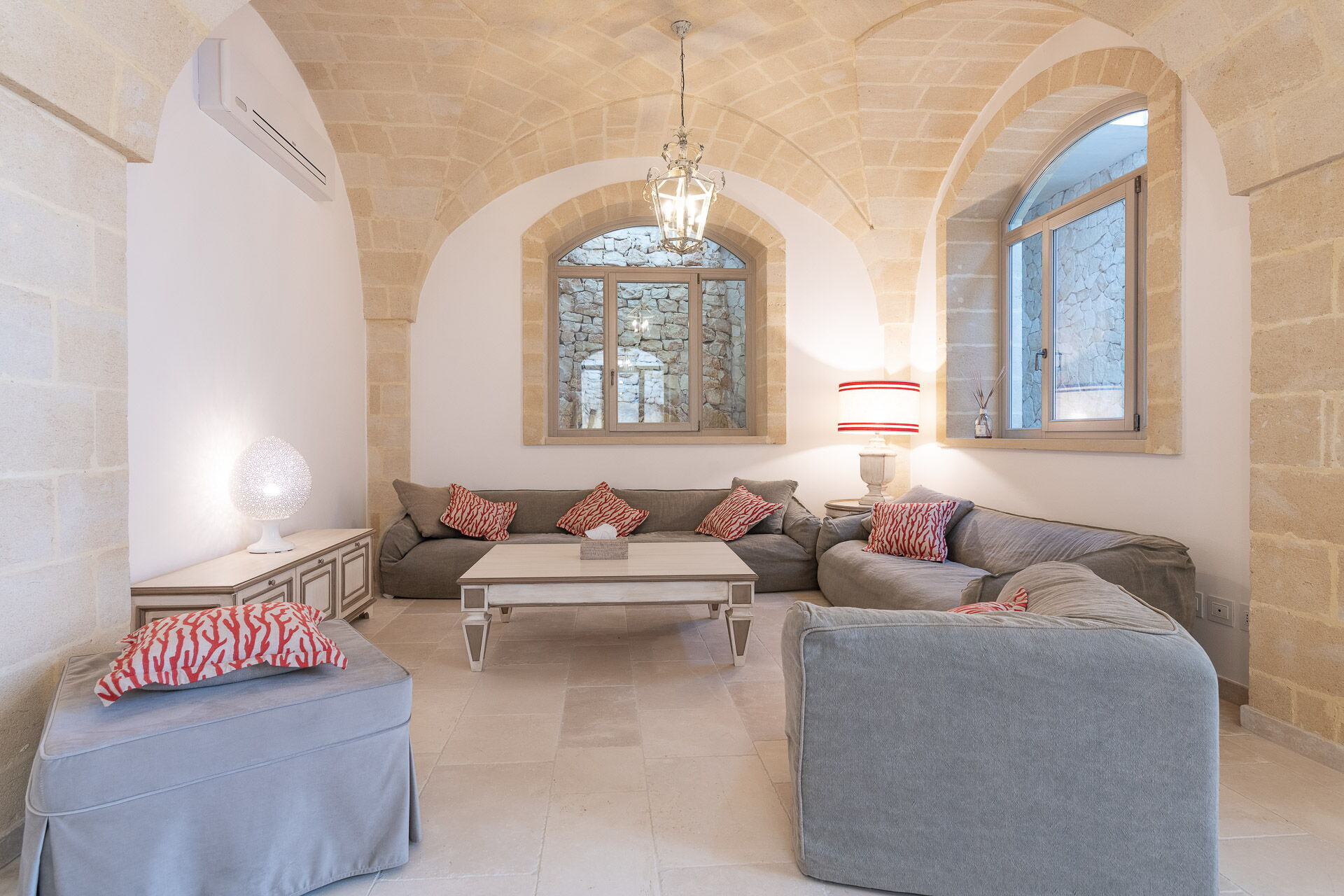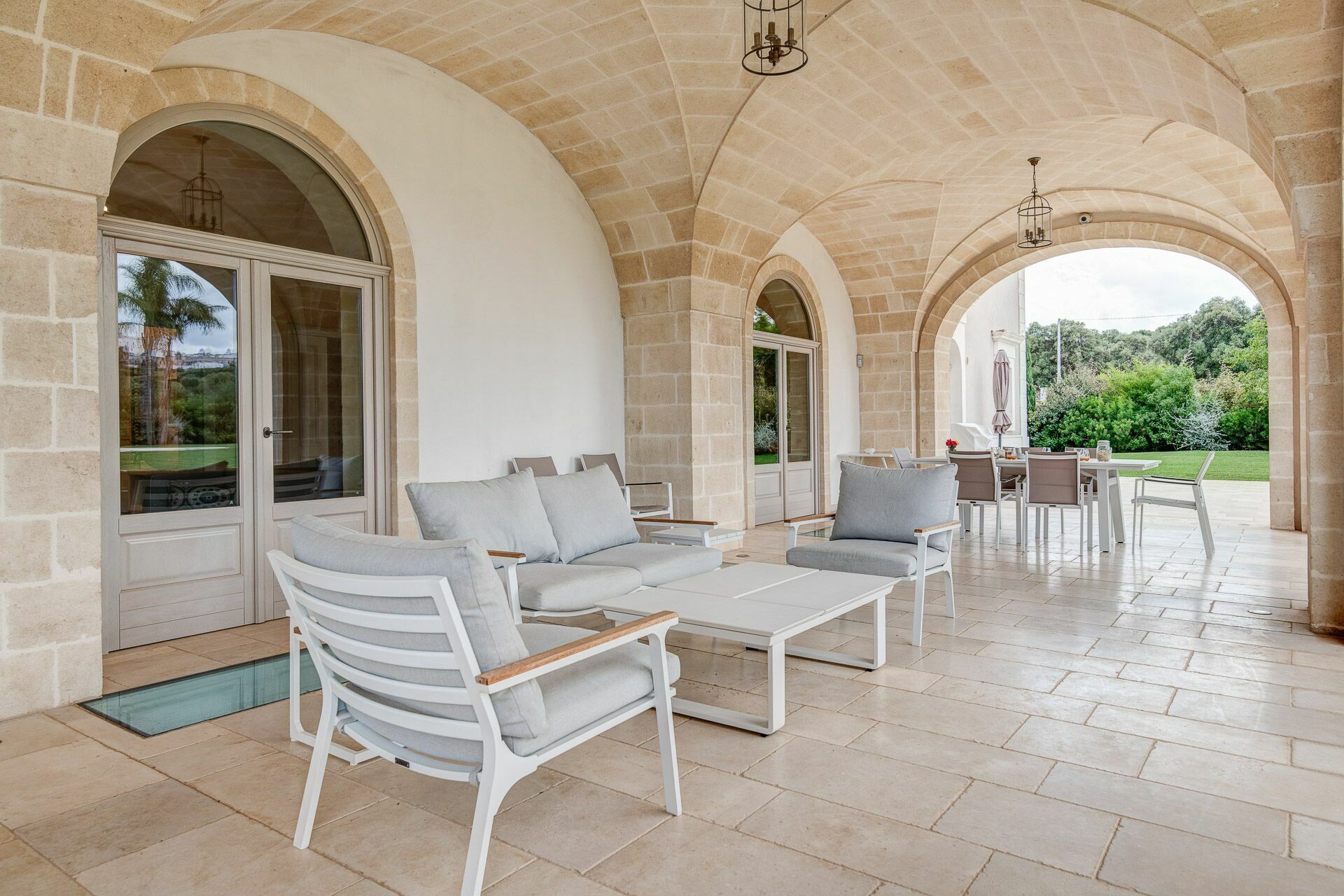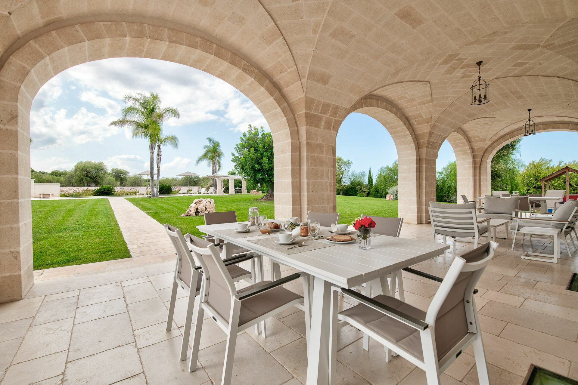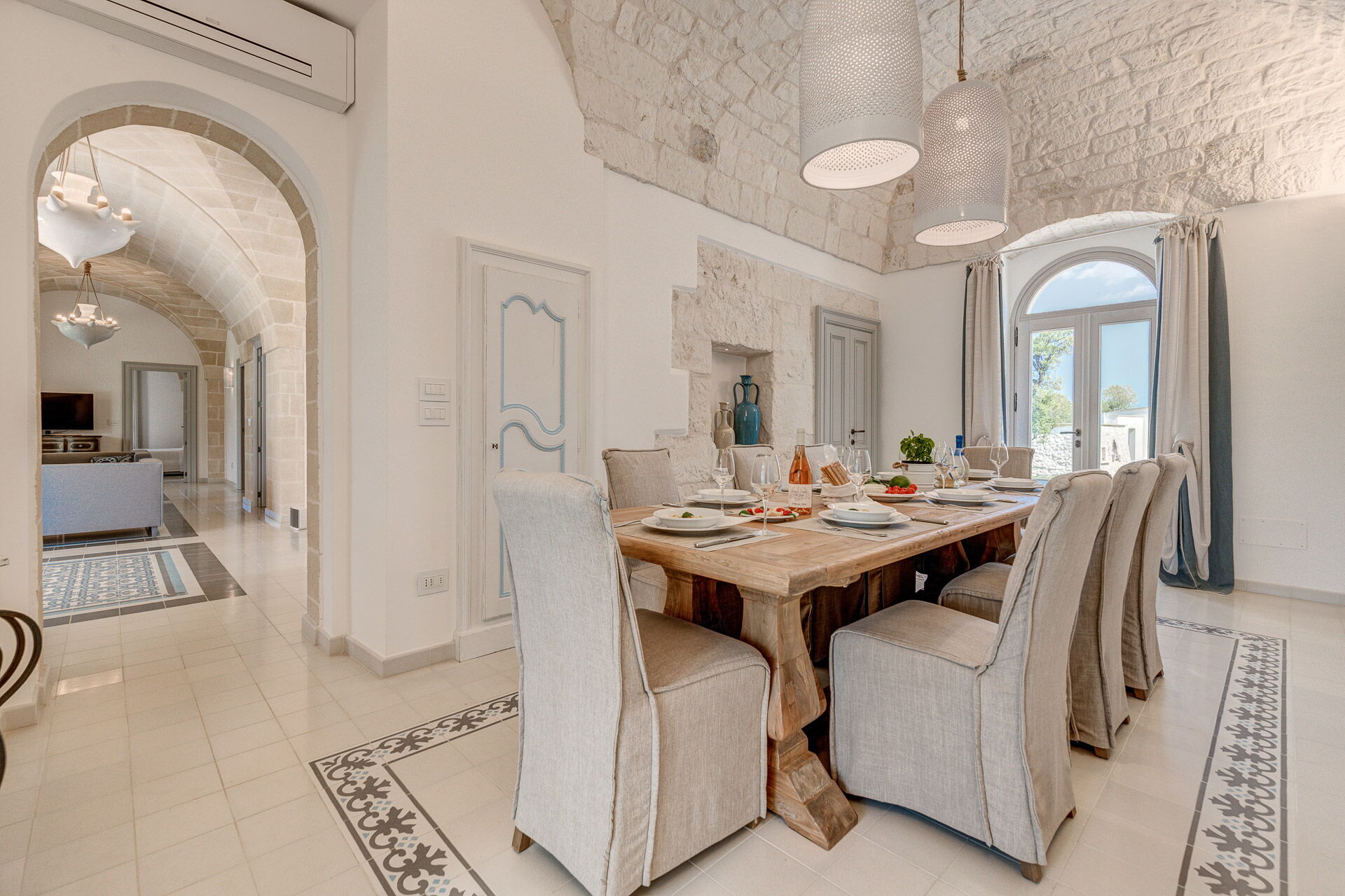 La décoration intérieure est très soignée et moderne, avec une attention particulière portée aux nuances et au style afin de mettre en valeur sa structure ancienne. La splendide propriété est entourée d’un gazon anglais soigné d'environ un hectare, délimitée par un mur de chaux typique. Dans le grand jardin se trouve l'élégante piscine (chauffable sur demande) avec des chaises longues et des parasols, qui communique avec la villa en location par une élégante allée en pierre.