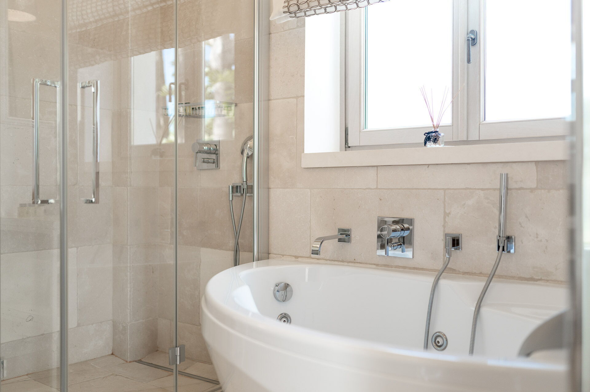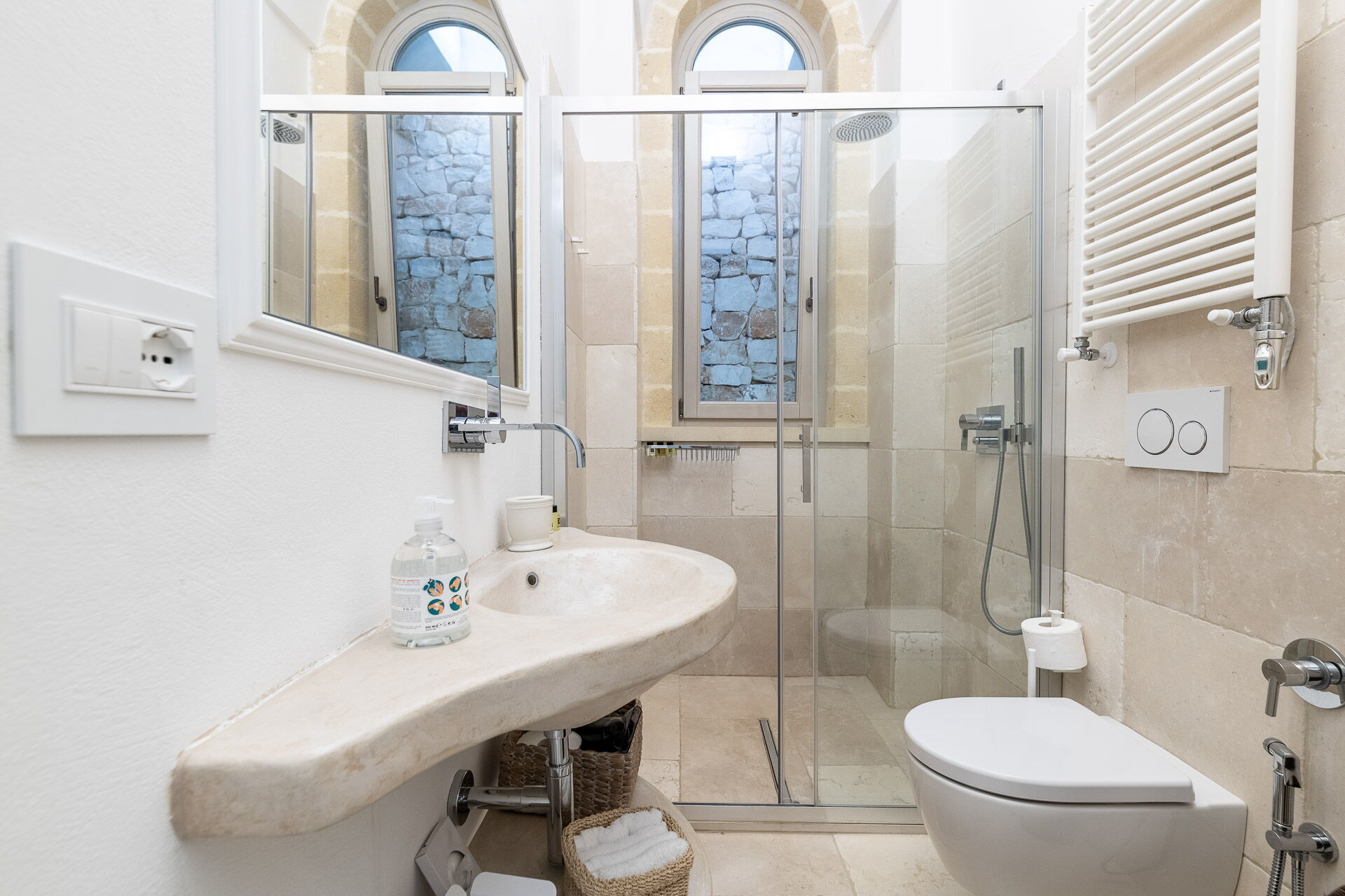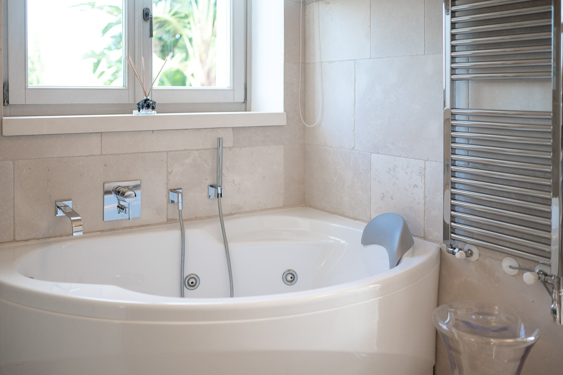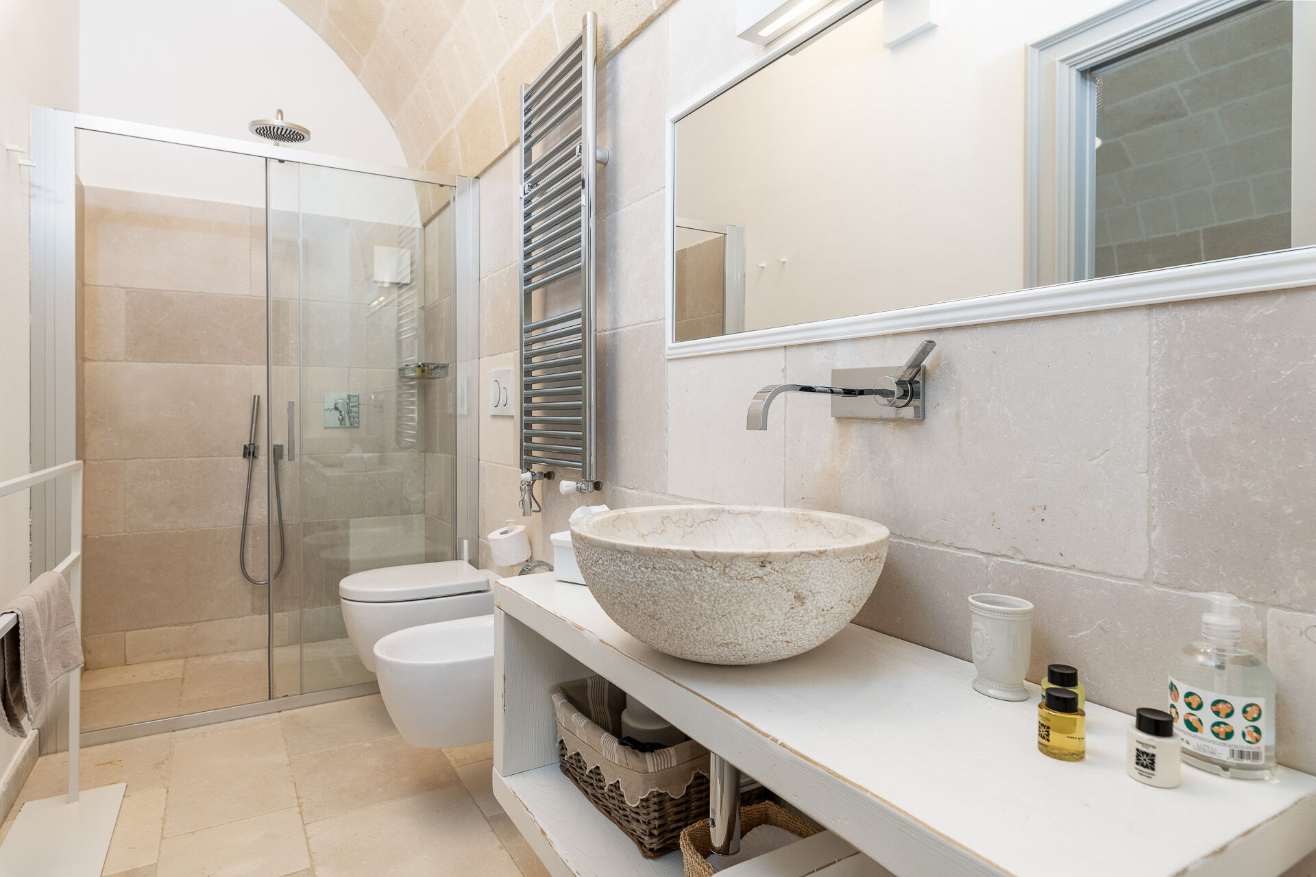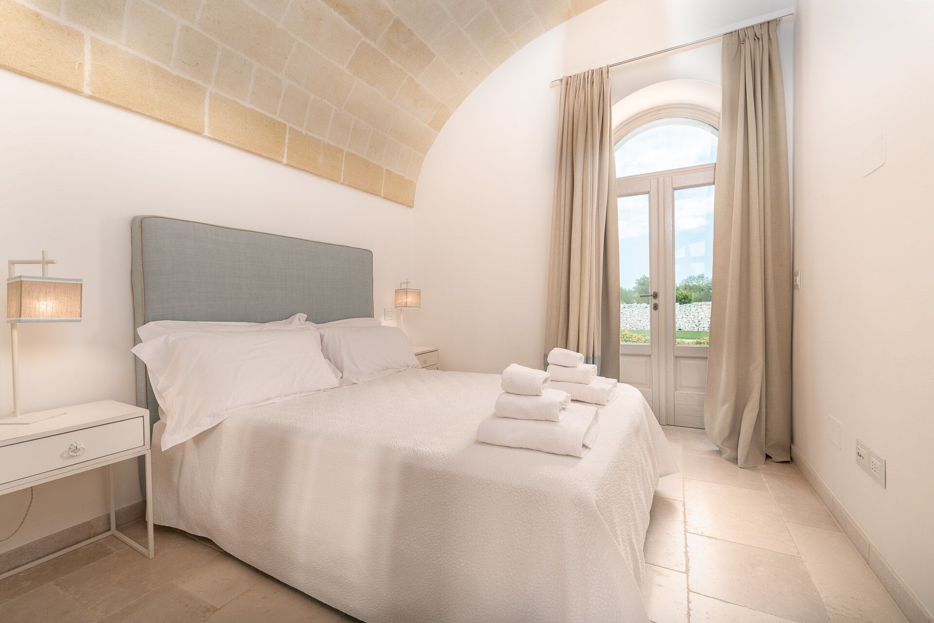La décoration intérieure est très soignée et moderne, avec une attention particulière portée aux nuances et au style afin de mettre en valeur sa structure ancienne. La splendide propriété est entourée d’un gazon anglais soigné d'environ un hectare, délimitée par un mur de chaux typique. Dans le grand jardin se trouve l'élégante piscine (chauffable sur demande) avec des chaises longues et des parasols, qui communique avec la villa en location par une élégante allée en pierre.